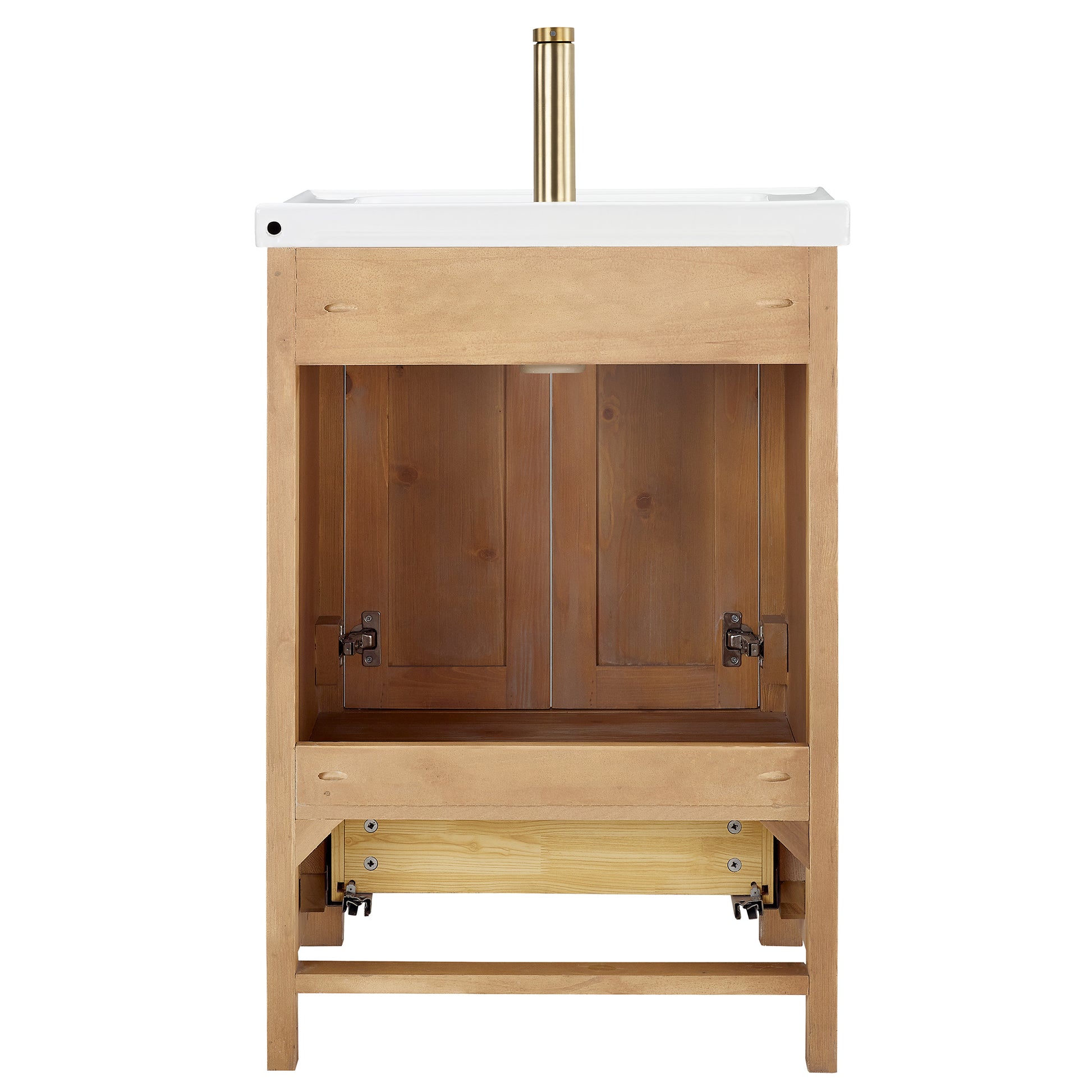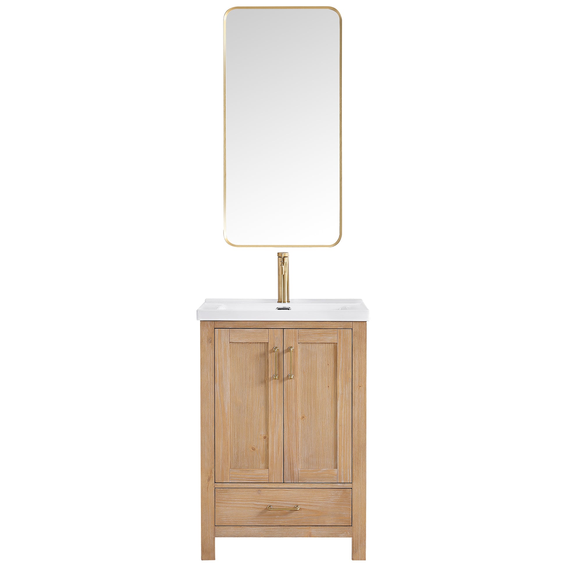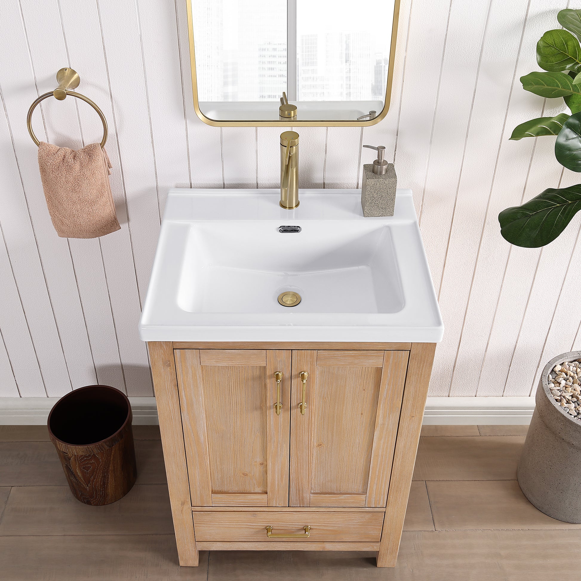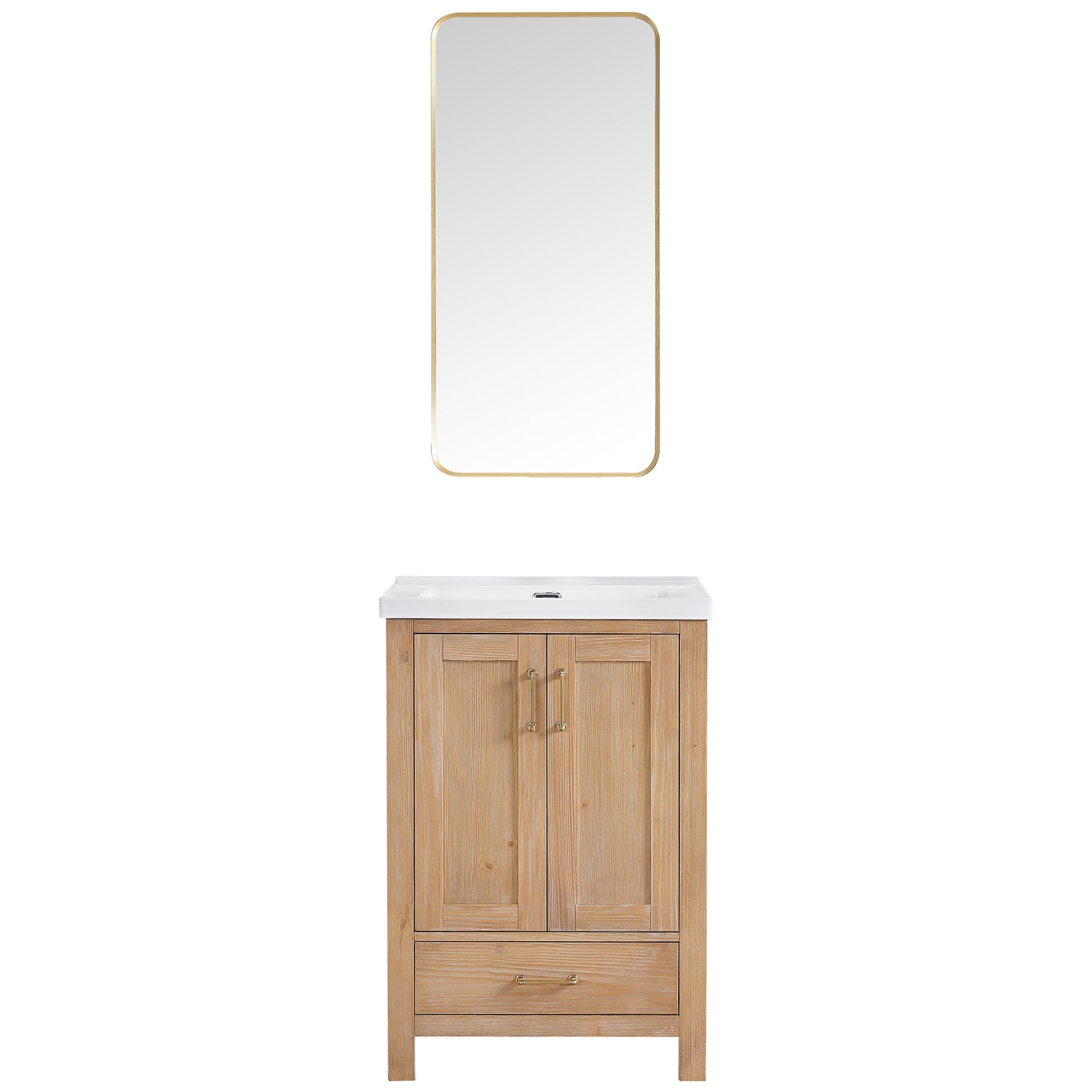 Vinnova, Gela 24" Single Sink Bath Vanity in Fir Wood Brown with Drop-In White Ceramic Basin and Mirror