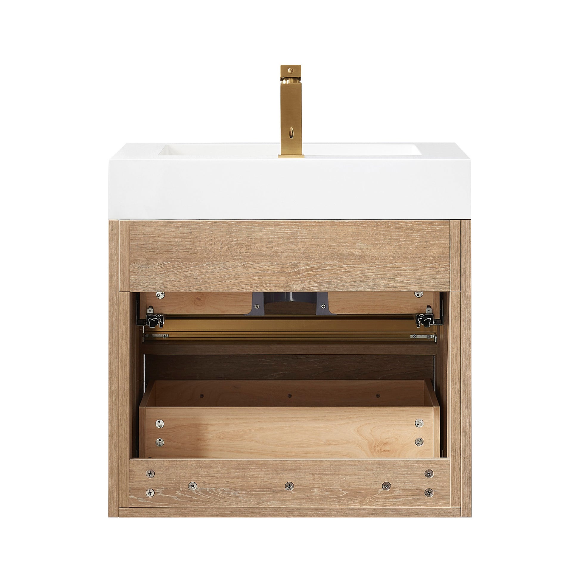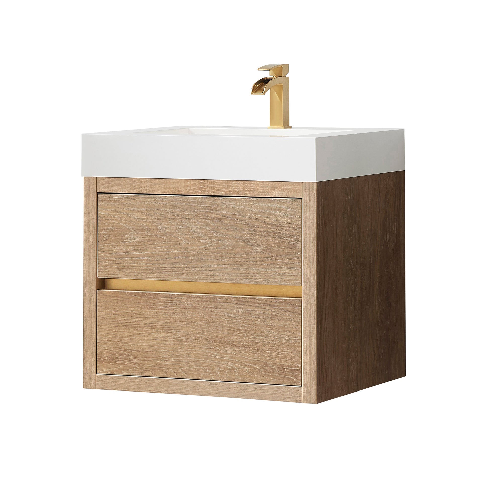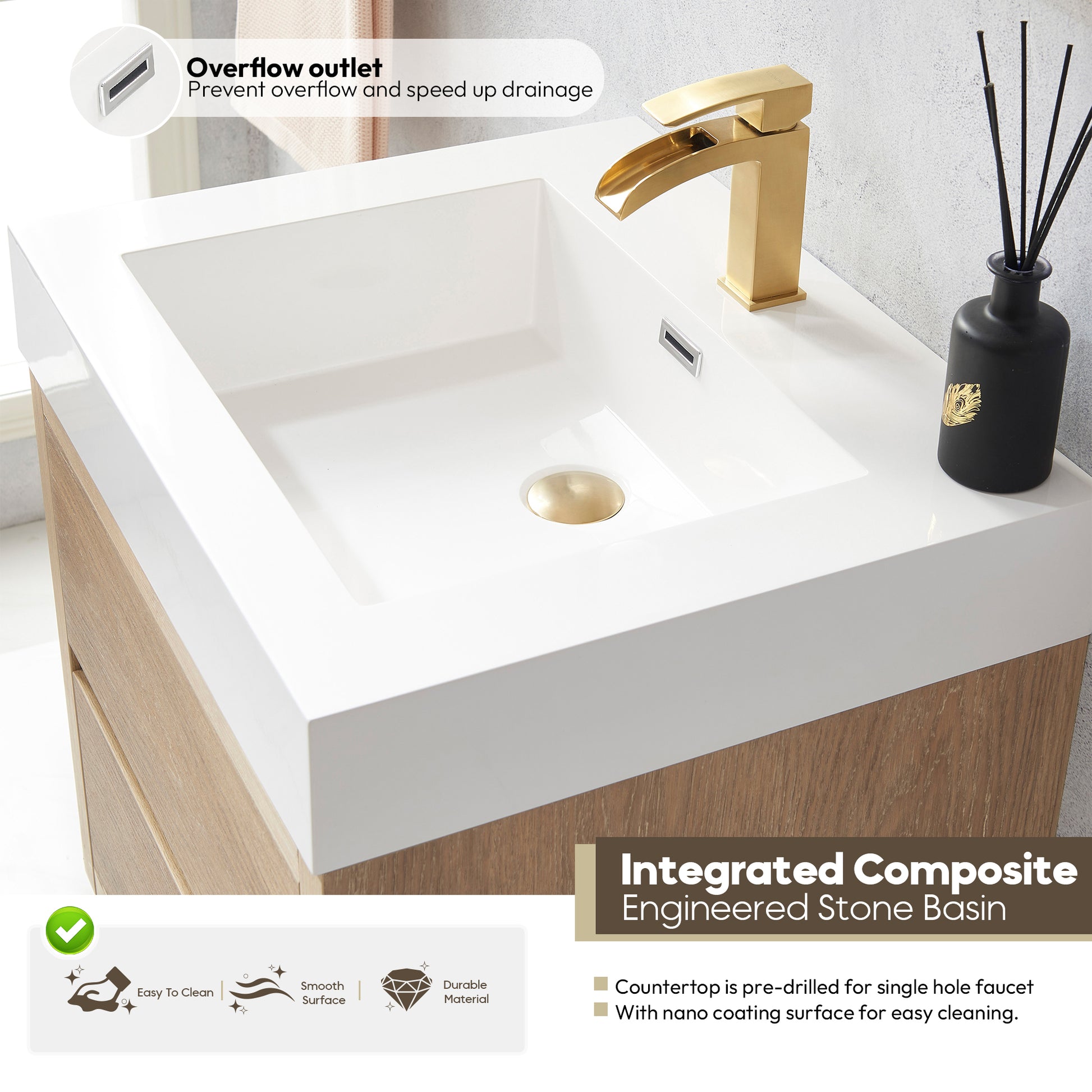 Vinnova, Palencia 24" Single Sink Wall-Mount Bath Vanity in North American Oak with White Composite Integral Square Sink Top
