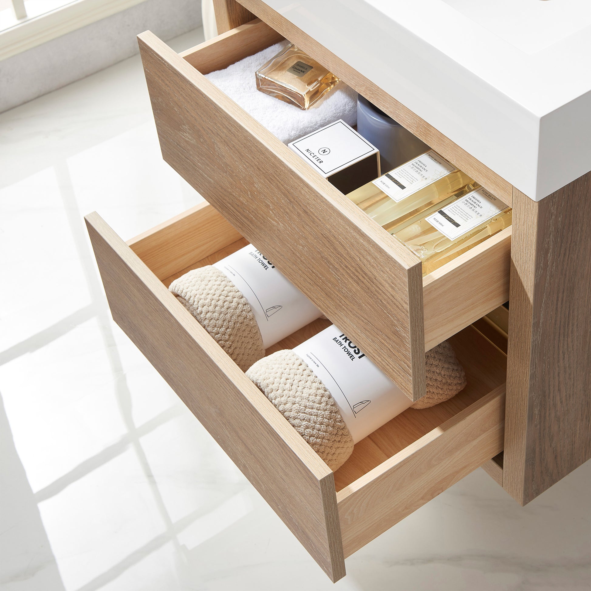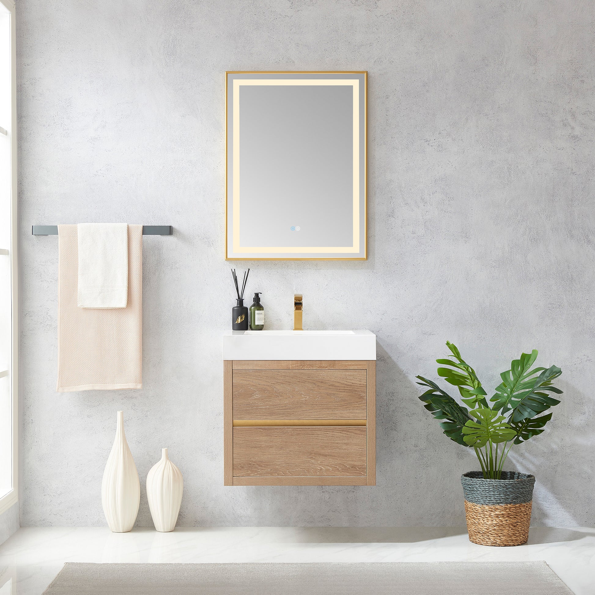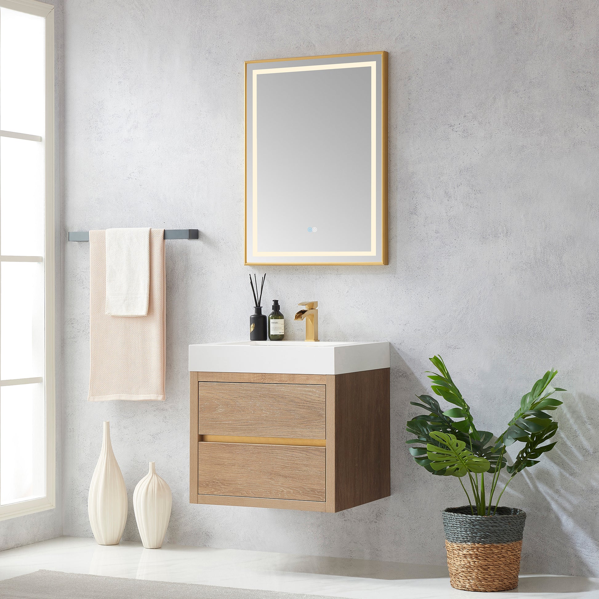 Vinnova, Palencia 24" Single Sink Wall-Mount Bath Vanity in North American Oak with White Composite Integral Square Sink Top