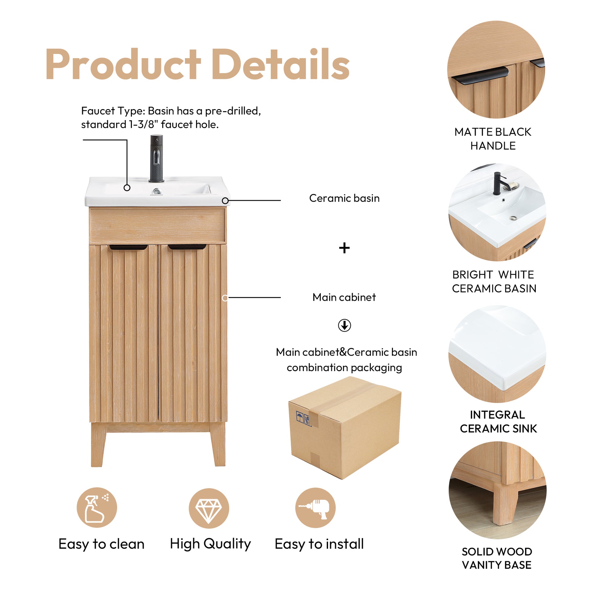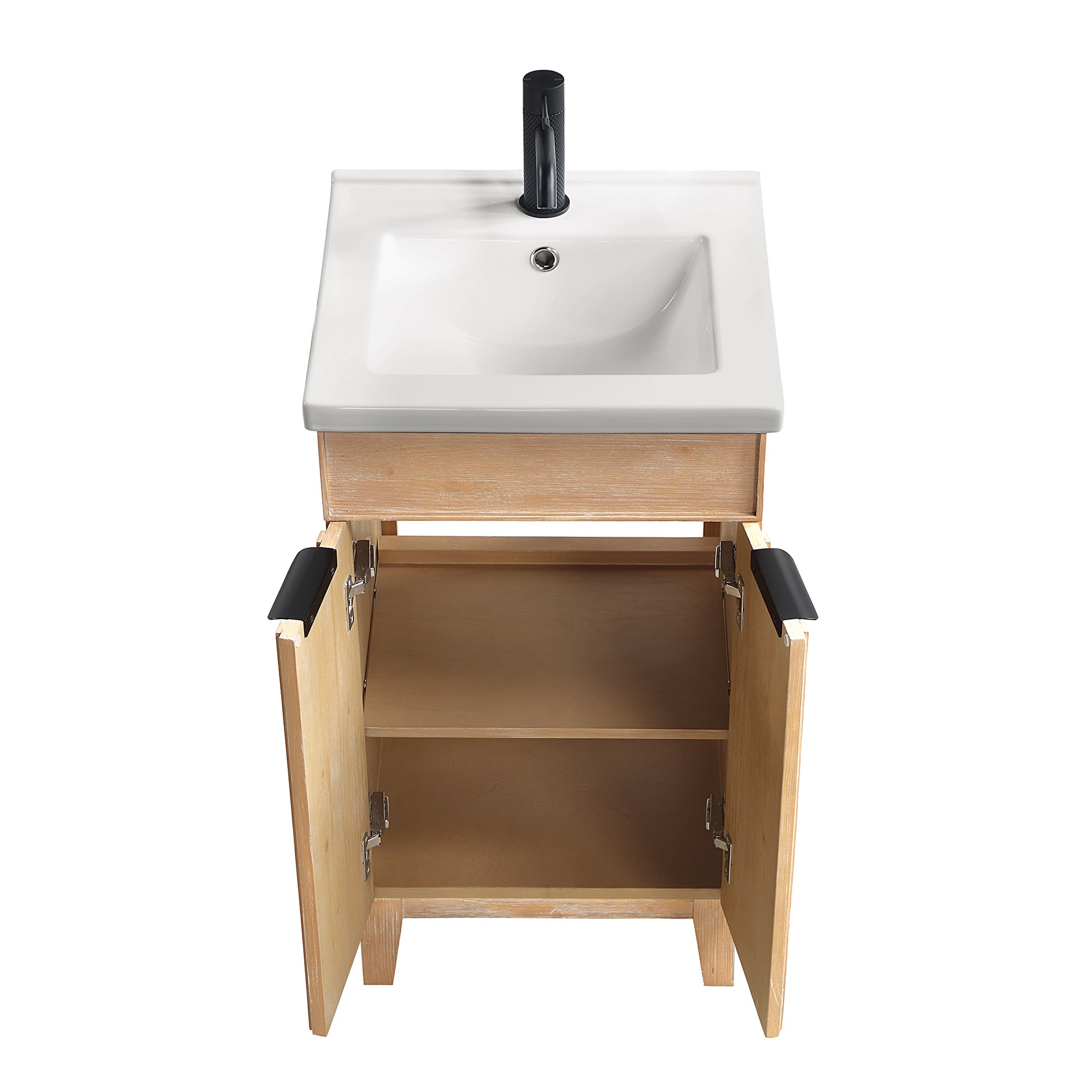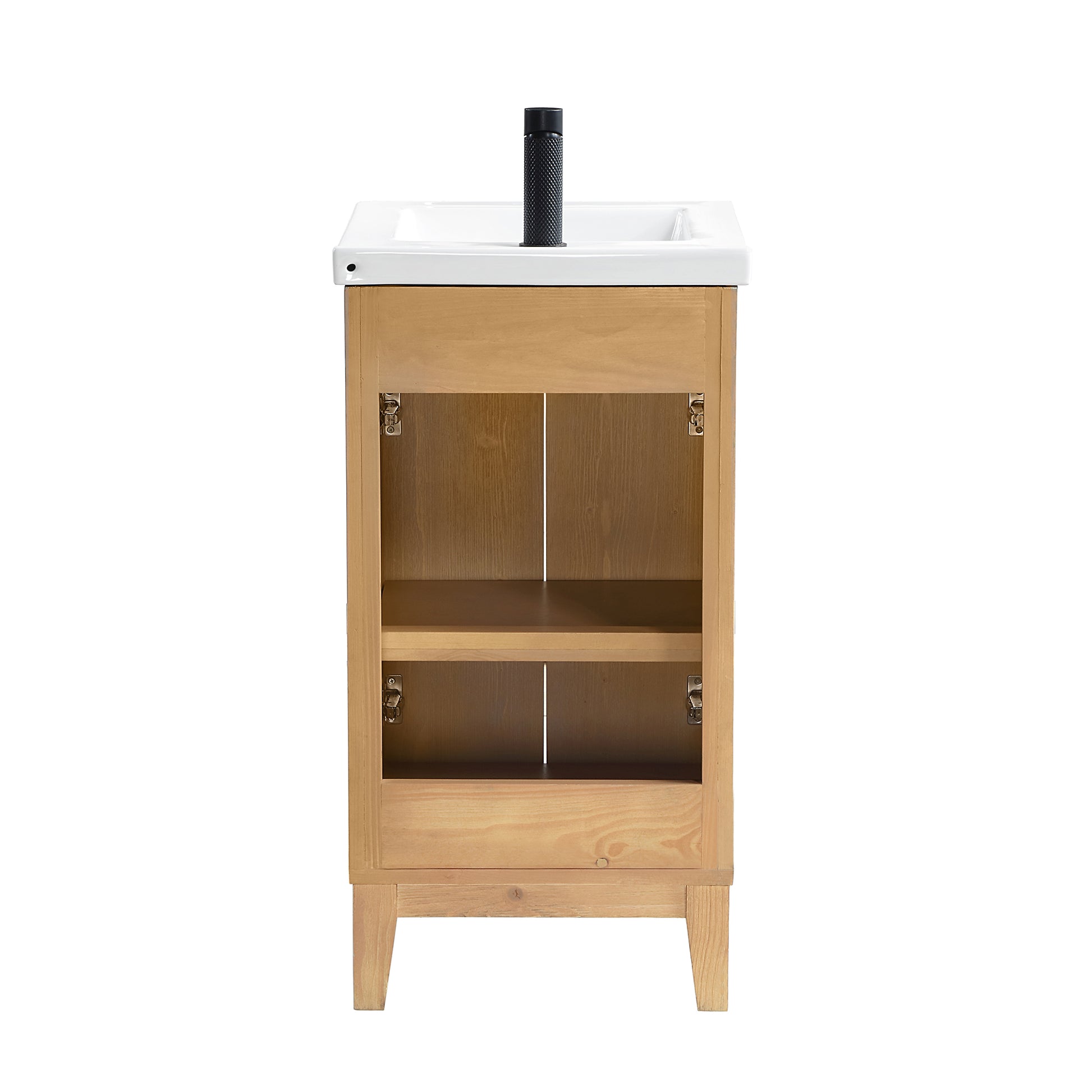 This stylish vanity features a beautiful fir wood brown finish with a drop-in white ceramic basin top and matching mirror for a cohesive look. The Palos 18 will elevate the aesthetic of your bathroom while providing functional storage solutions.