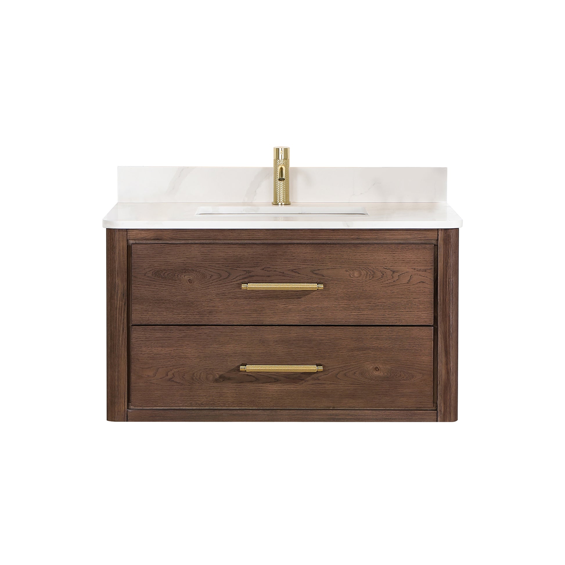 Vinnova, Cristo 36" Floating Single Bath Vanity in Aged Dark Brown Oak with Fish Maw White Quartz Stone Top