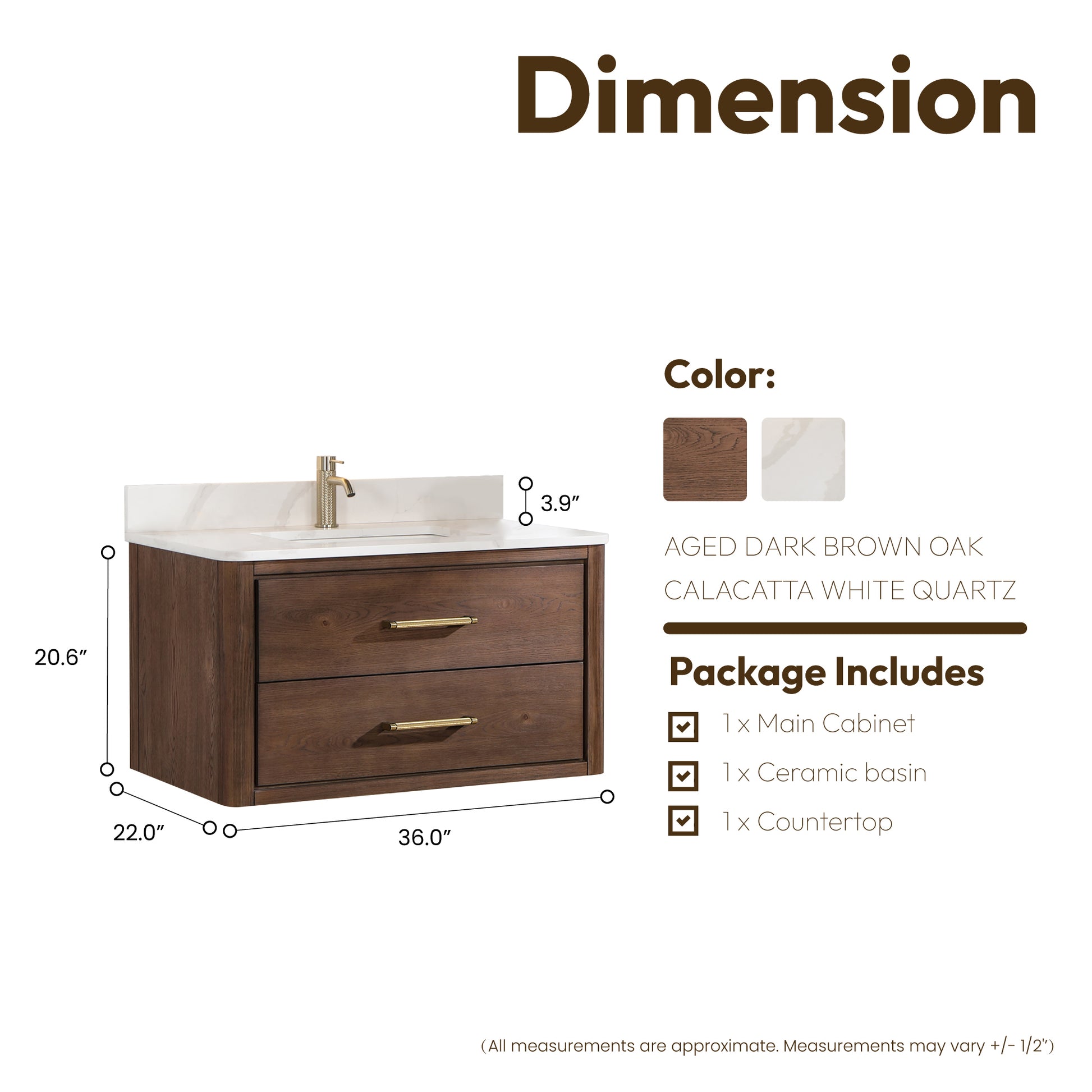 Don't settle for a standard bathroom vanity - elevate your space with the Cristo 36 Floating Single Bath Vanity in Aged Dark Brown Oak with Fish Maw White Quartz Stone Top.