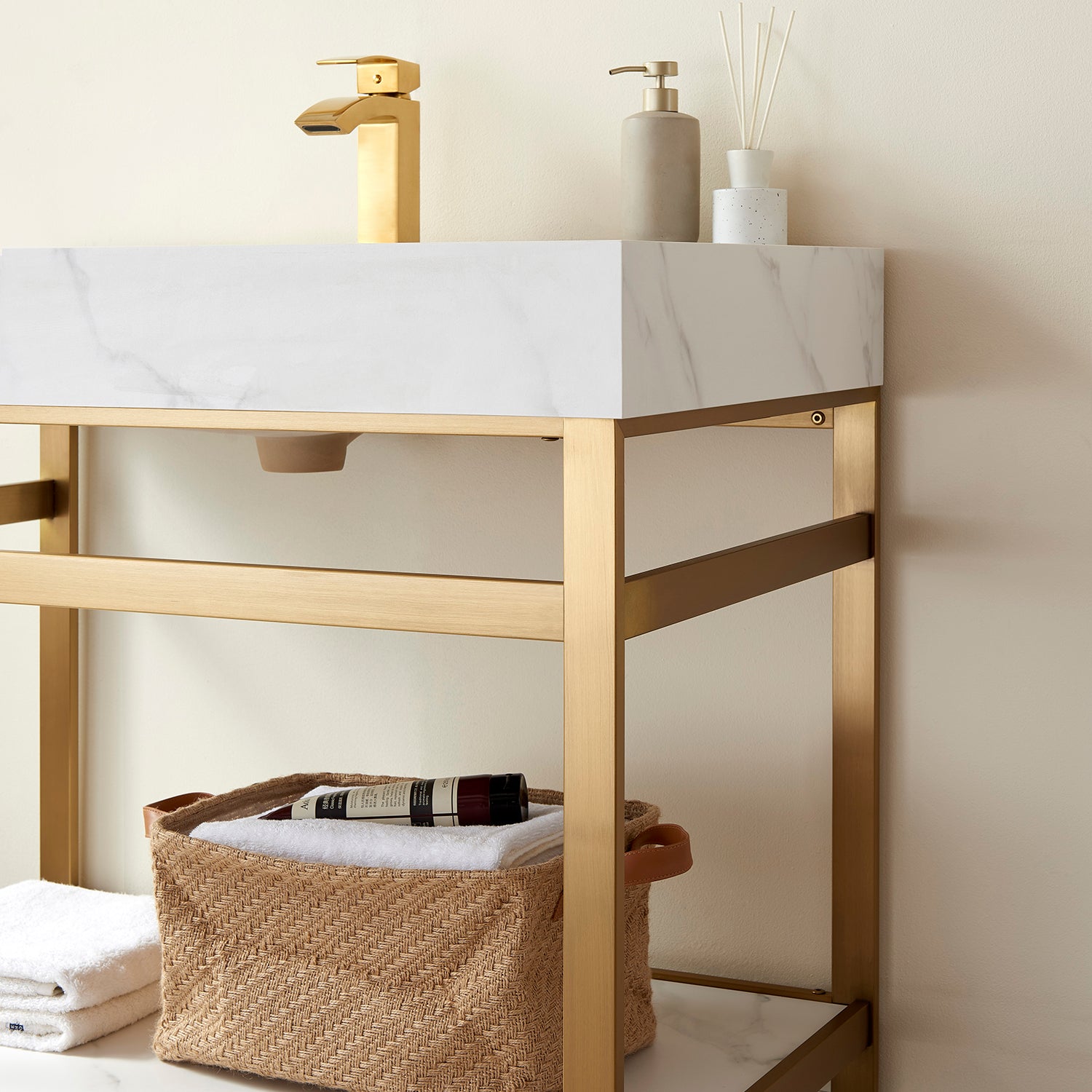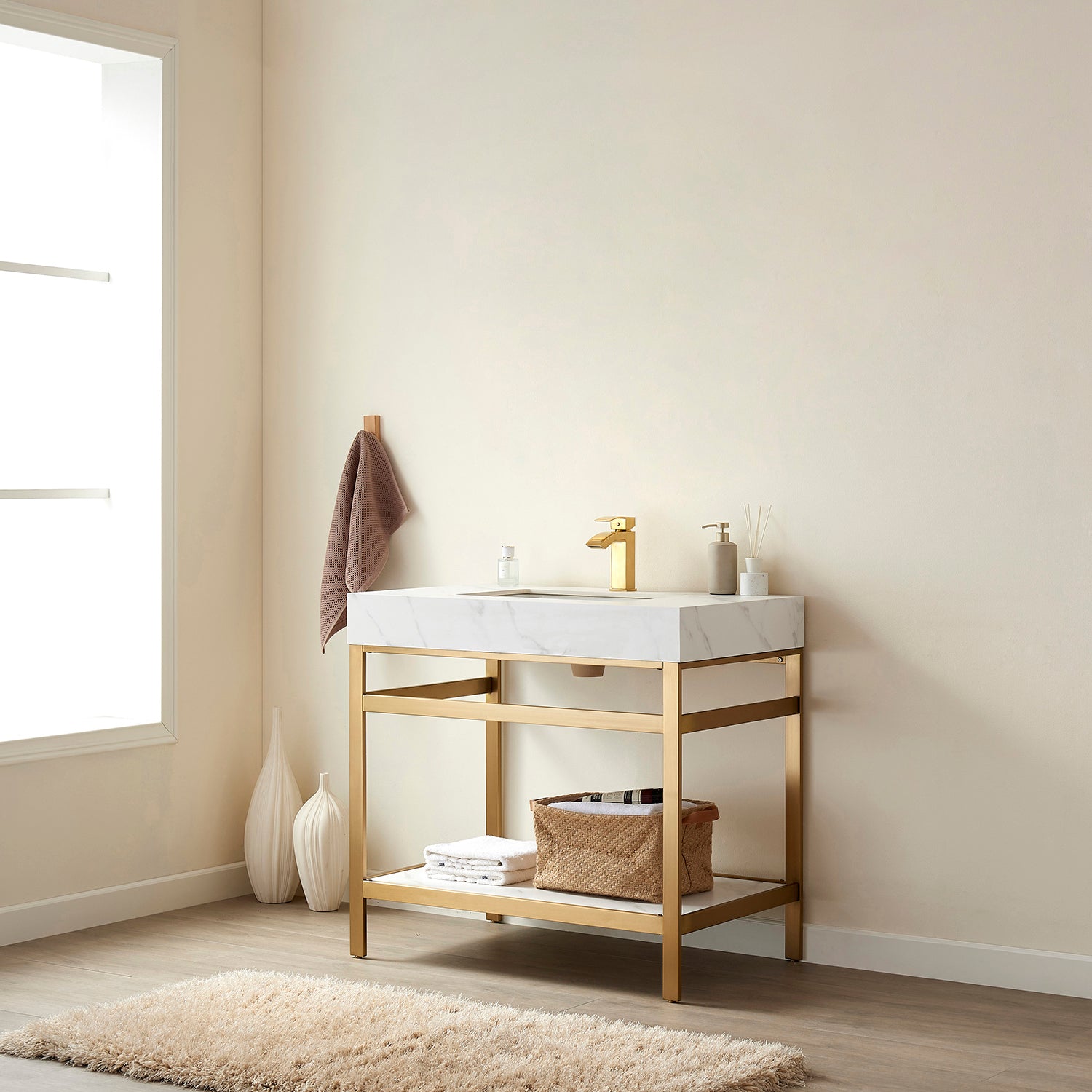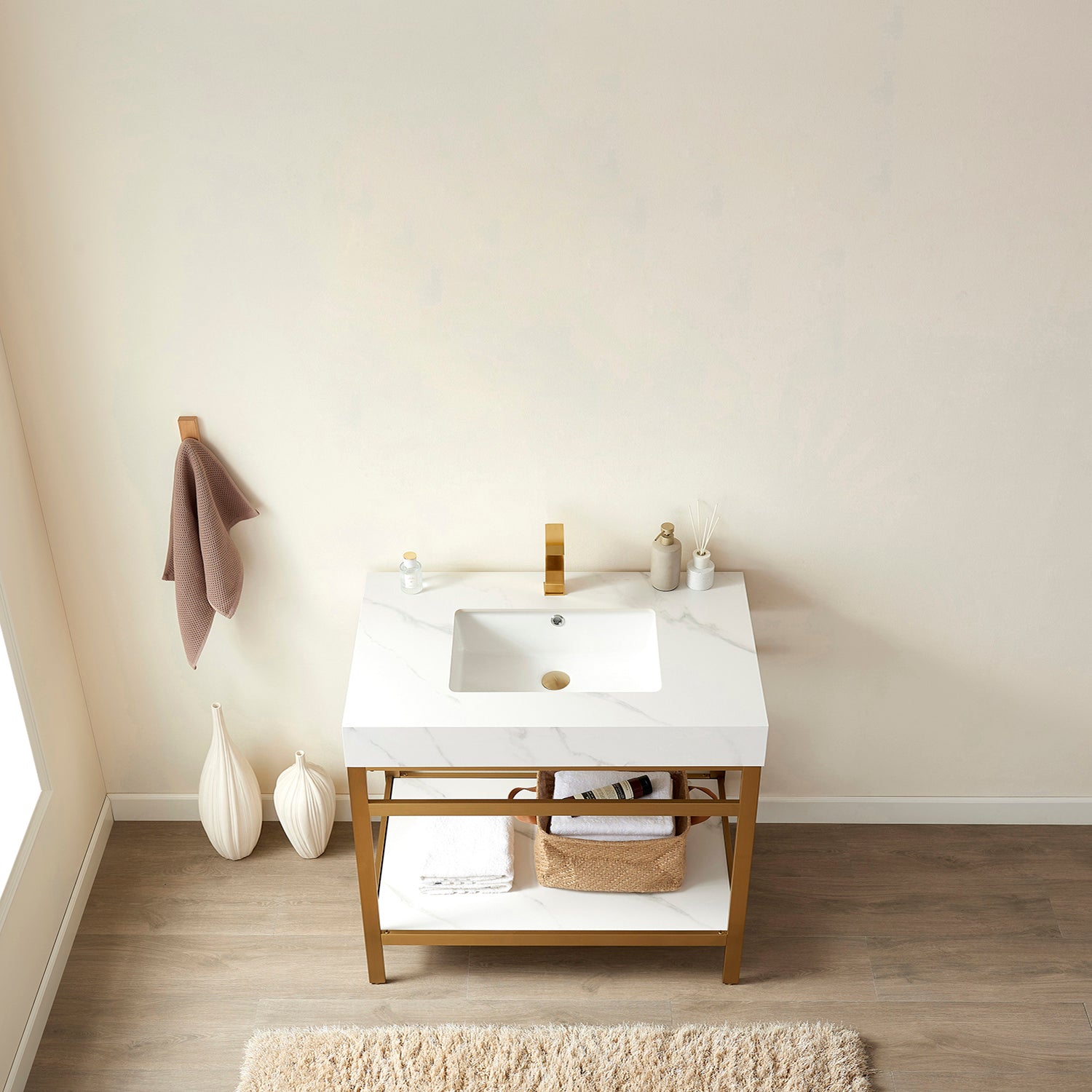 Vinnova, Funes 36" Single Sink Bath Vanity in Brushed Gold Metal Support with White Sintered Stone Top