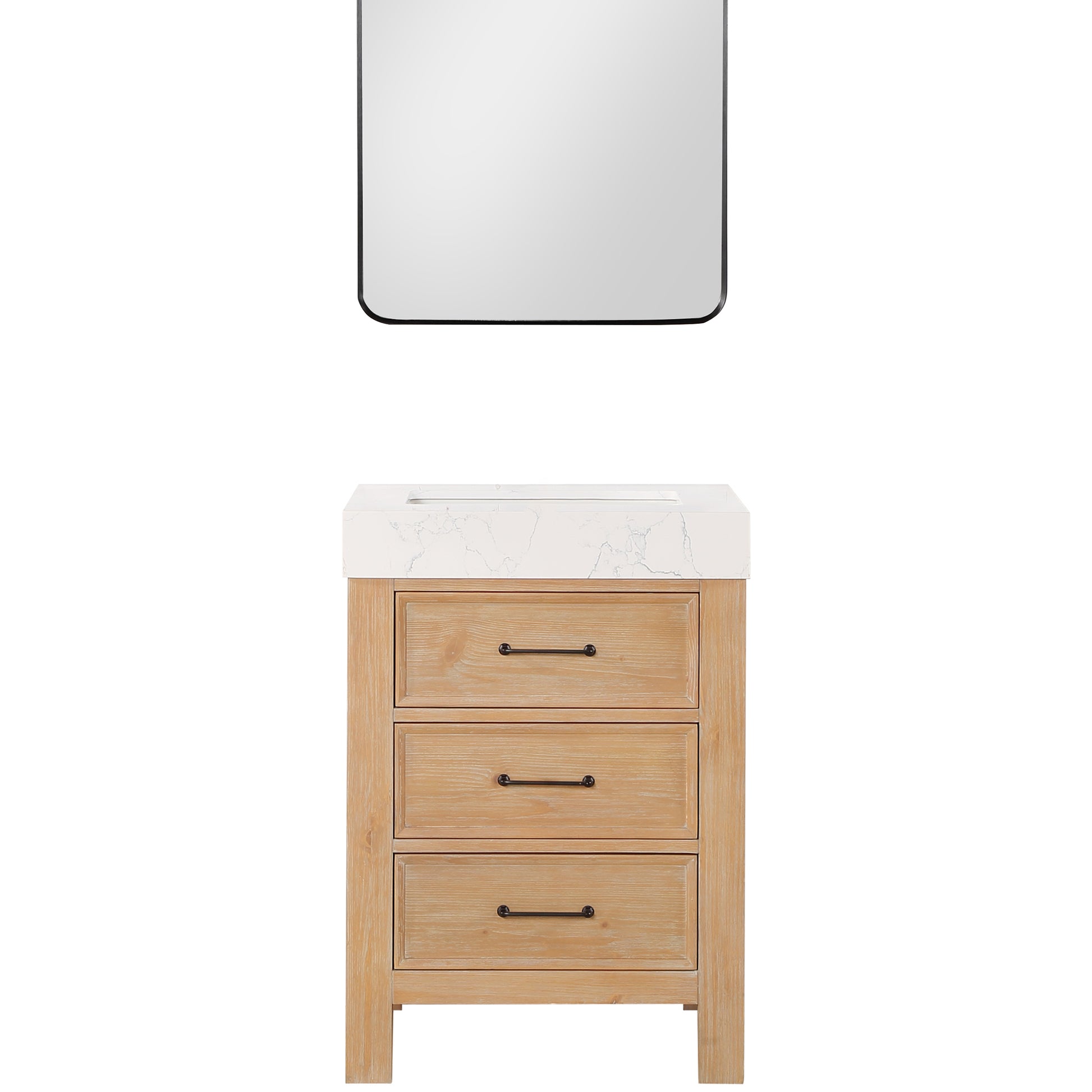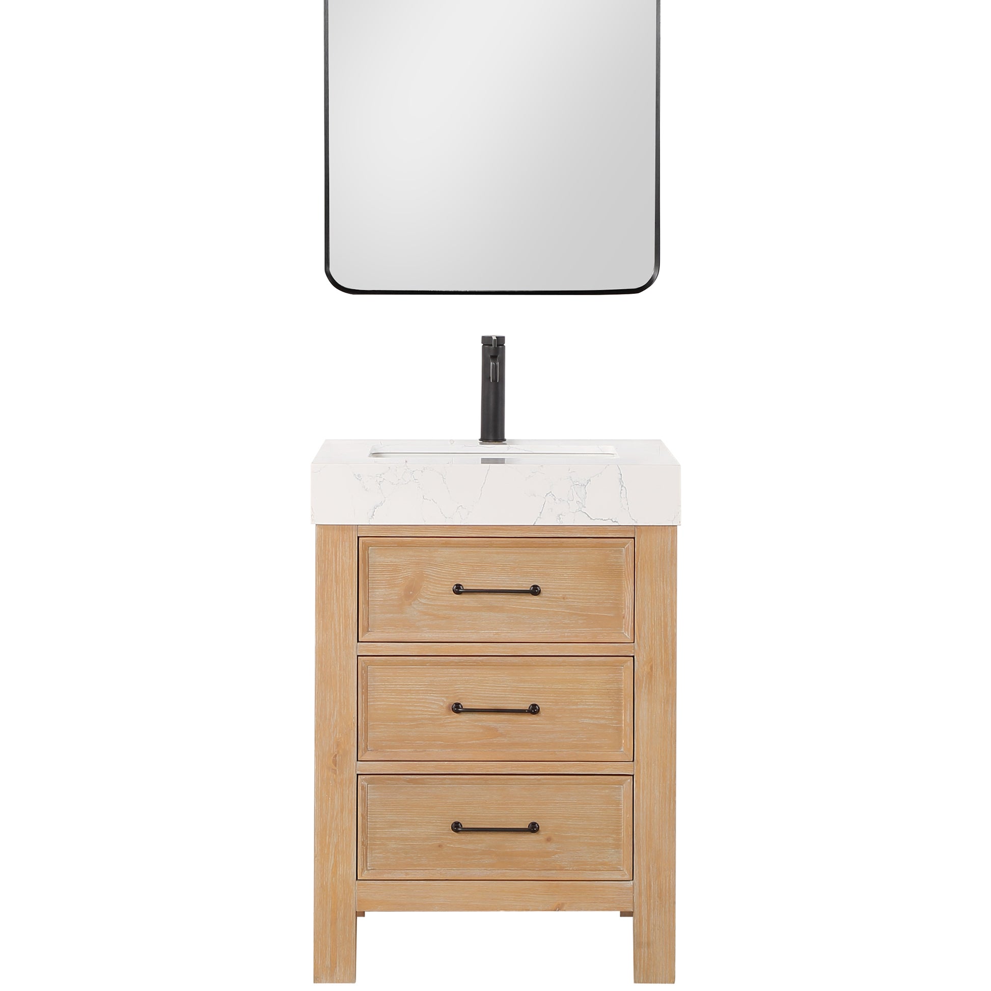 Vinnova, León 24in. Free-standing Single Bathroom Vanity in Fir Wood Brown with Composite top in Lightning White and Mirror