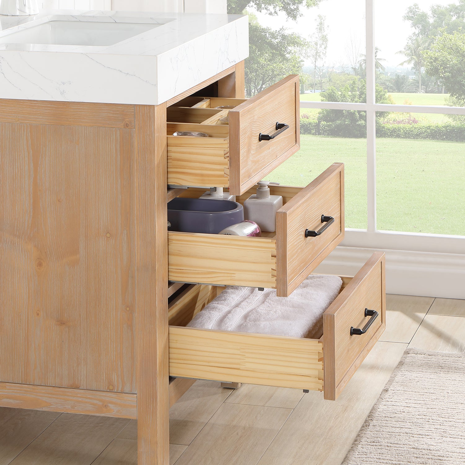 Description: Transform your bathroom into a luxurious oasis with the León 24in. Free-standing Single Bathroom Vanity. Crafted from beautiful fir wood in a rich brown finish, this vanity features a sleek composite top in Lightning White and includes a matching mirror for a cohesive look.