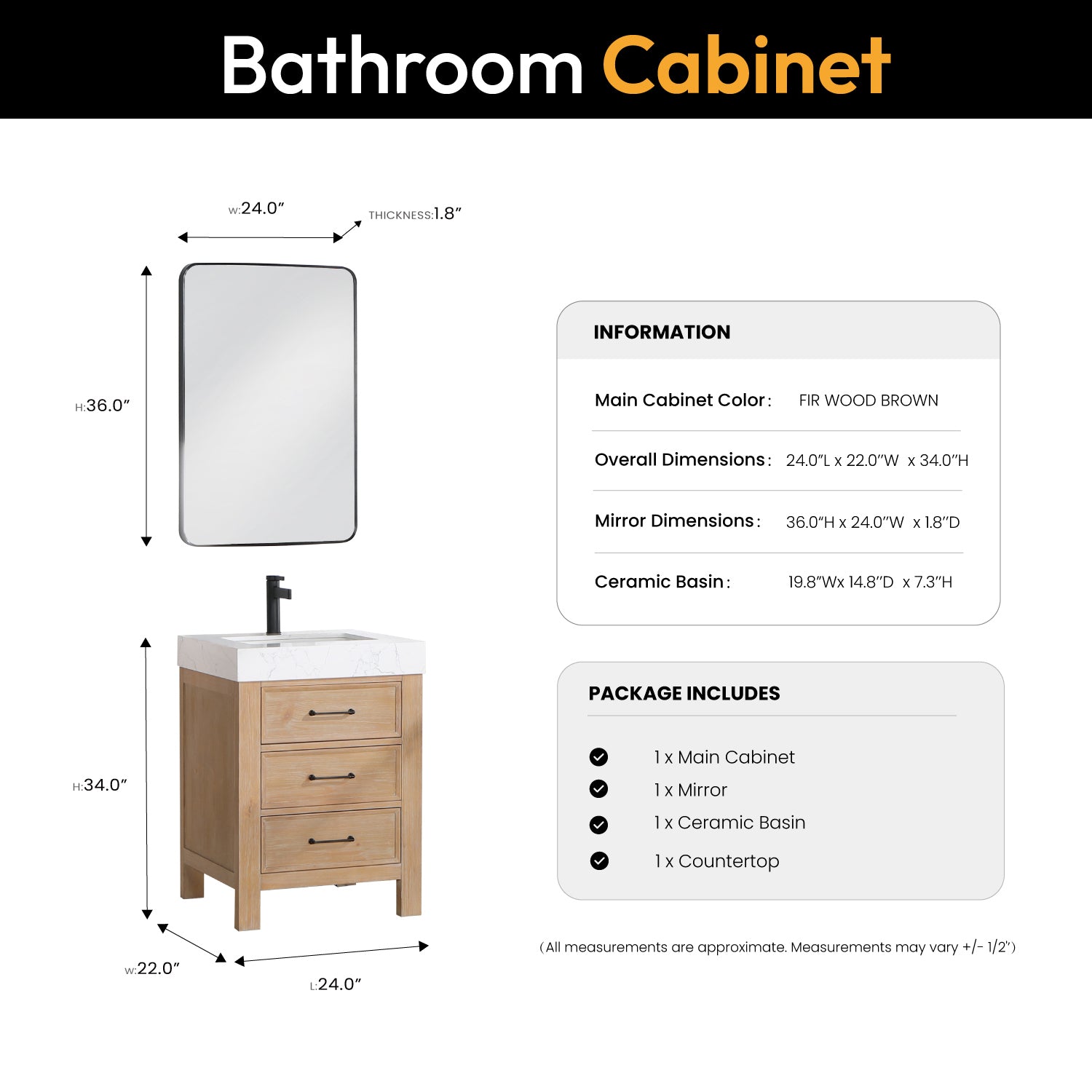 Headline: Elevate Your Bathroom with the León 24in. Free-standing Single Bathroom Vanity in Fir Wood Brown with Composite top in Lightning White and Mirror