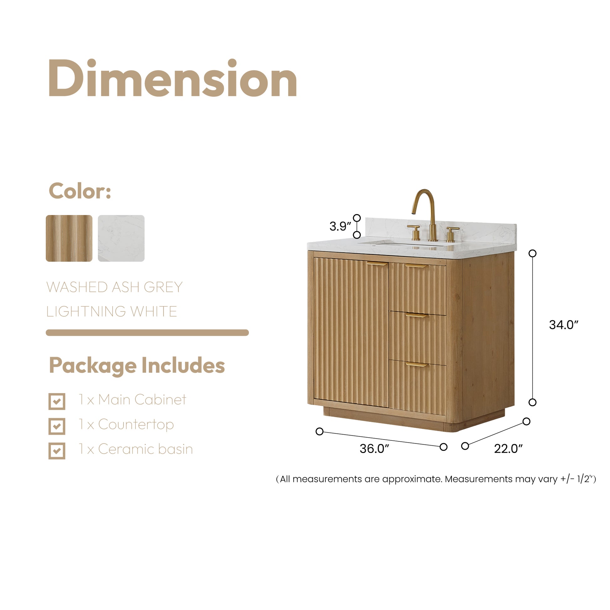 Upgrade Your Bathroom with the Cádiz 36in. Free-standing Single Bathroom Vanity in Washed Ash Grey with Composite top in Lightning White