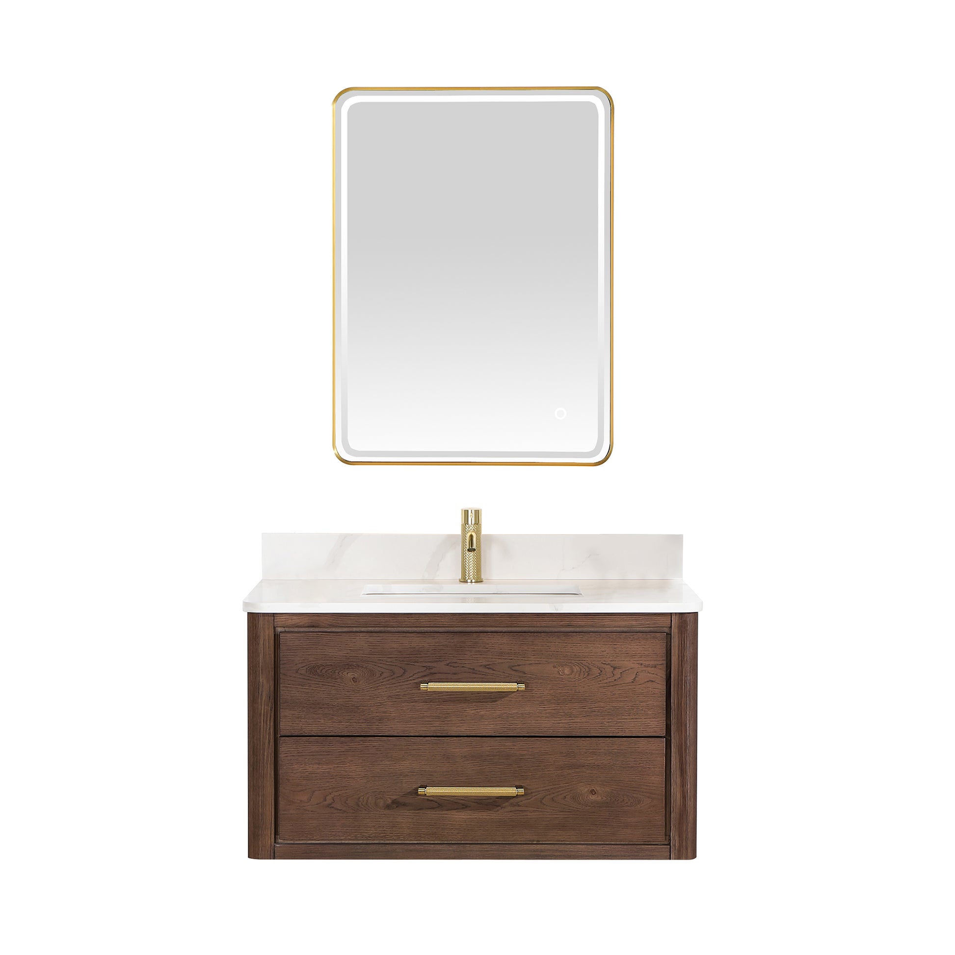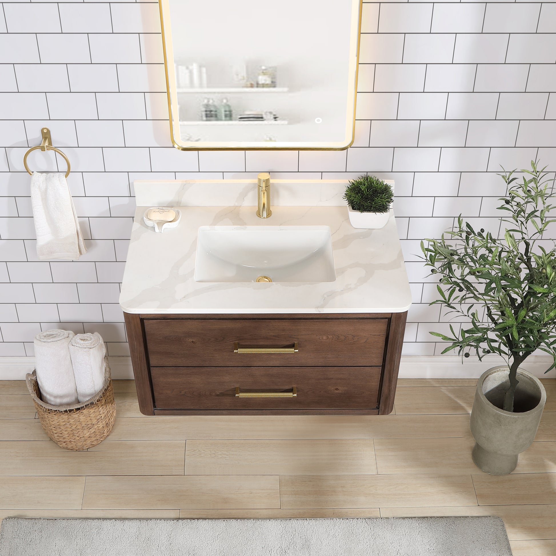 Vinnova, Cristo 36" Floating Single Bath Vanity in Aged Dark Brown Oak with Fish Maw White Quartz Stone Top and Mirror