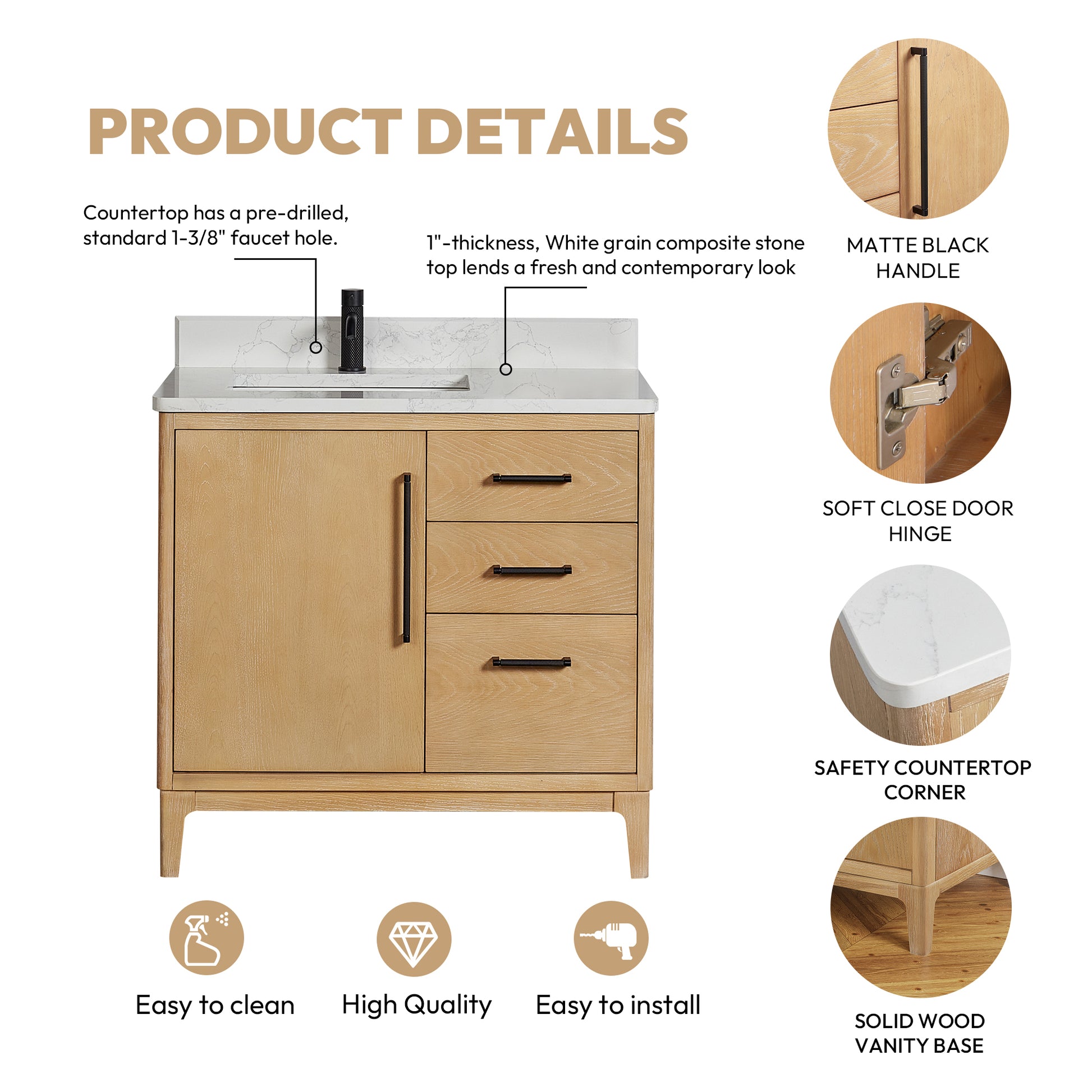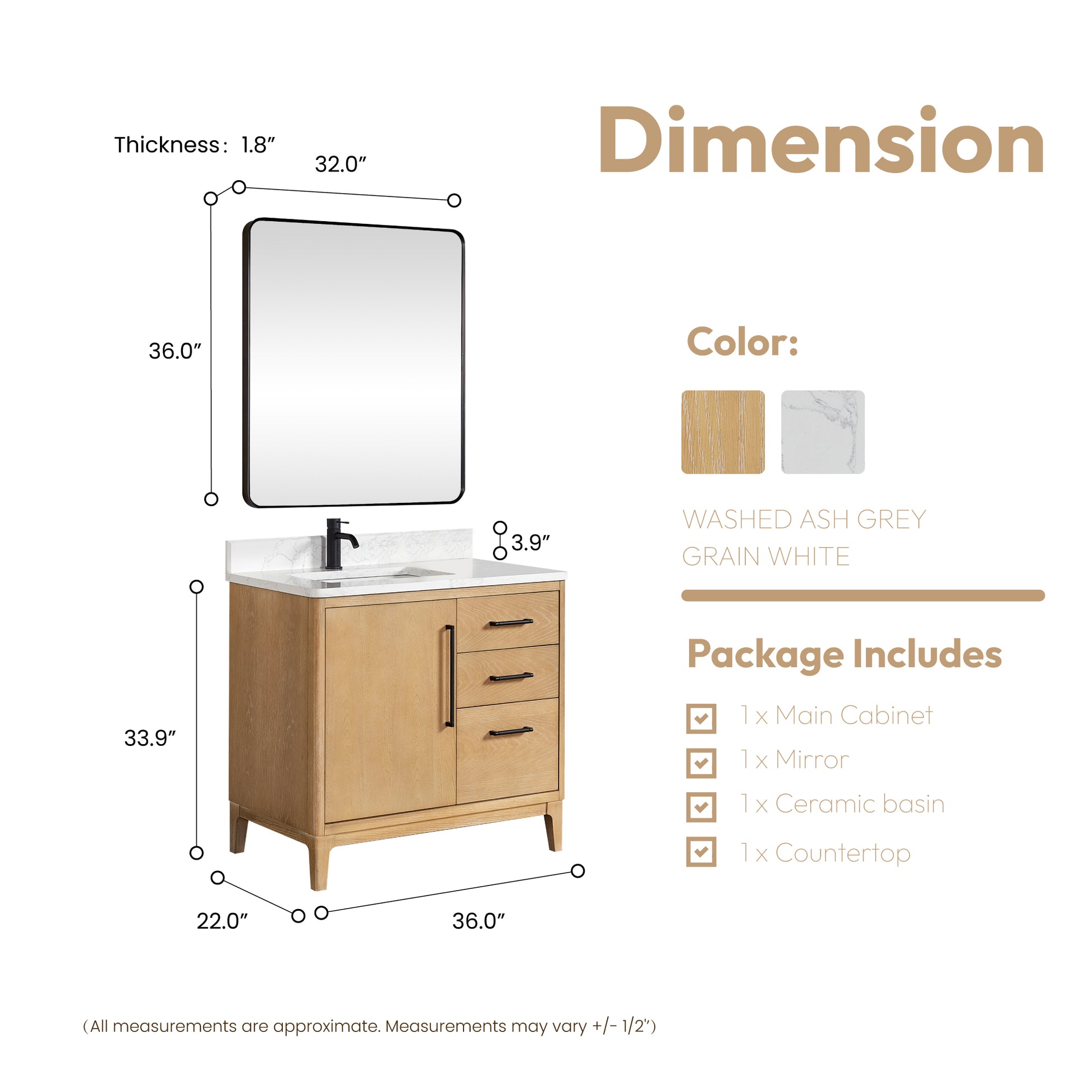 Description: Transform your bathroom with the elegant Gara 36 Free-standing Single Bath Vanity in Washed Ash Grey. This stunning piece features a White Grain Composite Stone Top and Mirror, providing a sleek and modern look to your space.