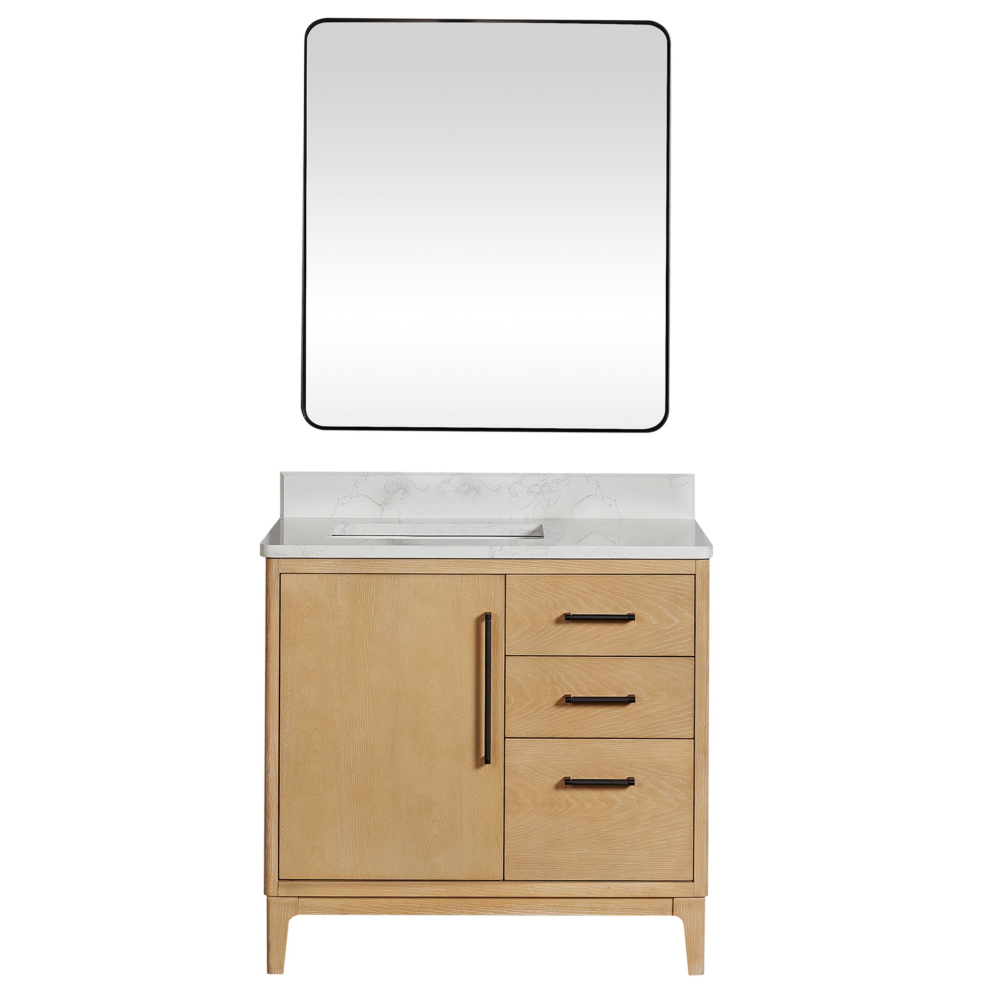 Vinnova, Gara 36" Free-standing Single Bath Vanity in Washed Ash Grey with White Grain Composite Stone Top and Mirror
