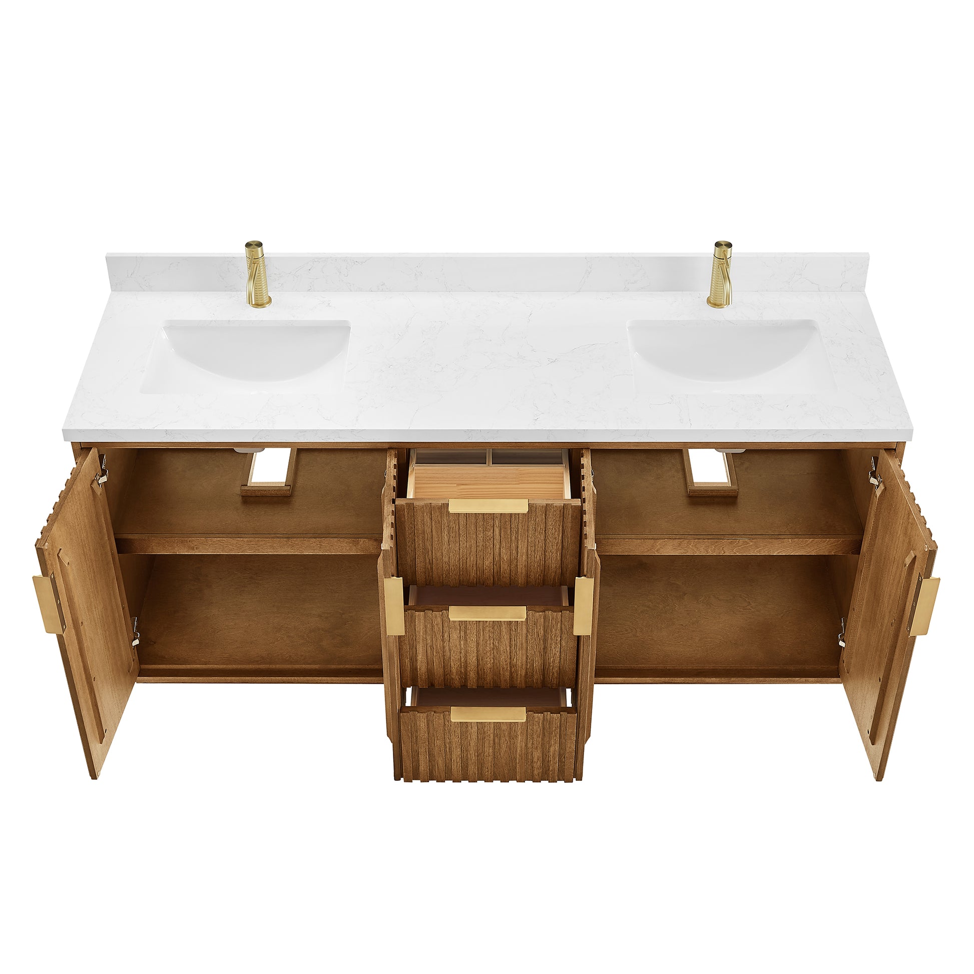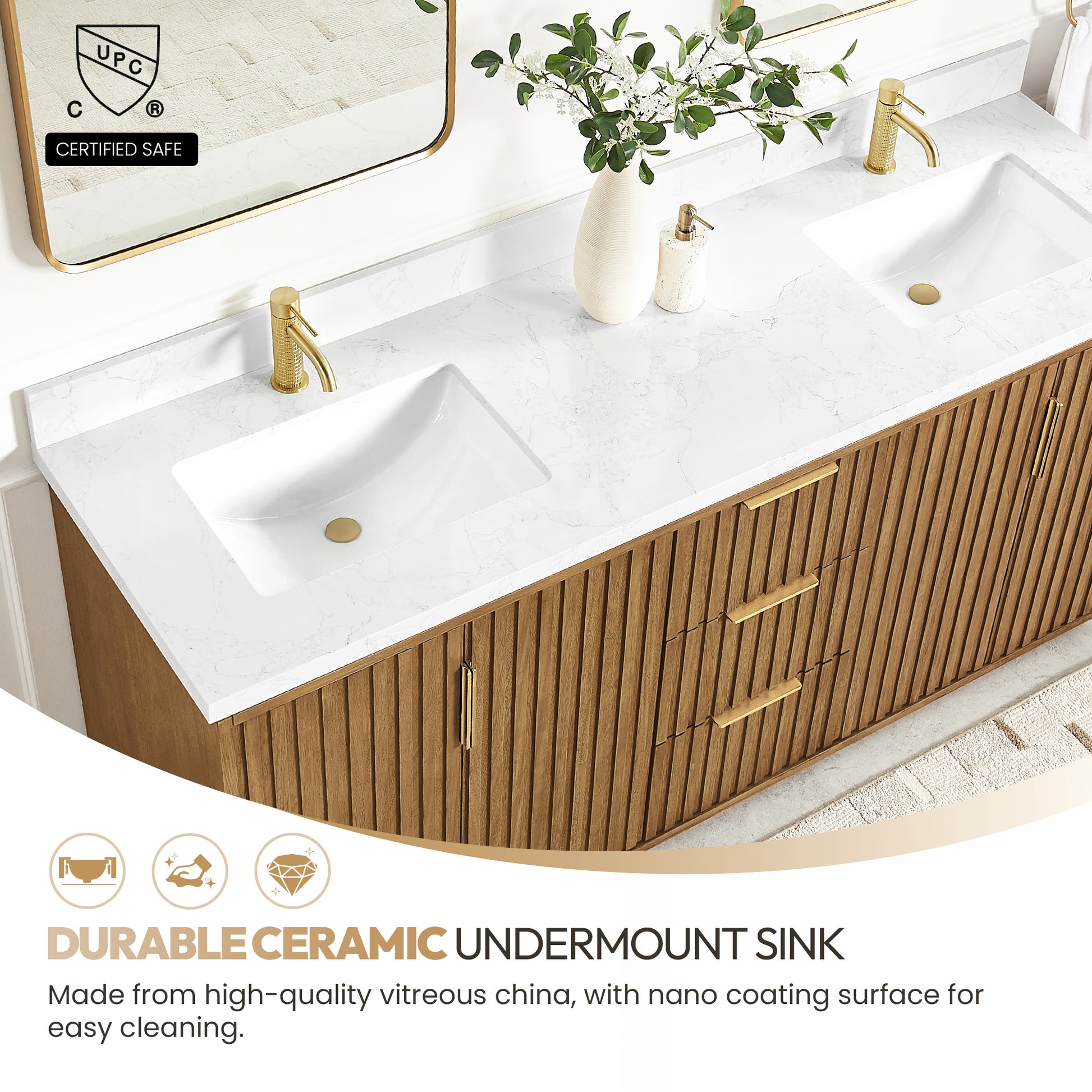 - Double sink design allows for easy sharing of the vanity