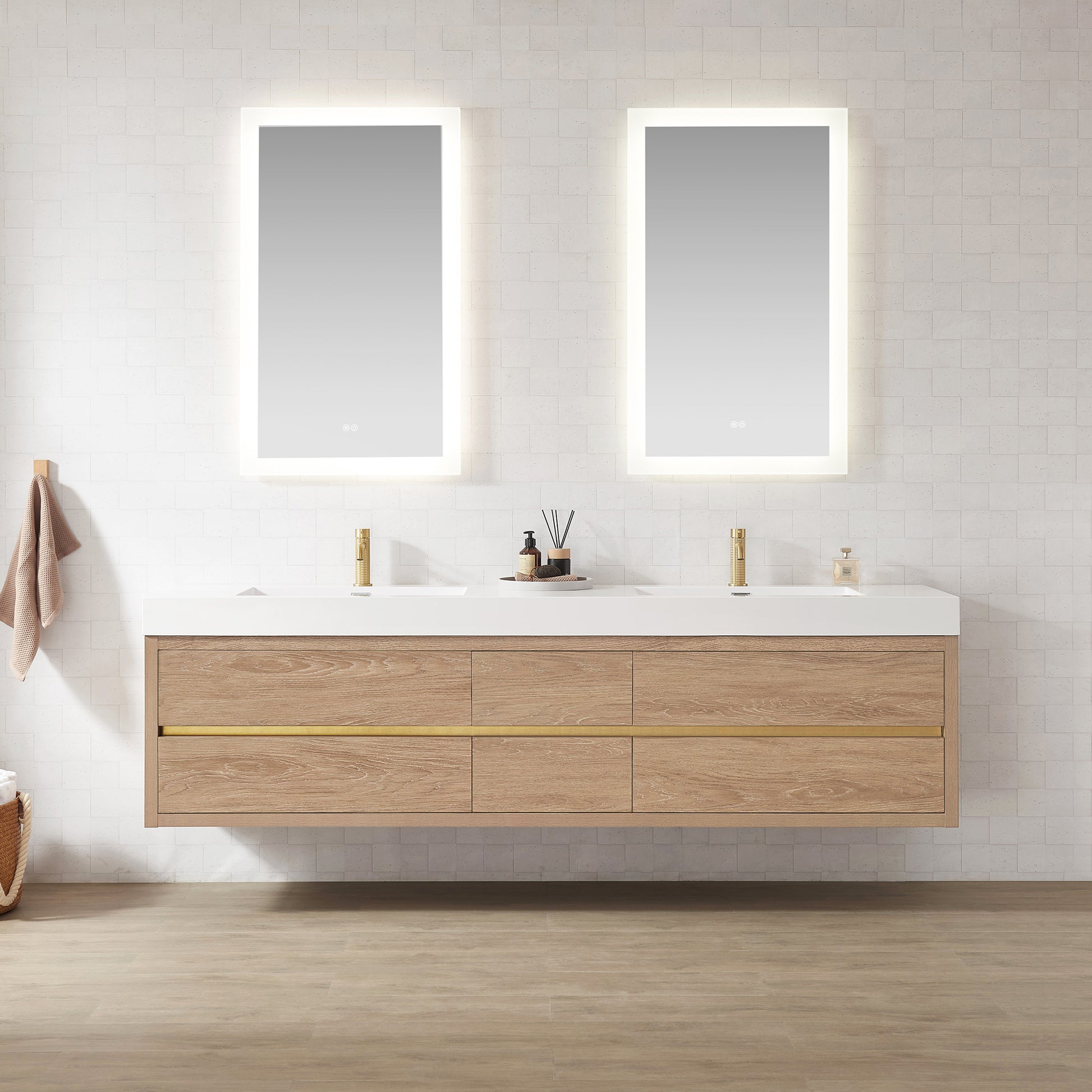 Vinnova, Palencia 84" Double Sink Wall-Mount Bath Vanity in North American Oak with White Composite Integral Sink Top