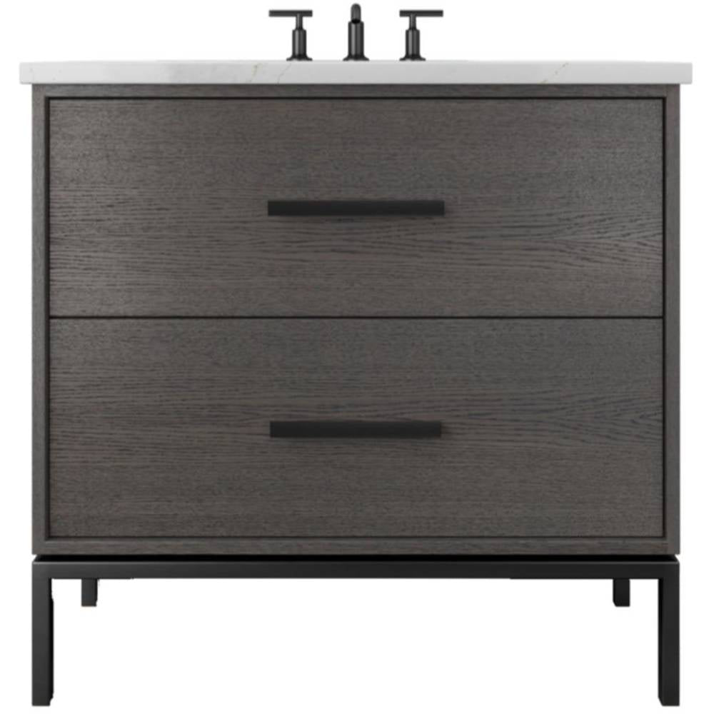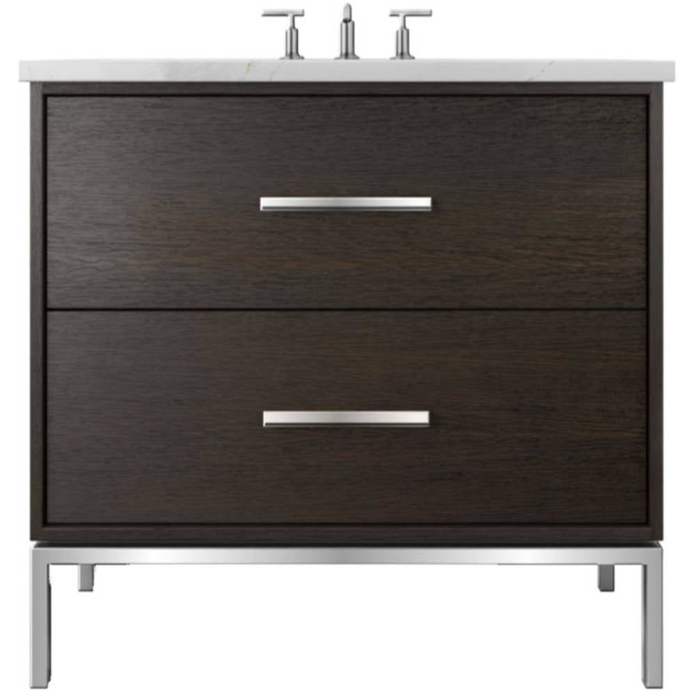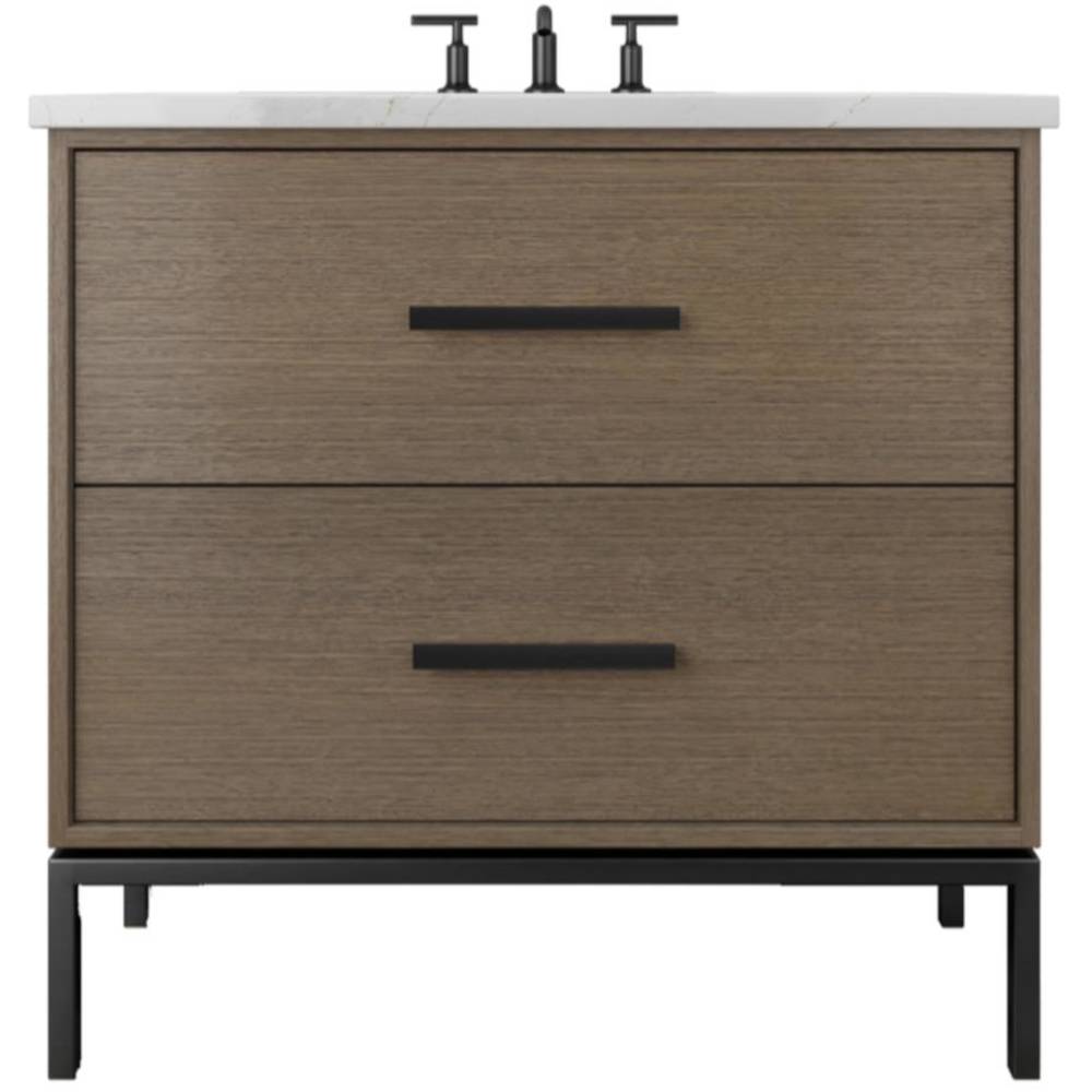 Neo Modern design inspired, oak wood single bath vanity. Featuring 2 functional drawers, designed to clear plumbing, done in a rift cut white oak veneer with a metal base, available in 3 sizes and multiple wood and metal finish combinations.