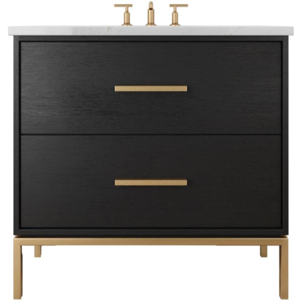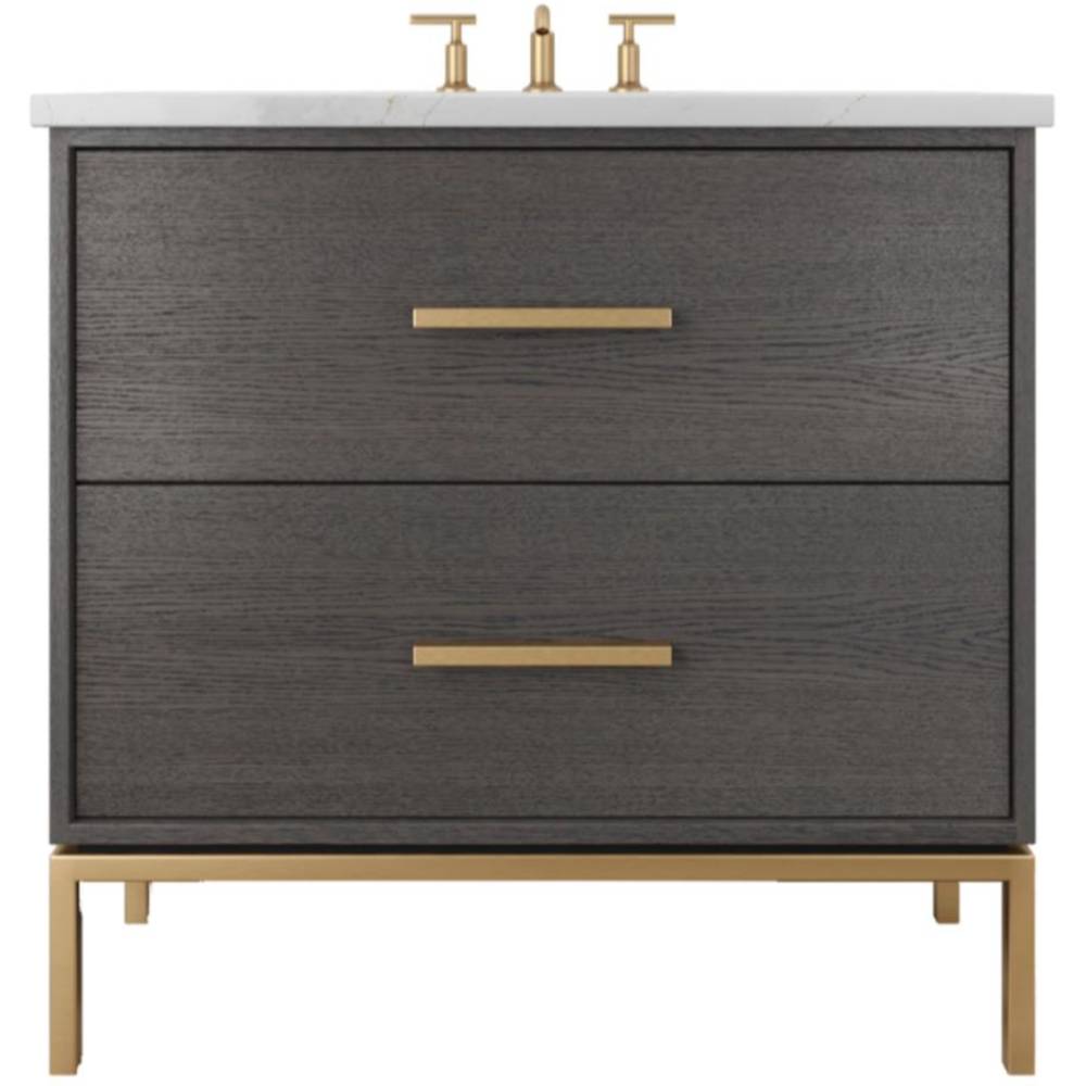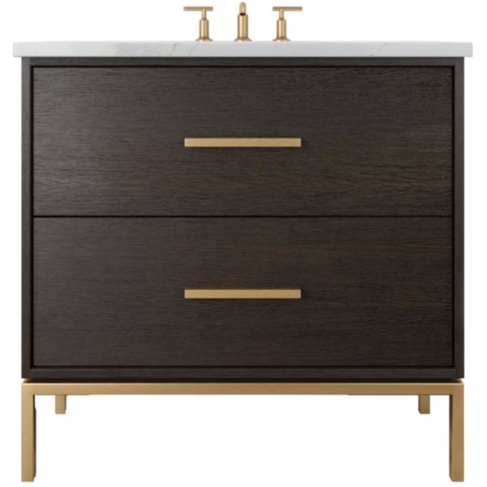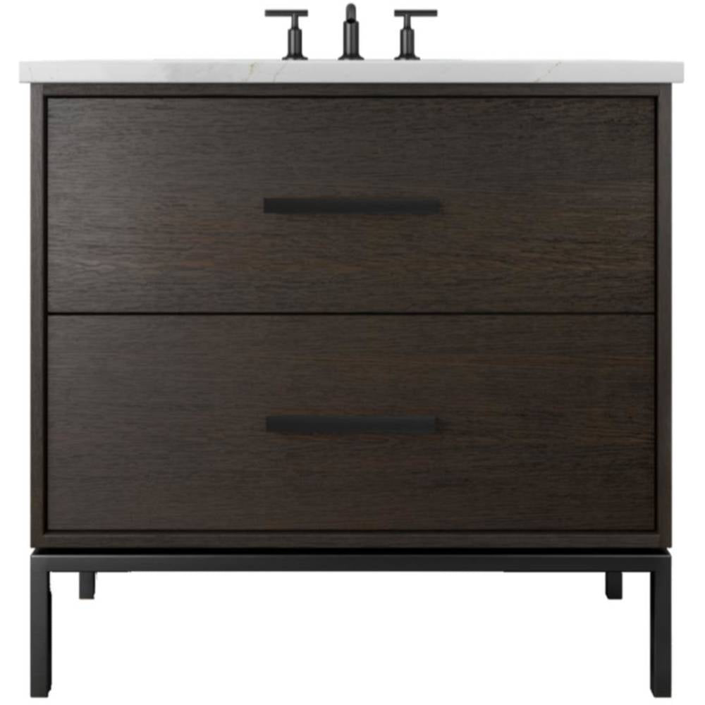 Neo Modern design inspired, oak wood single bath vanity. Featuring 2 functional drawers, designed to clear plumbing, done in a rift cut white oak veneer with a metal base, available in 3 sizes and multiple wood and metal finish combinations.