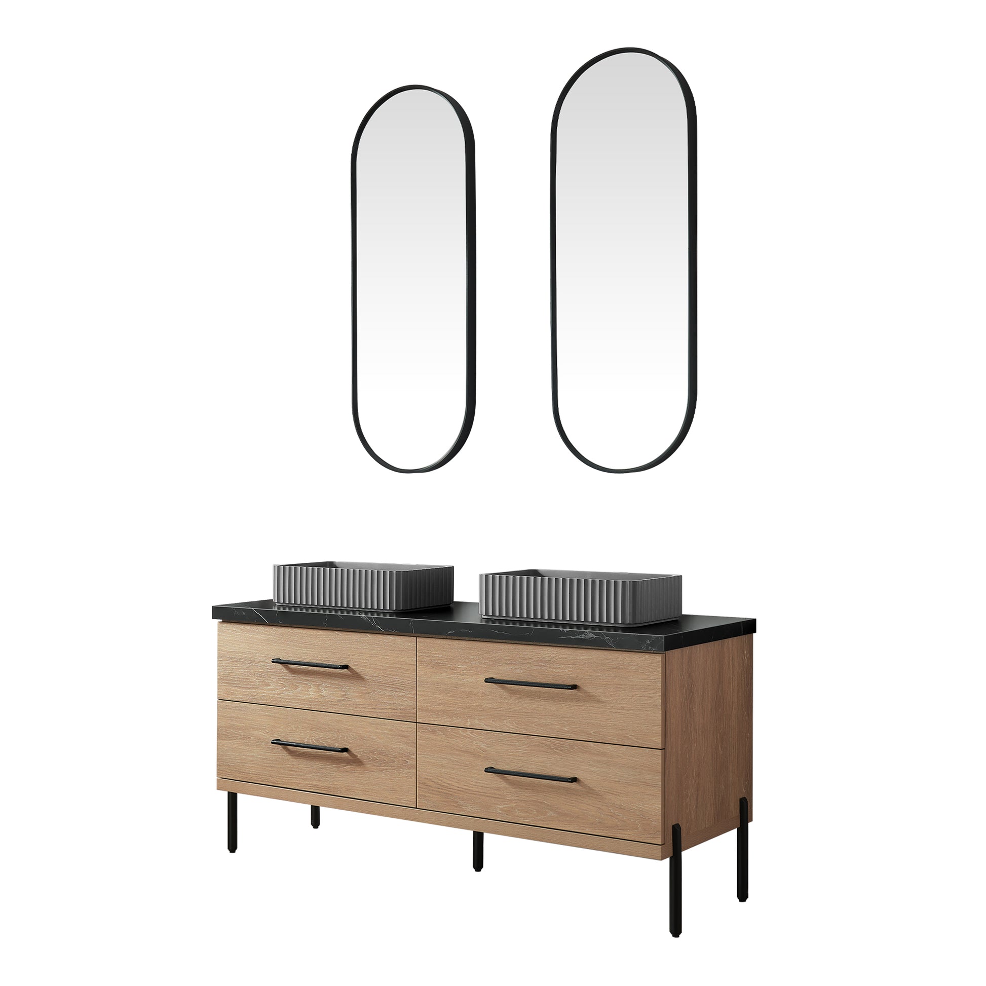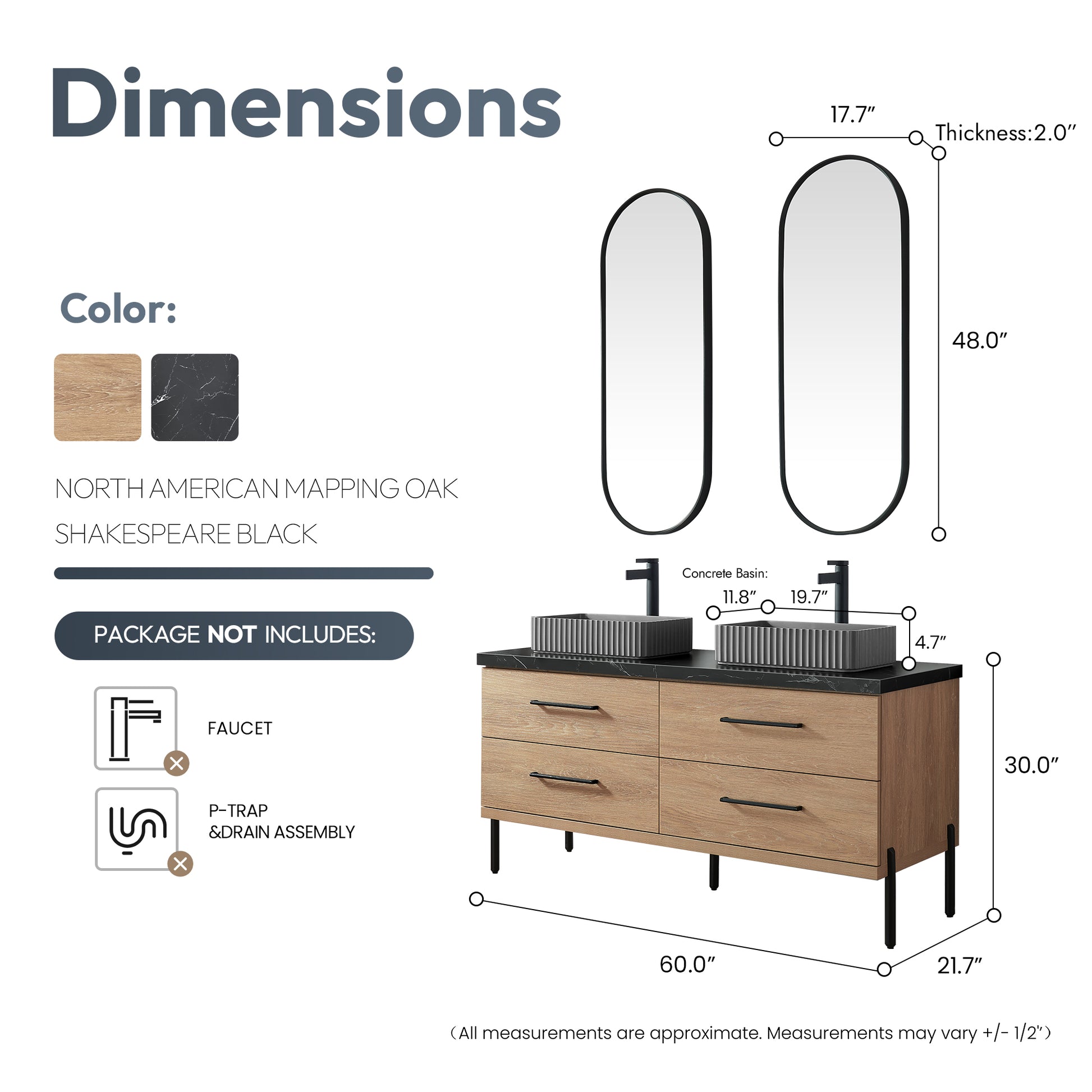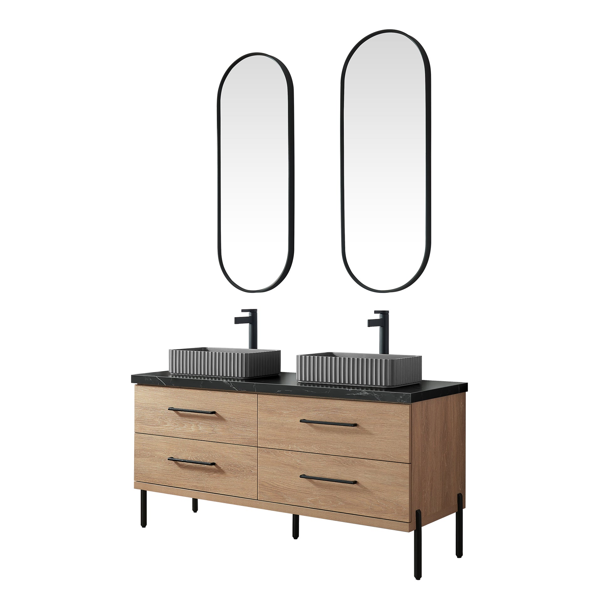 Vinnova, Trento 60A" Double Sink Bath Vanity in North American Oak with Black Sintered Stone Top with Concrete Sink and Mirror