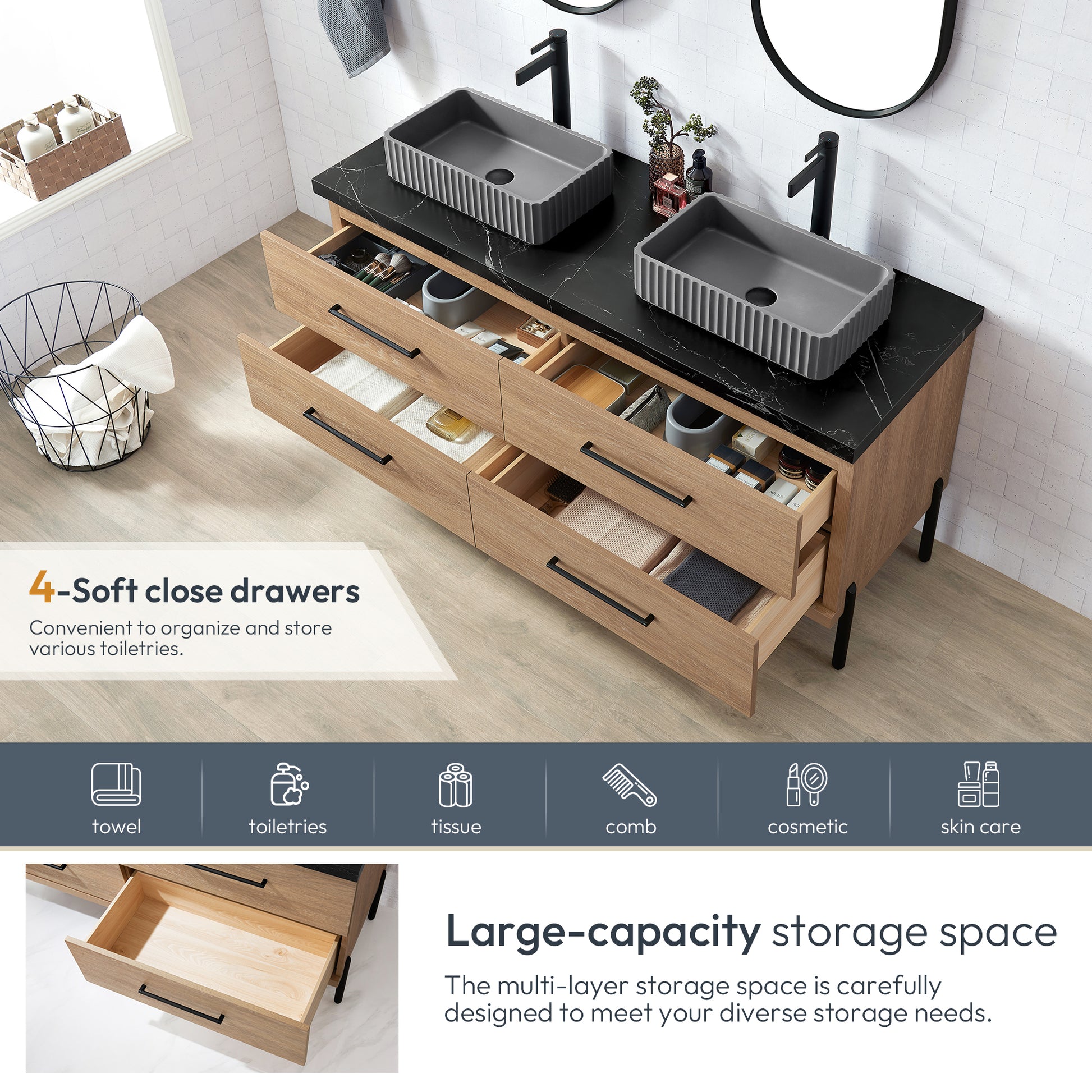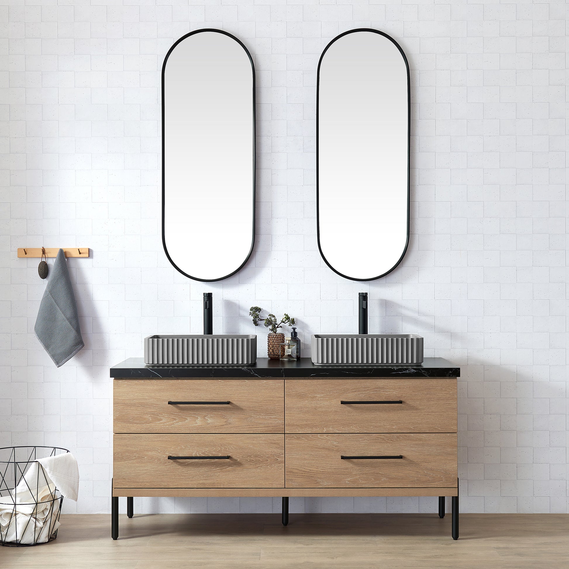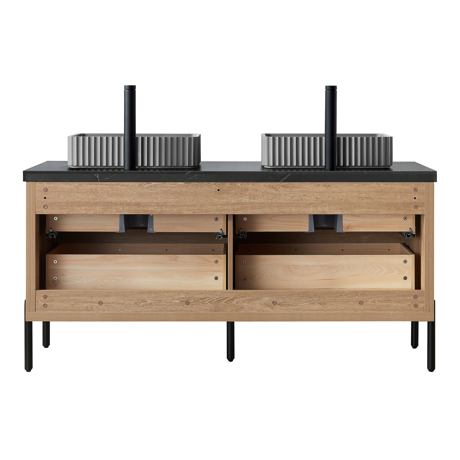 Vinnova, Trento 60A" Double Sink Bath Vanity in North American Oak with Black Sintered Stone Top with Concrete Sink and Mirror