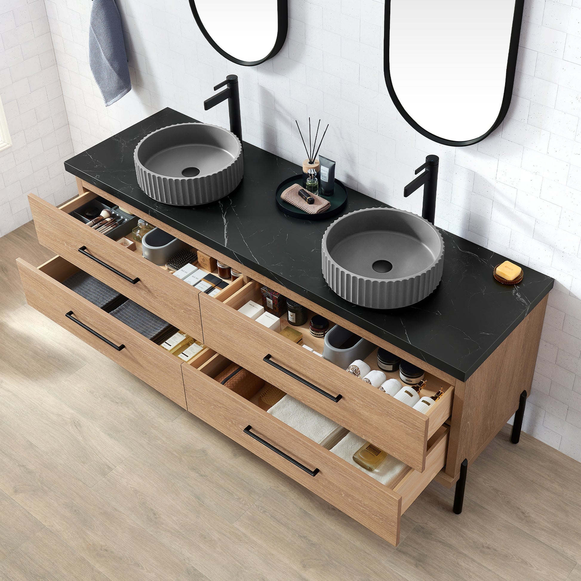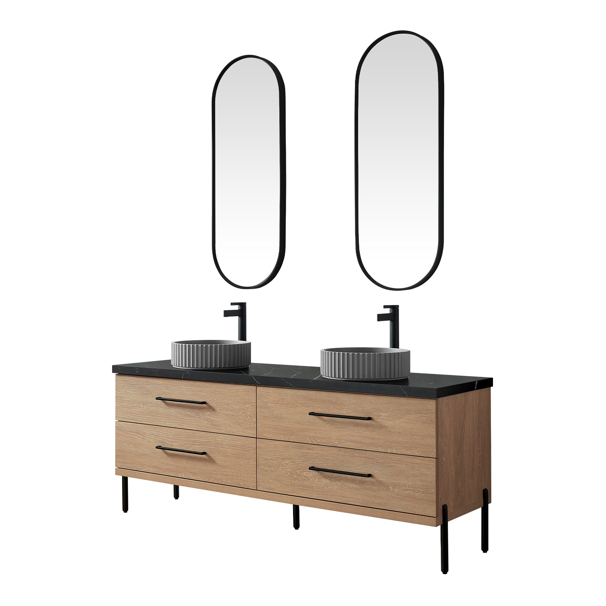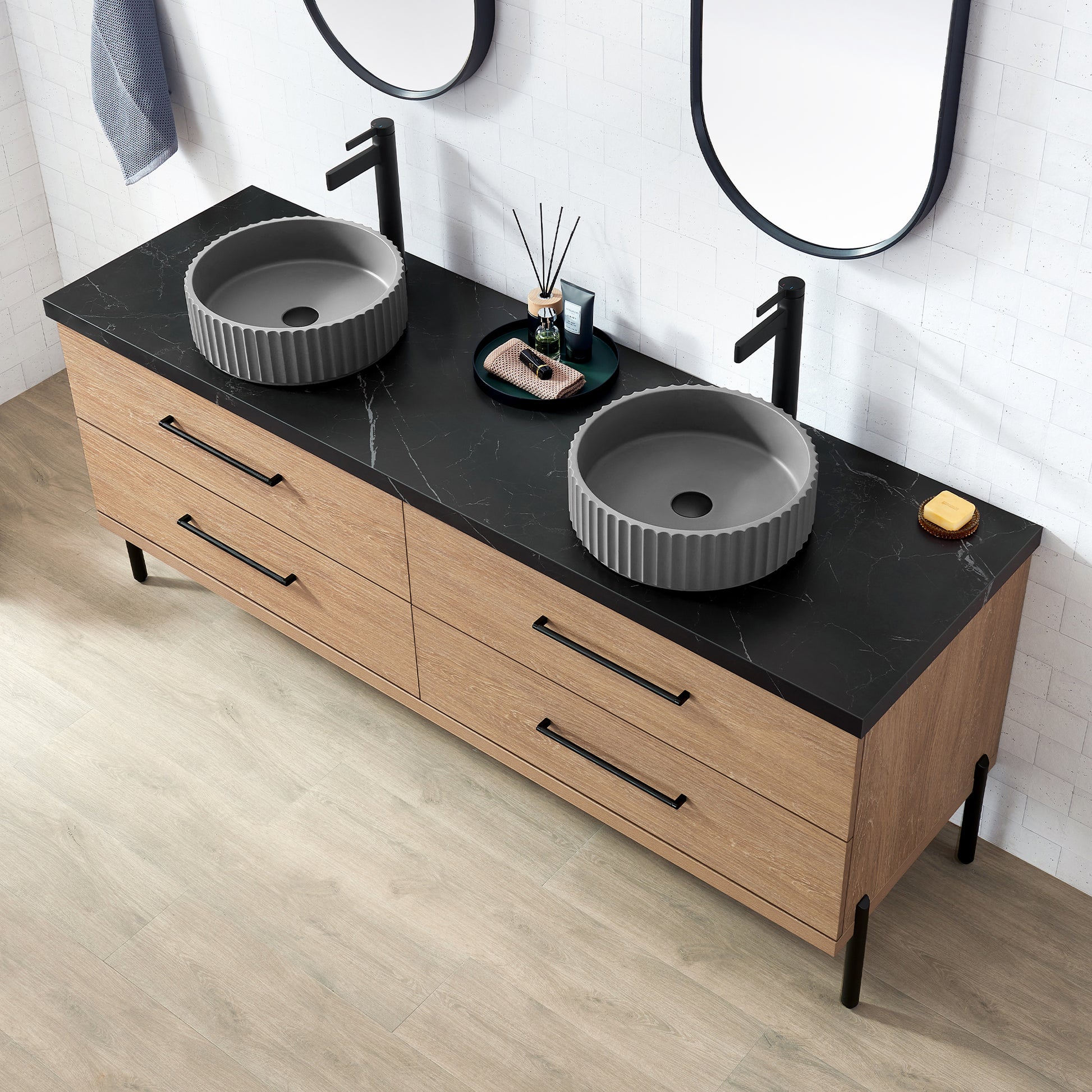 Vinnova, Trento 72B" Double Sink Bath Vanity in North American Oak with Black Sintered Stone Top with Concrete Sink and Mirror