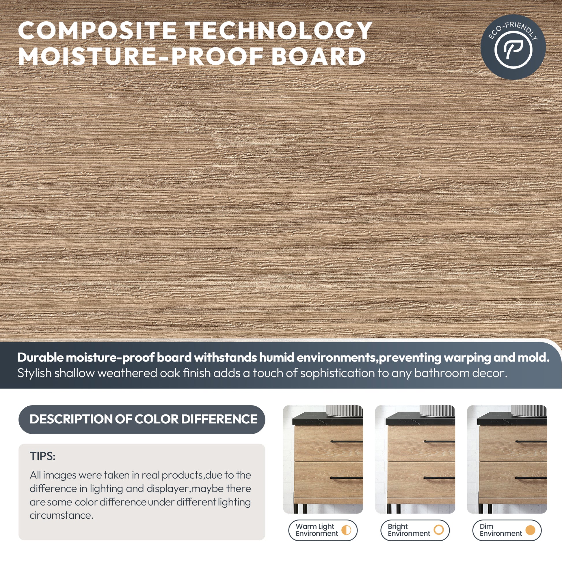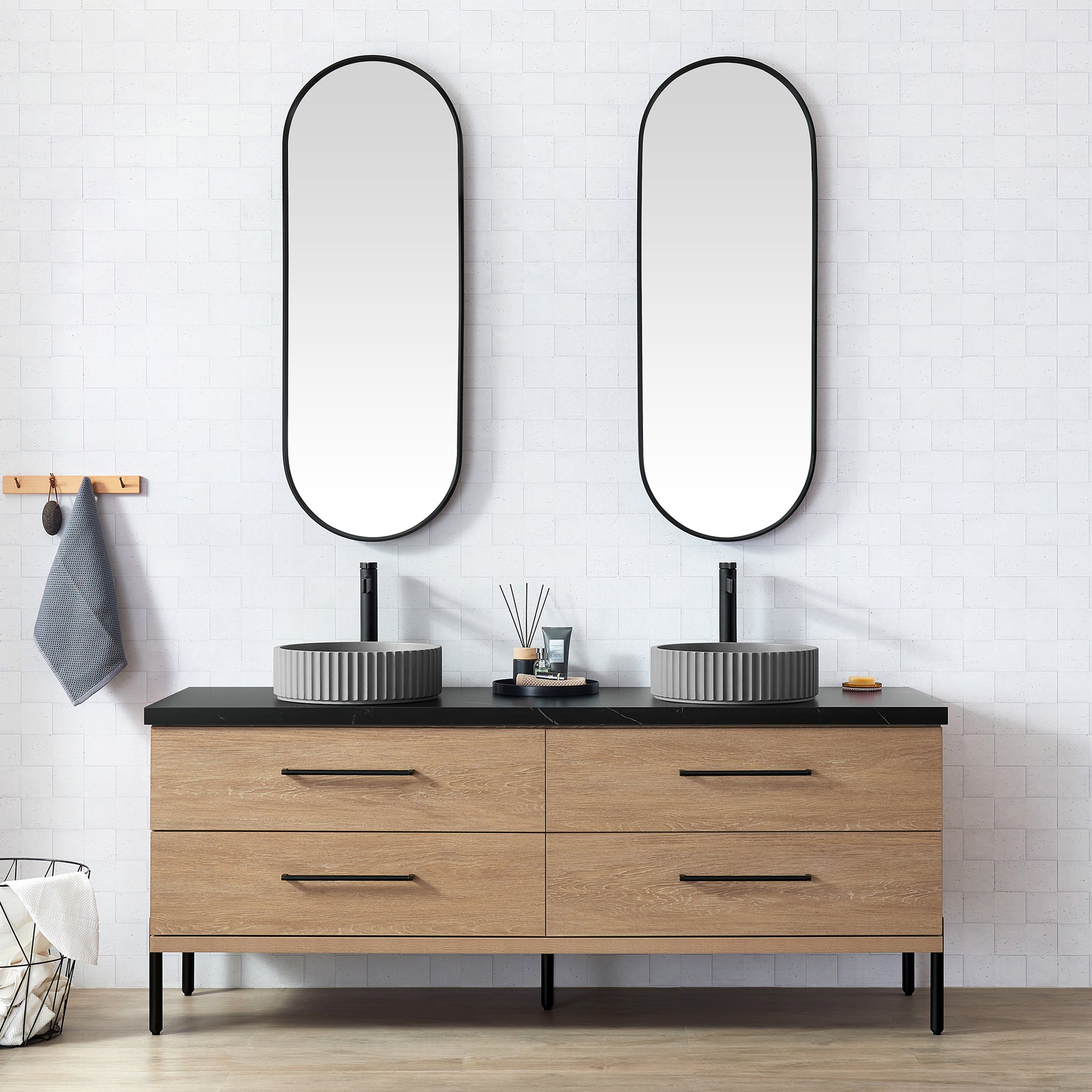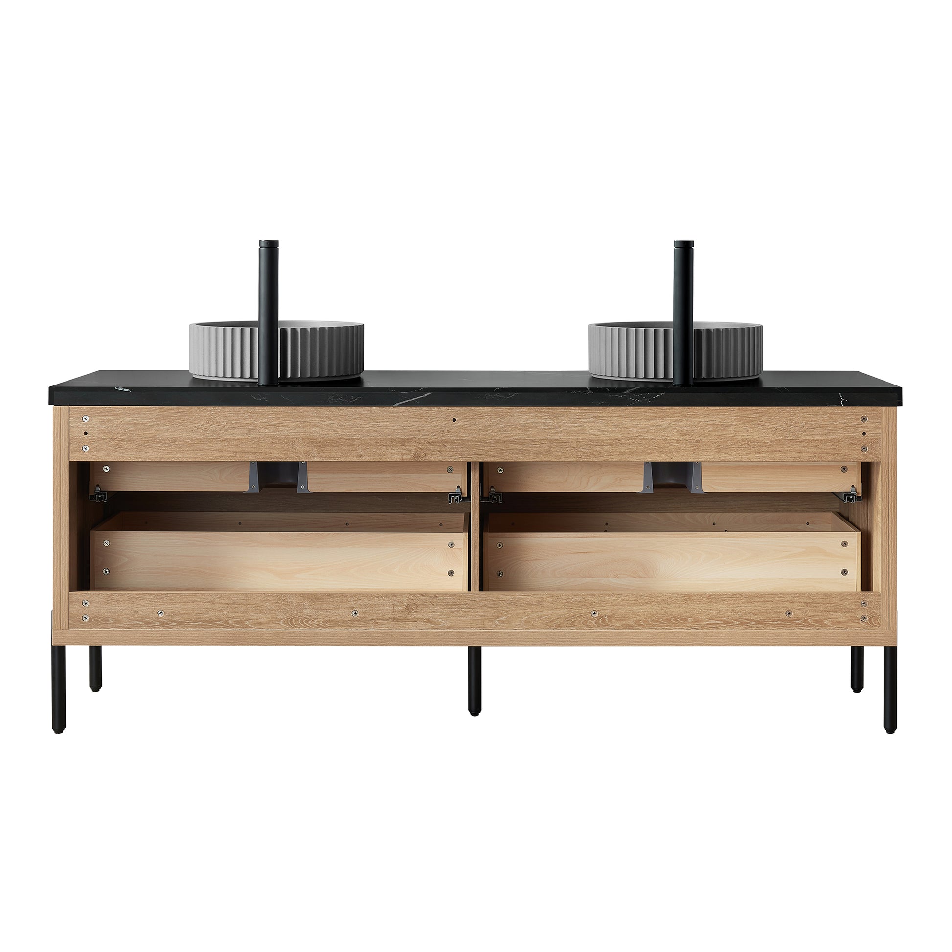 Vinnova, Trento 72B" Double Sink Bath Vanity in North American Oak with Black Sintered Stone Top with Concrete Sink and Mirror