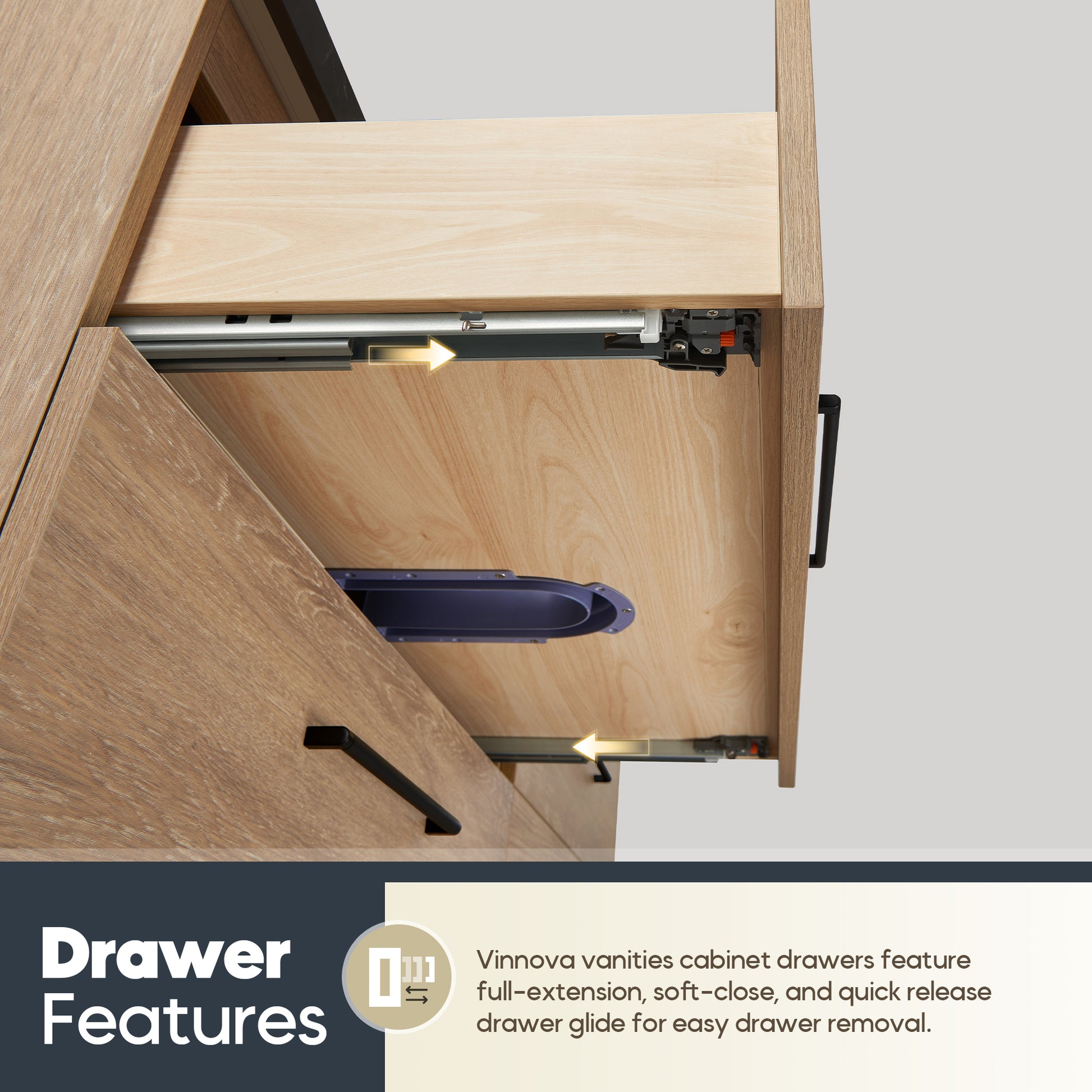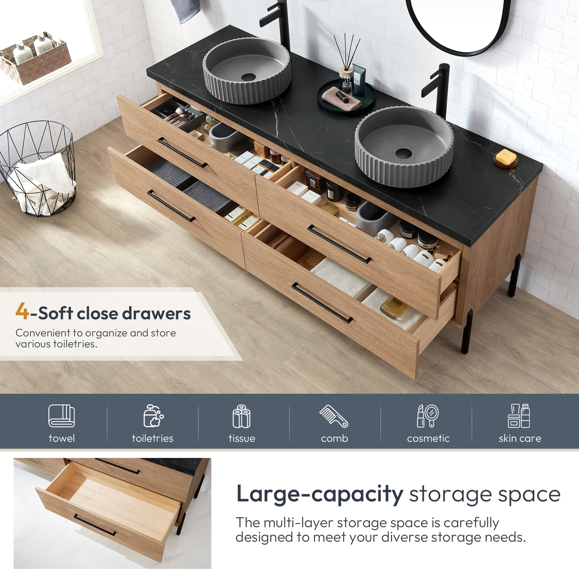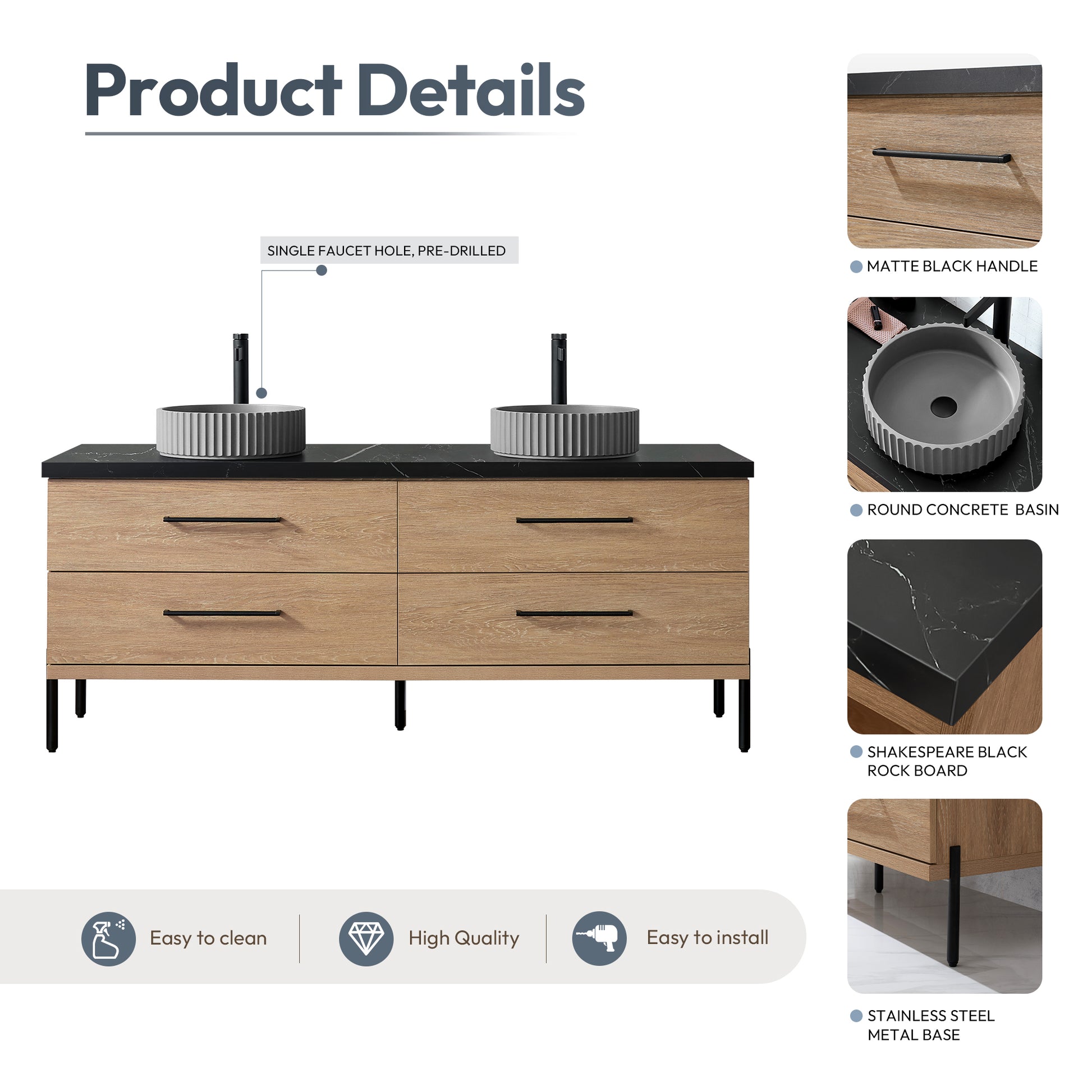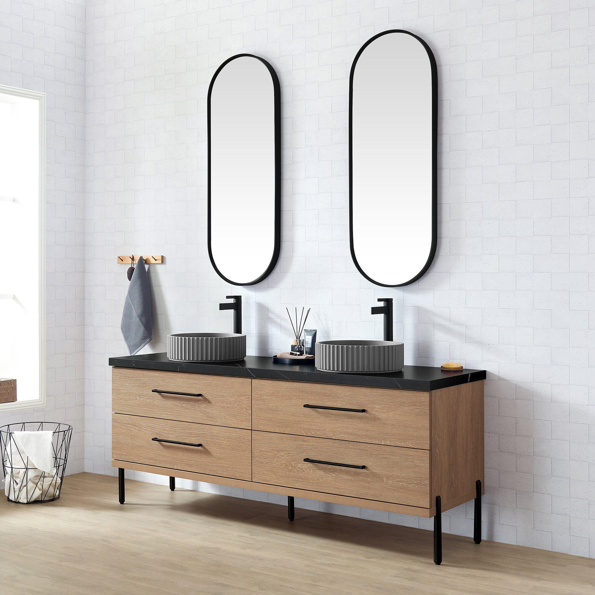 Transform your bathroom into a sophisticated oasis with the Trento 72B Double Sink Bath Vanity in North American Oak with Black Sintered Stone Top with Concrete Sink and Mirror.