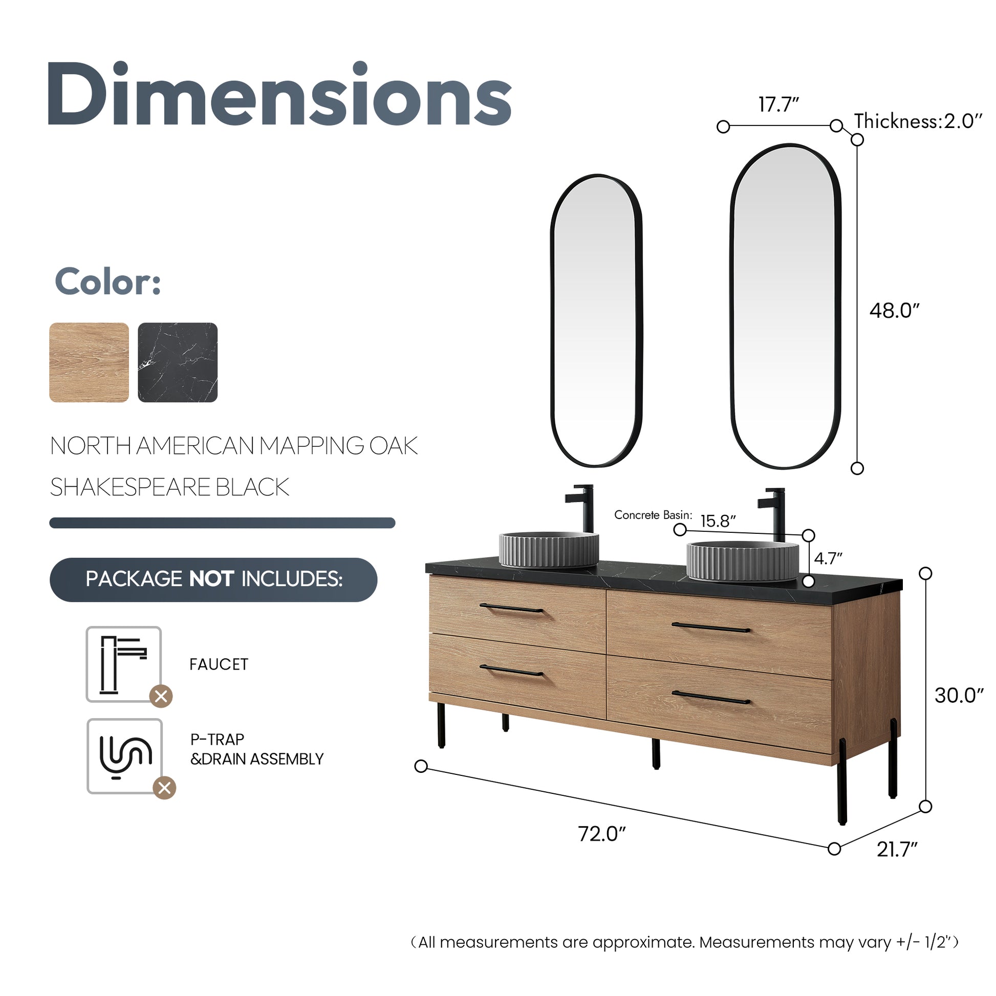 Elevate your bathroom with the Trento 72B Double Sink Bath Vanity in North American Oak. This stunning set features a sleek Black Sintered Stone Top with Concrete Sink and Mirror, perfect for adding a touch of modern elegance to your space.