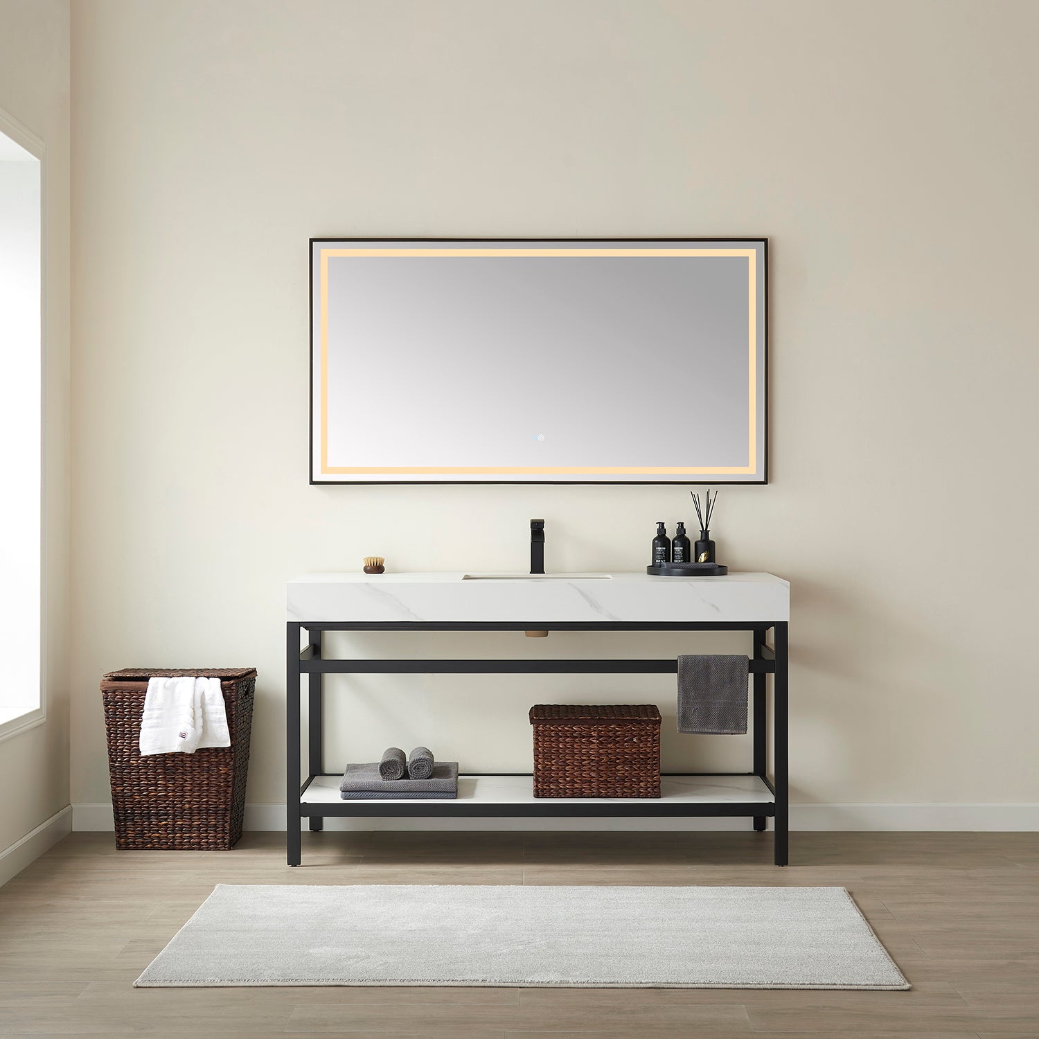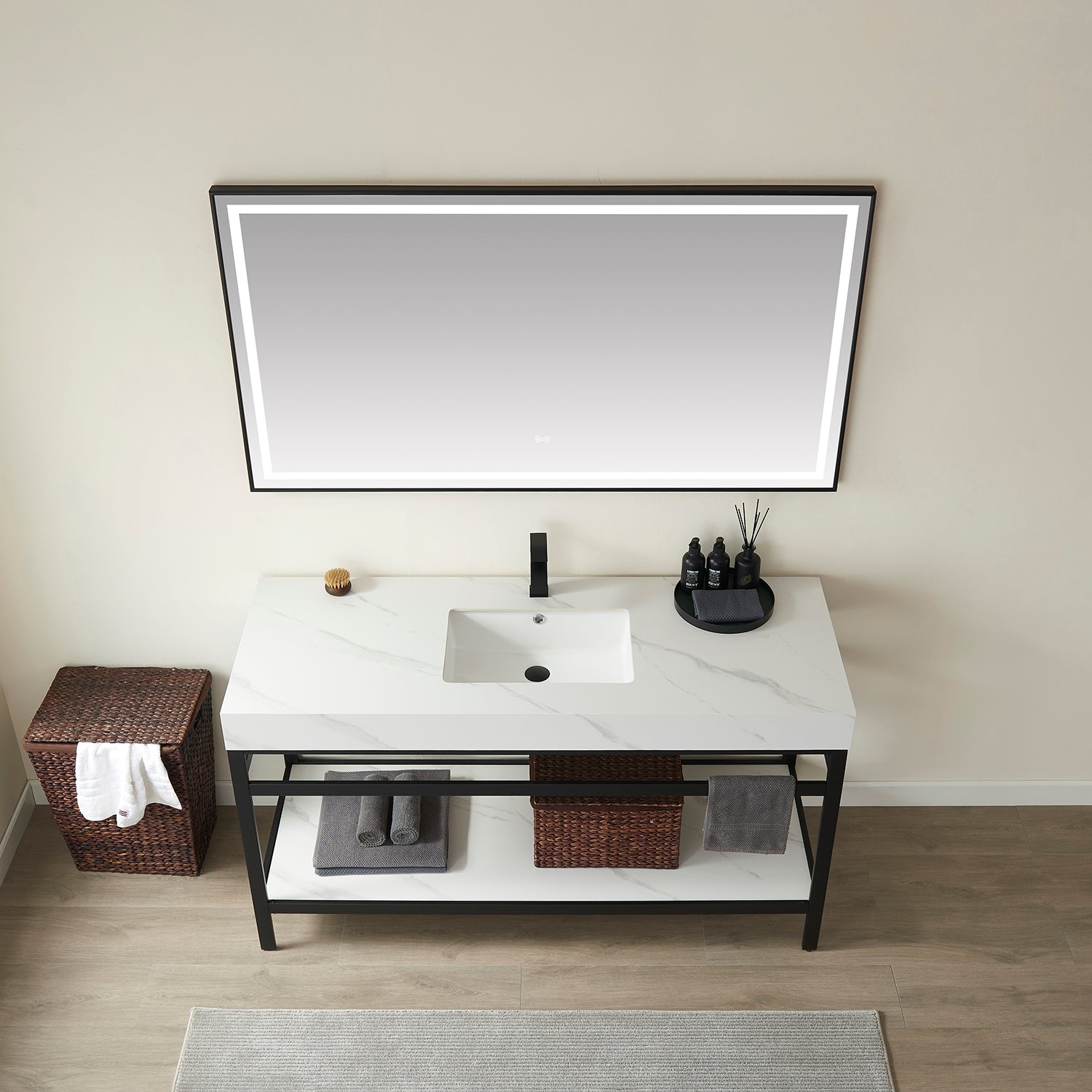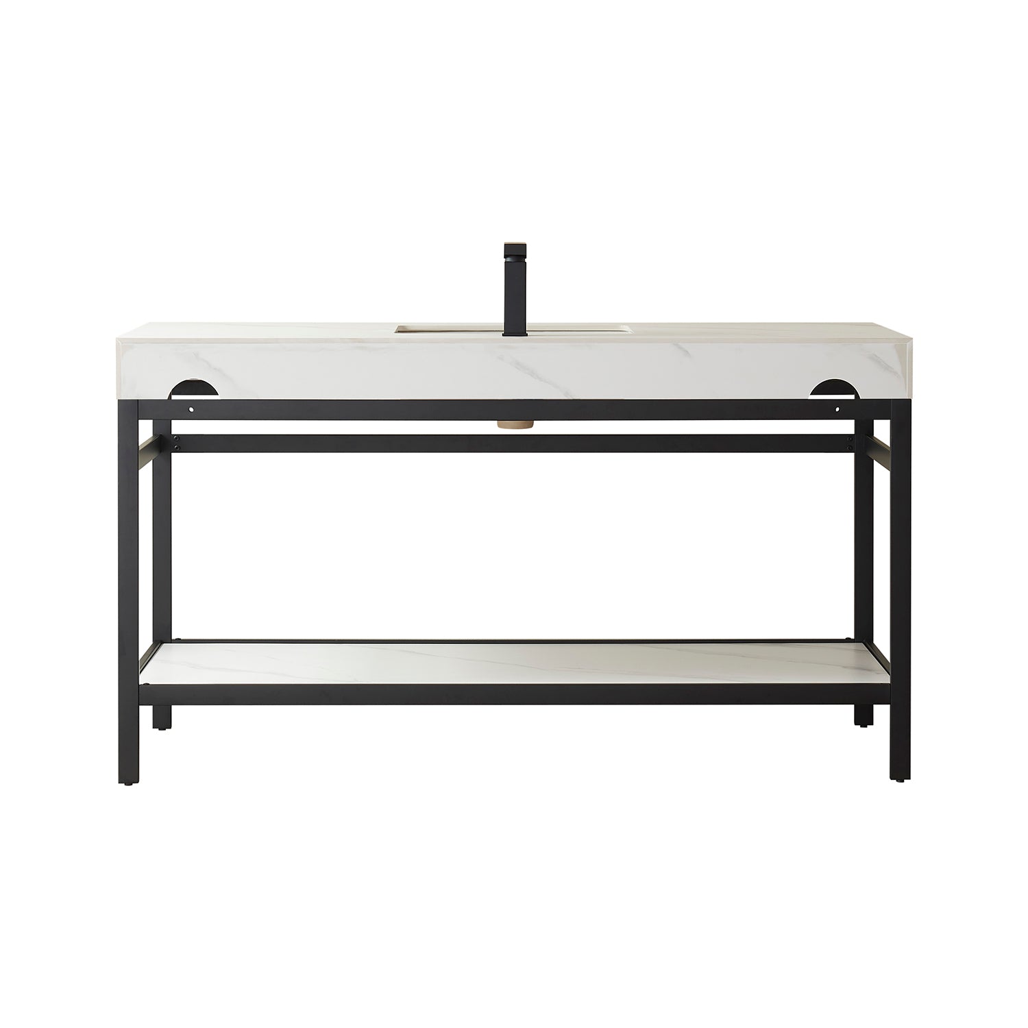 Vinnova, Funes 60" Single Sink Bath Vanity in Matt Black Metal Support with White Sintered Stone Top and Mirror