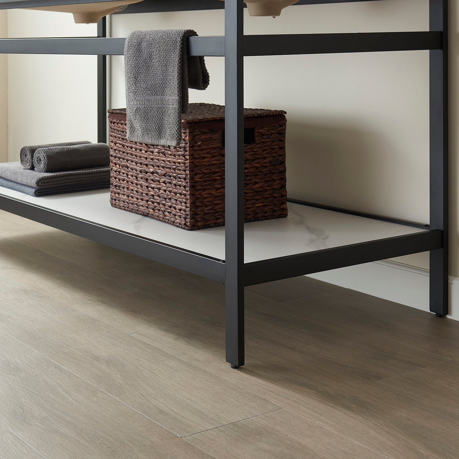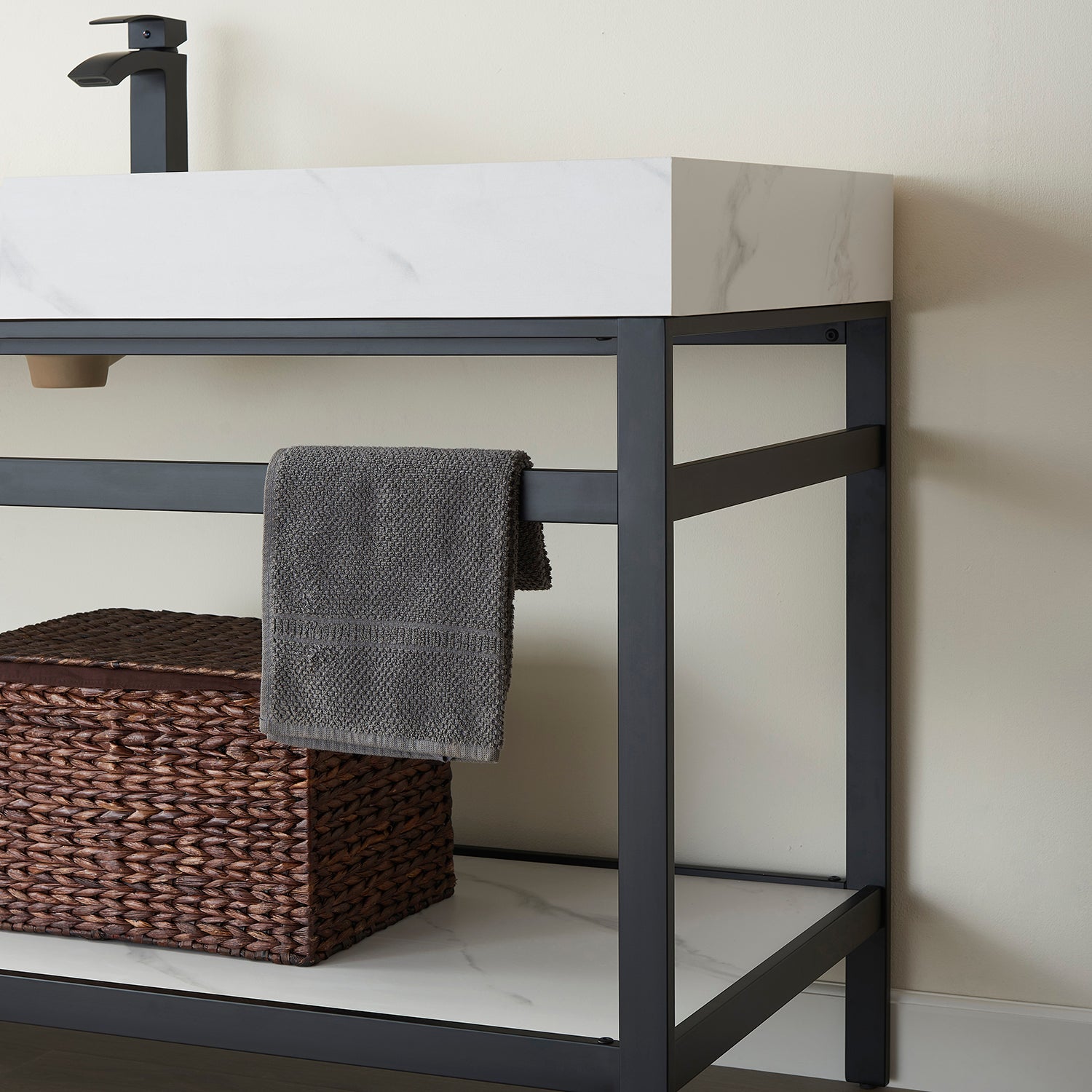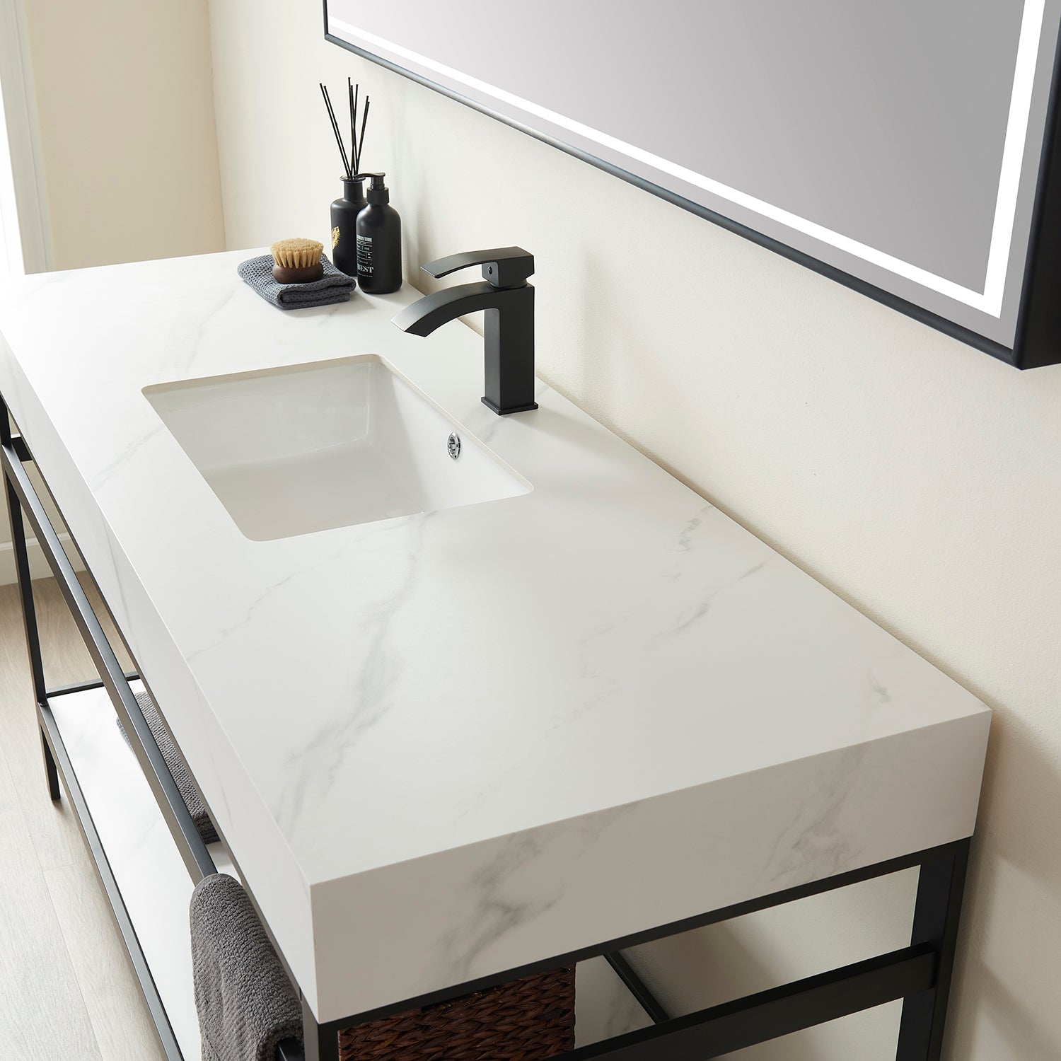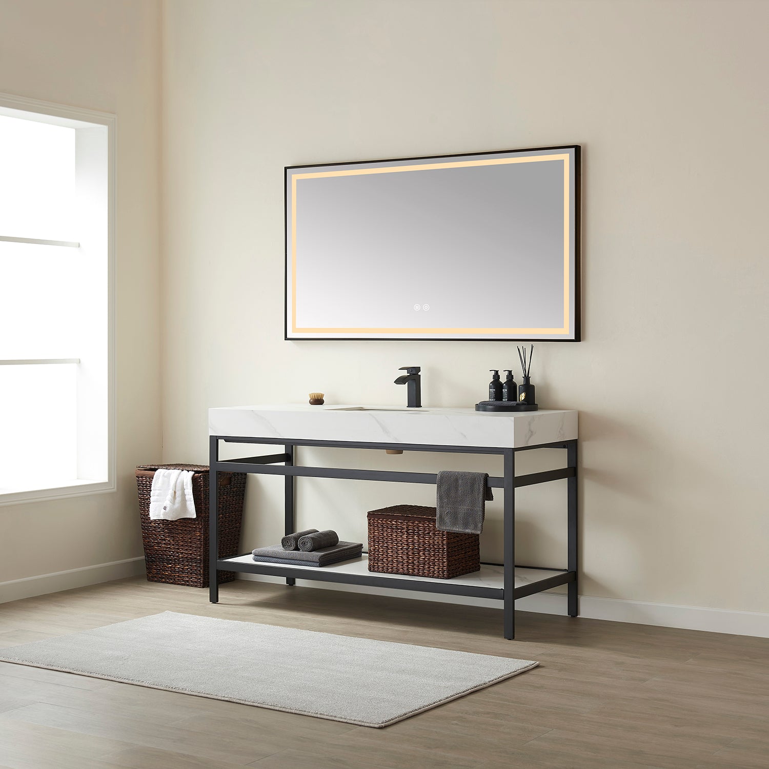 Vinnova, Funes 60" Single Sink Bath Vanity in Matt Black Metal Support with White Sintered Stone Top and Mirror