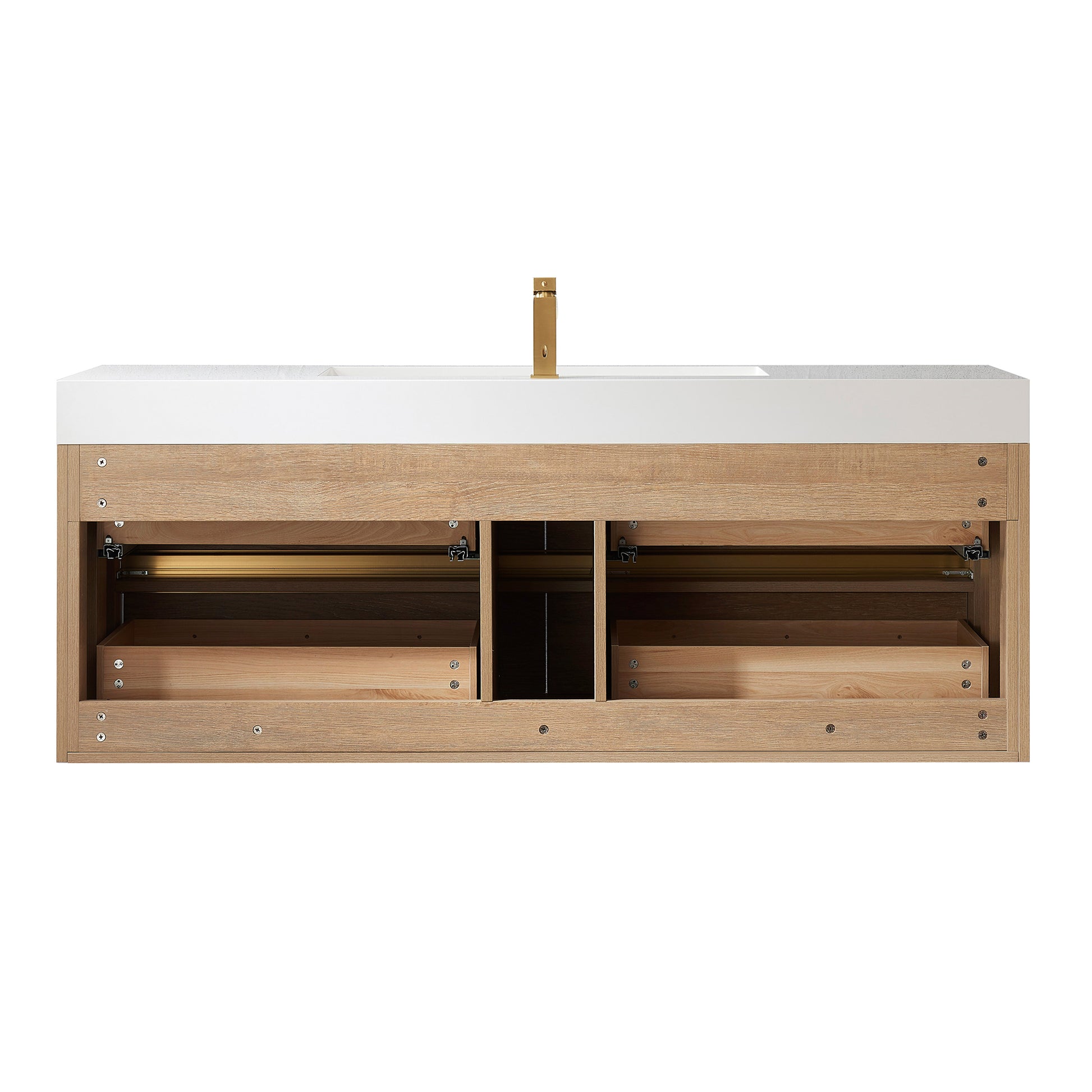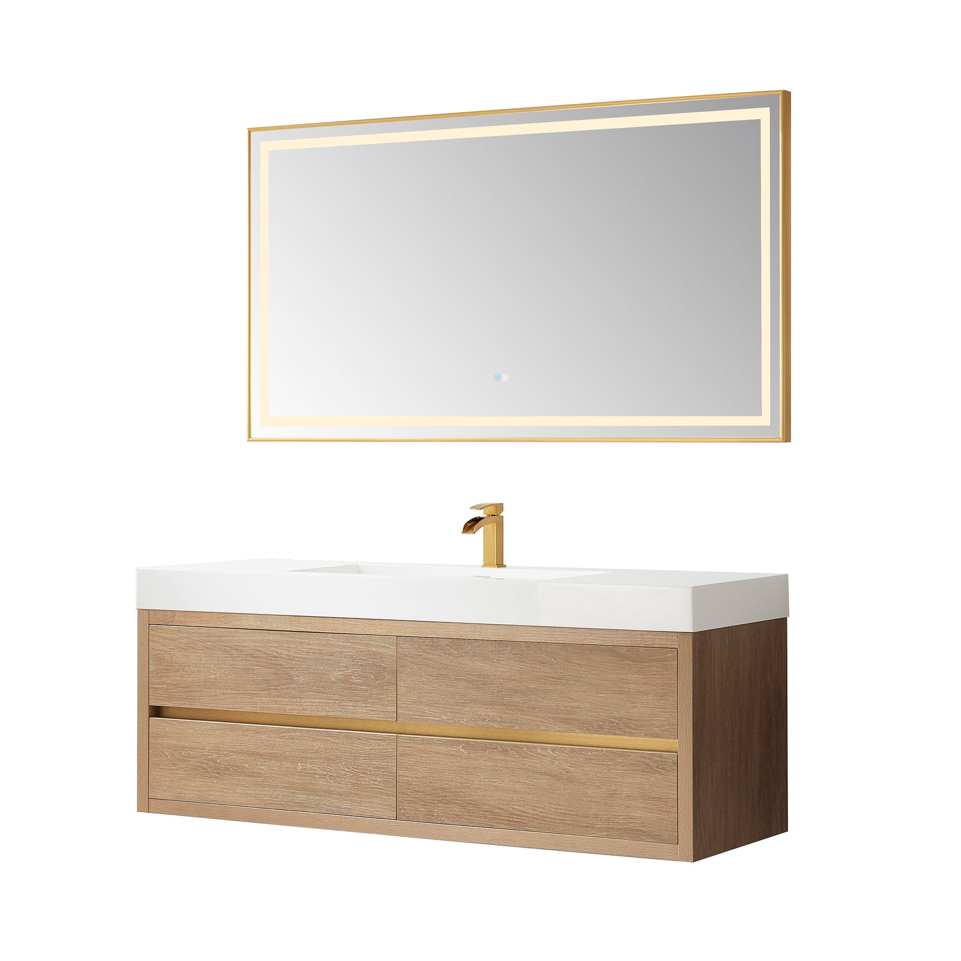 Vinnova, Palencia 60" Single Sink Wall-Mount Bath Vanity in North American Oak with White Composite Integral Square Sink Top and Mirror