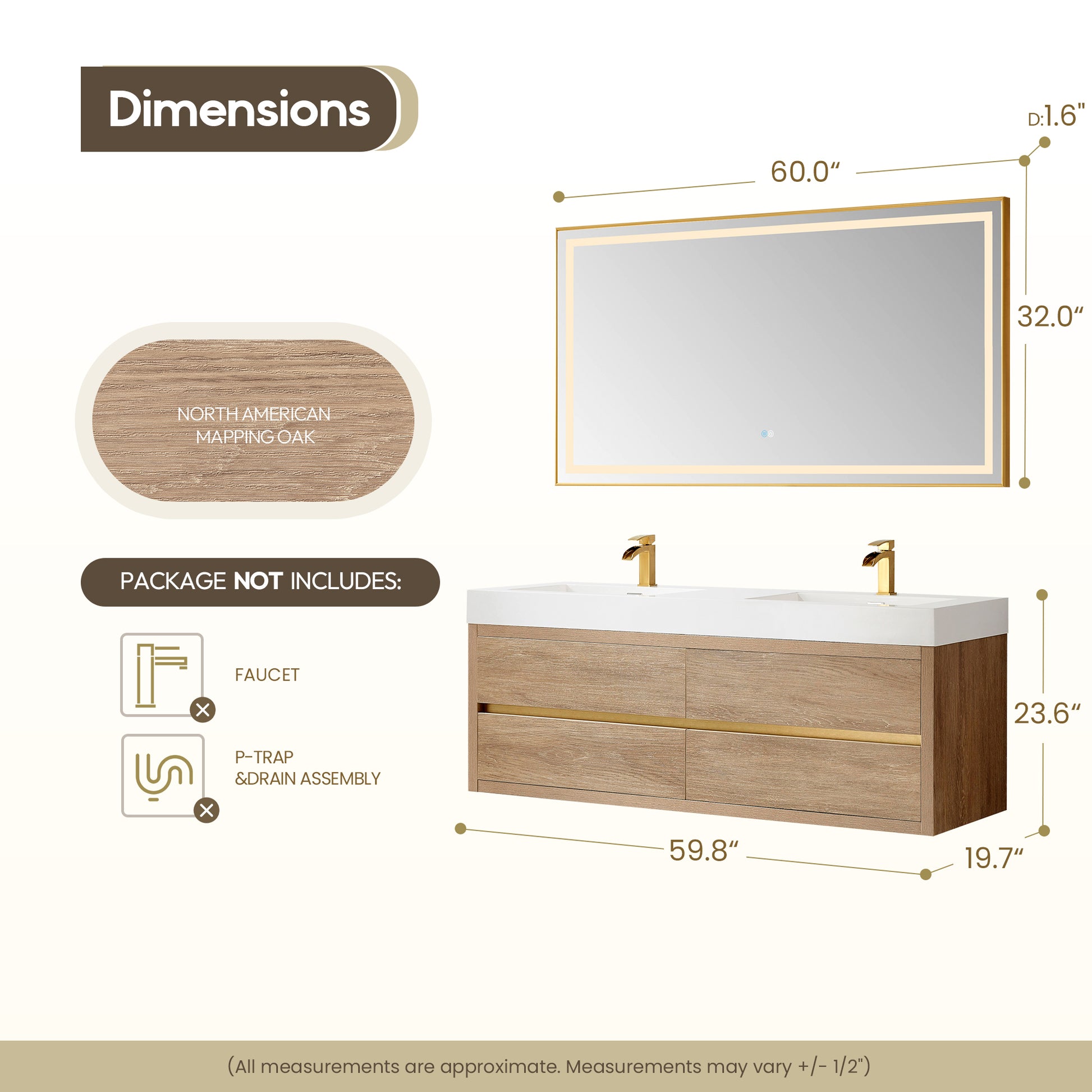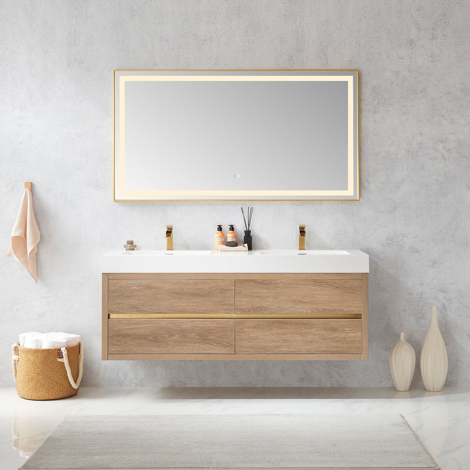 Introducing the Palencia 60M Double Sink Wall-Mount Bath Vanity in North American Oak - Transform Your Bathroom with Style and Functionality