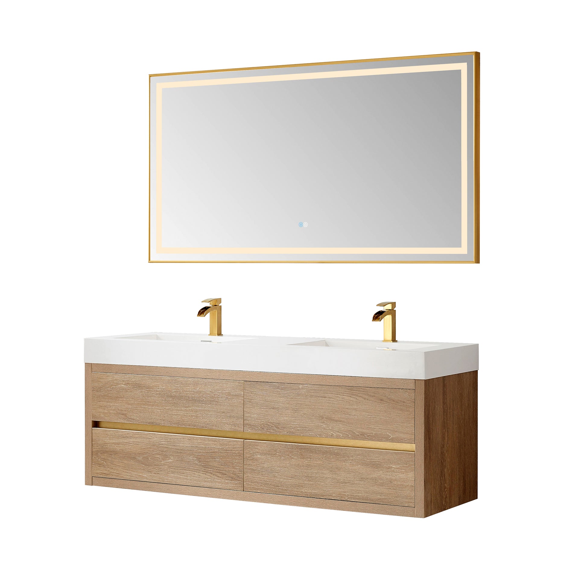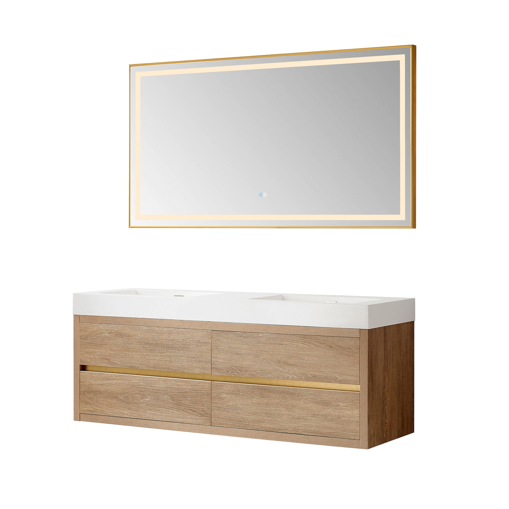 Vinnova, Palencia 60M" Double Sink Wall-Mount Bath Vanity in North American Oak with White Composite Integral Square Sink Top and Mirror