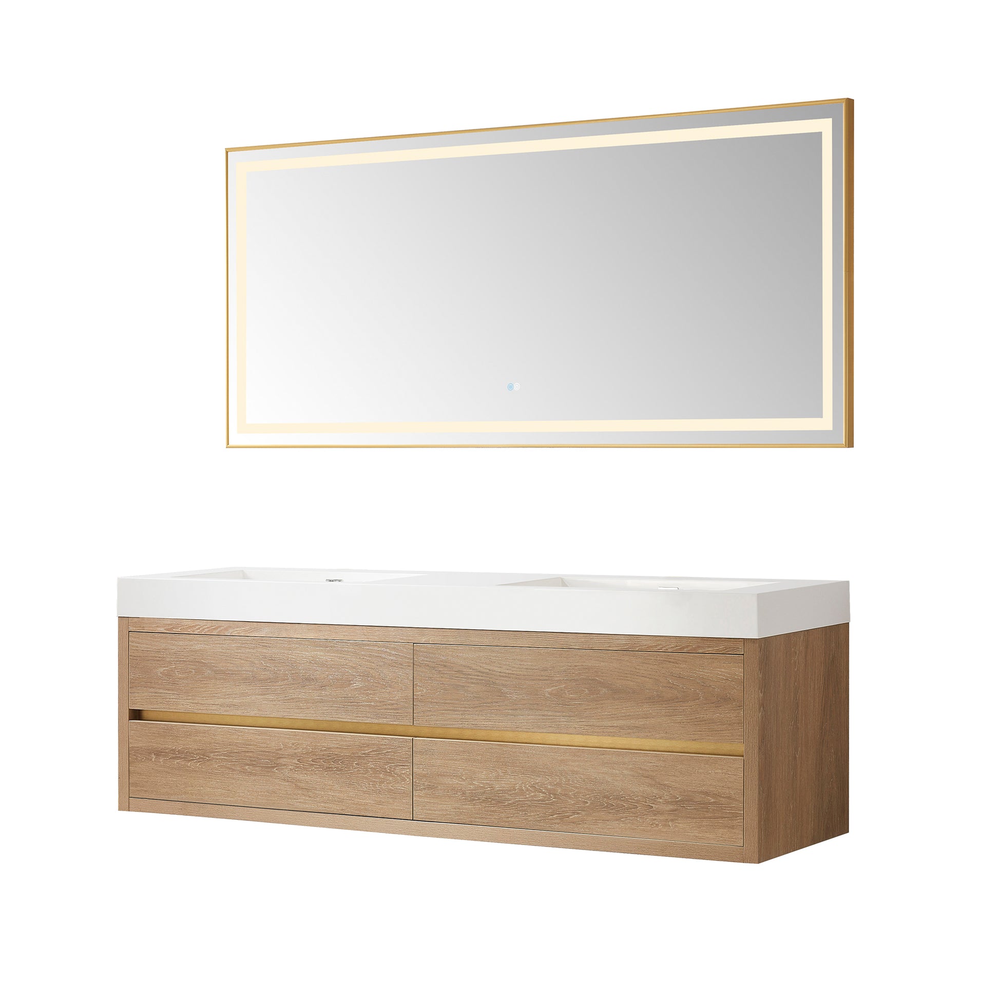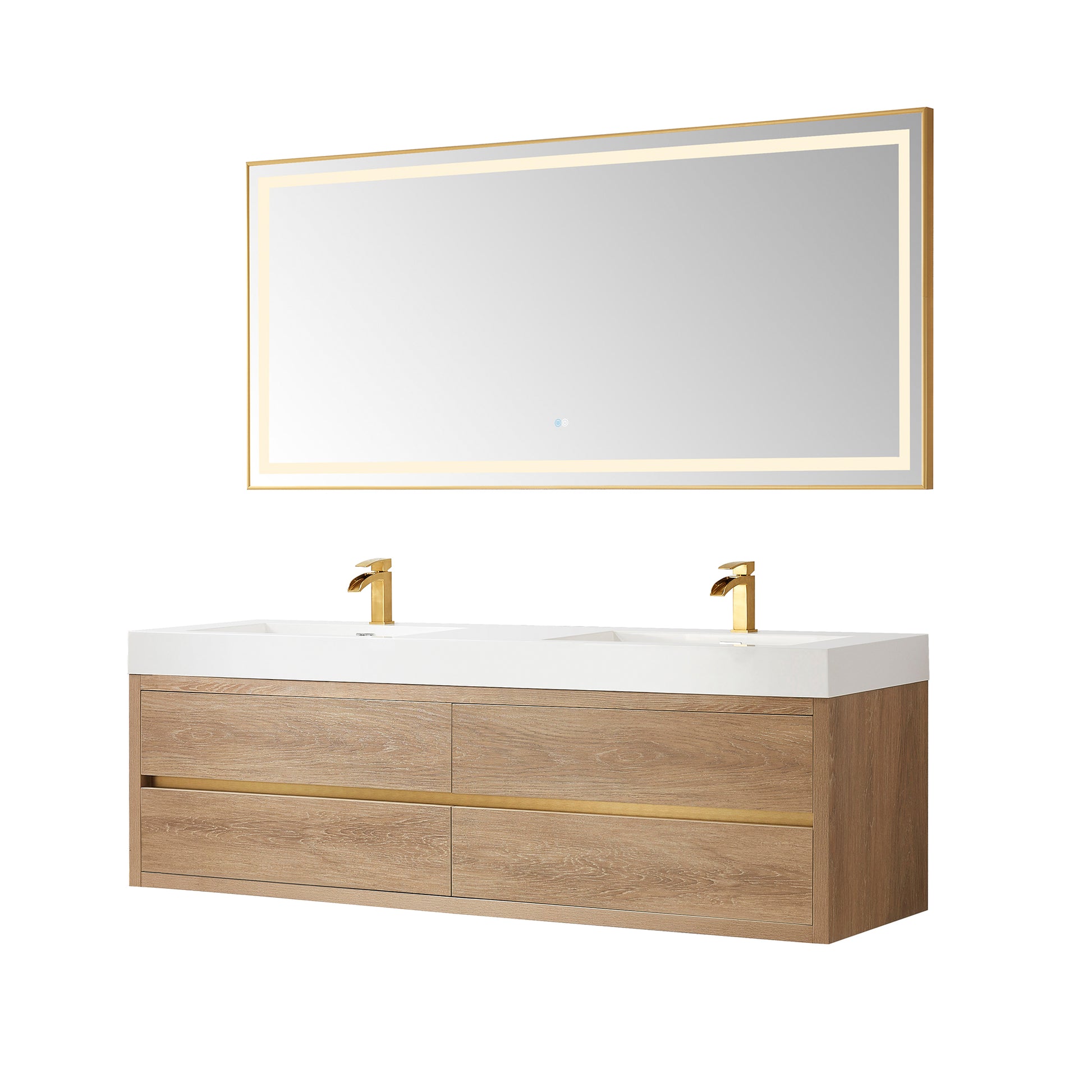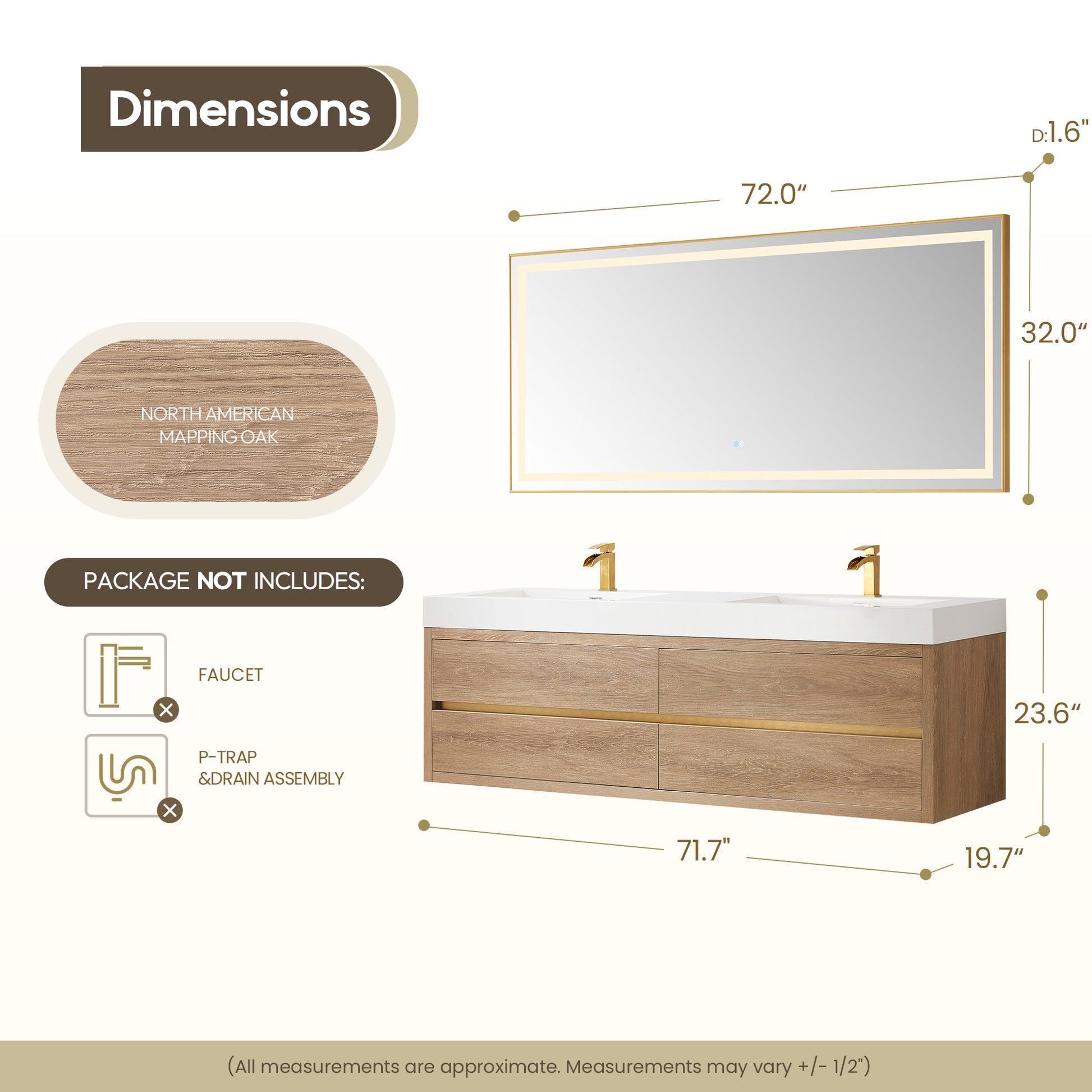 Vinnova, Palencia 72" Double Sink Wall-Mount Bath Vanity in North American Oak with White Composite Integral Square Sink Top and Mirror