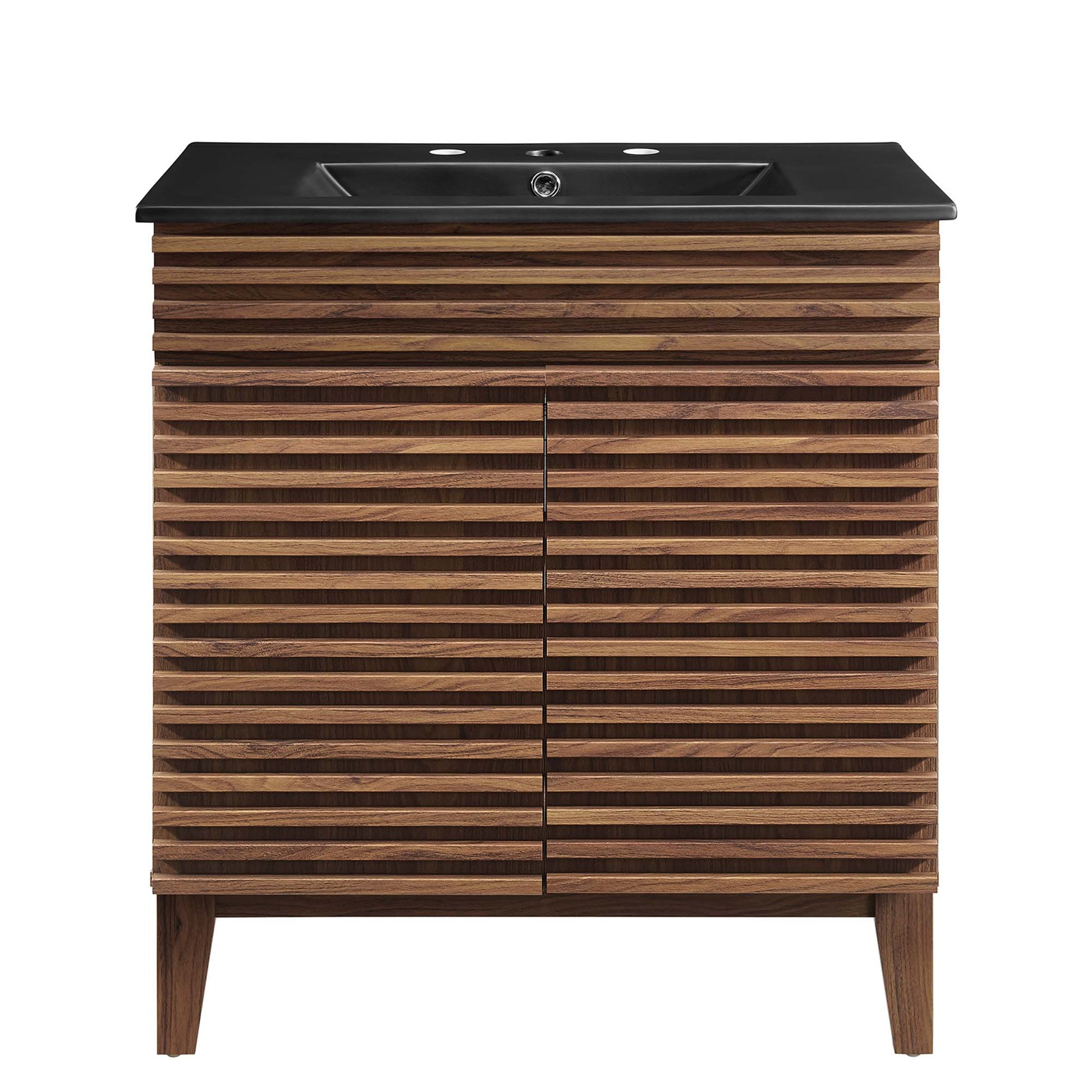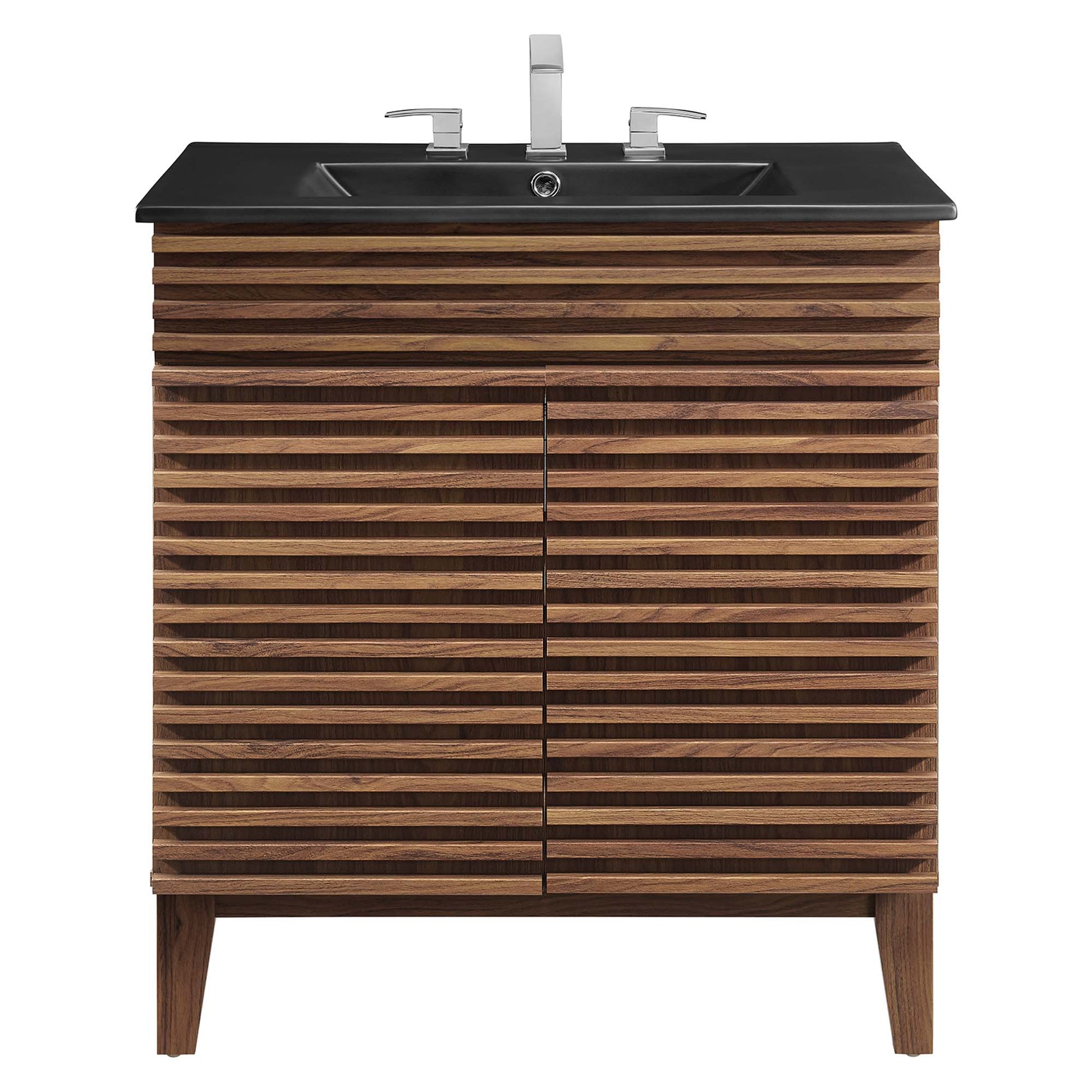 Tap into mid-century aesthetics with the Render Vanity. Render Bathroom Vanity features a durable particleboard frame with smooth laminate, four tapered wood legs, and adjustable storage shelf behind two soft-close hinged doors. A curved ceramic basin and integrated countertop with three faucet holes create sleek lines and crisp design for an edgy style designed to meet your needs. Boasting a mid-century modern style this vanity features a solid construction with a pleasing look and practical functionality. 8" widespread faucet holes. Assembly required and fixtures not included.Mid-Century Modern Style Adjustable Storage Shelf Soft-Close Doors 8" Centerset Holes Integrated Countertop Particleboard and Laminate Construction Assembly Required