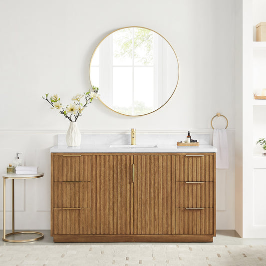 Vinnova, Bangkok 60" Single Sink Bath Vanity in Mango Wood Light Brown with White Grain Composite Stone Top