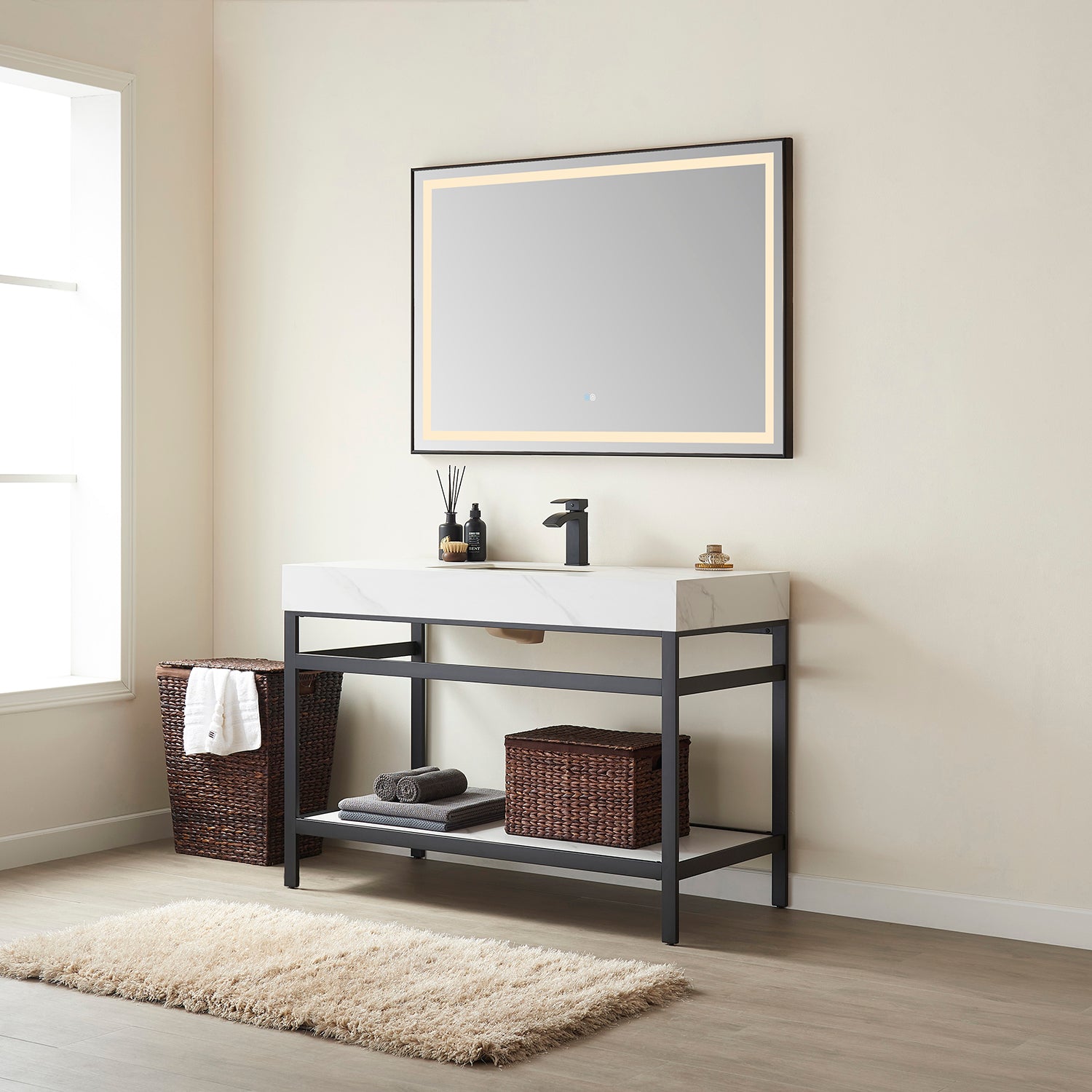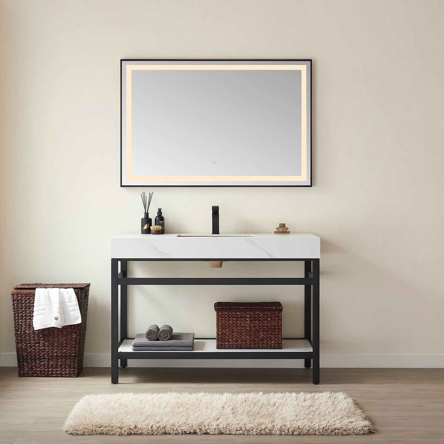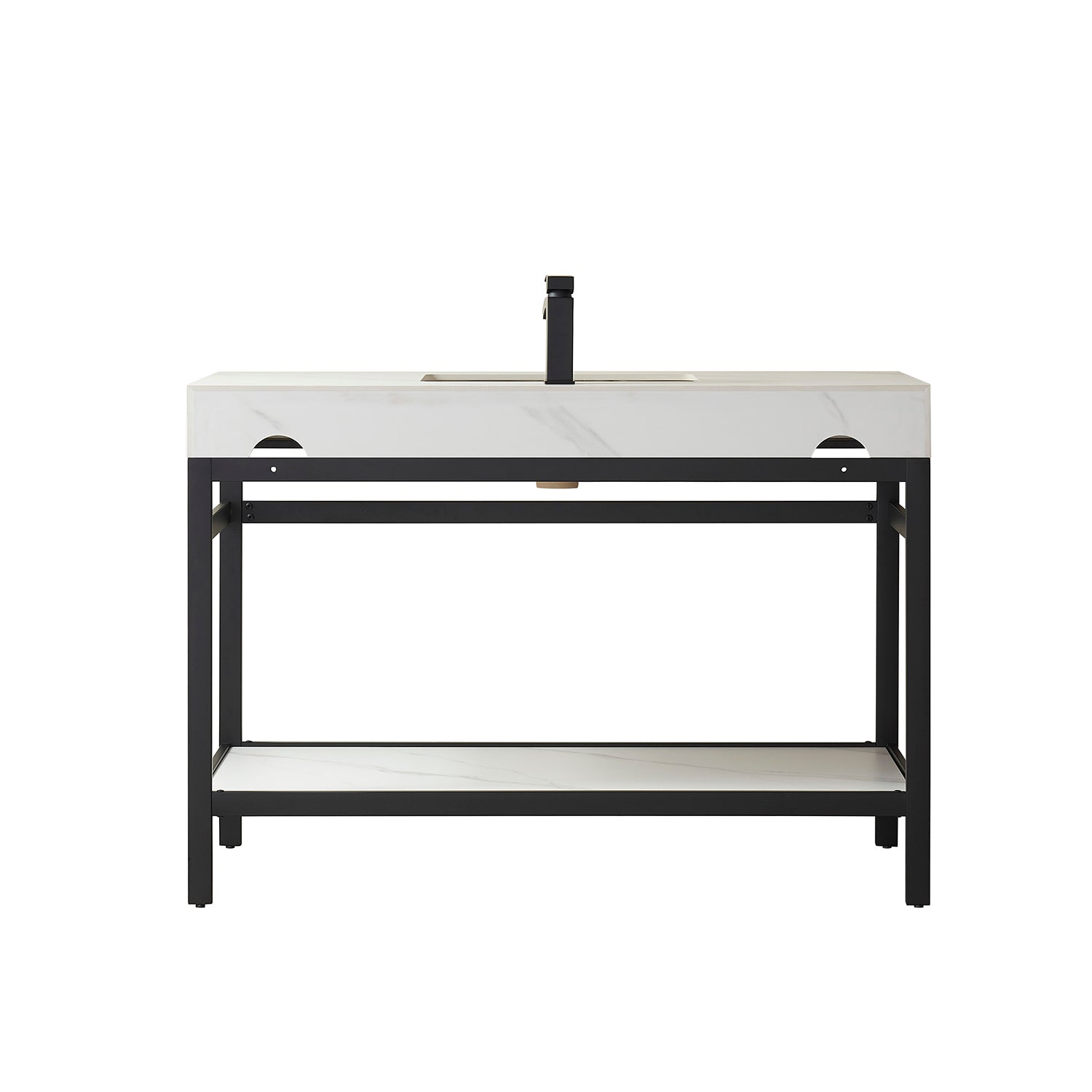 Vinnova, Funes 48" Single Sink Bath Vanity in Matt Black Metal Support with White Sintered Stone Top and Mirror
