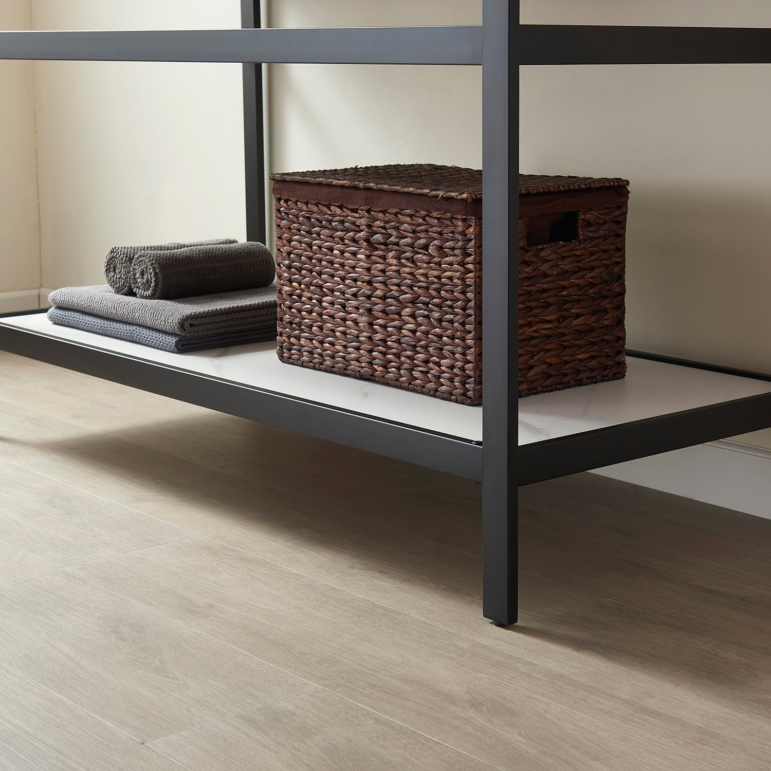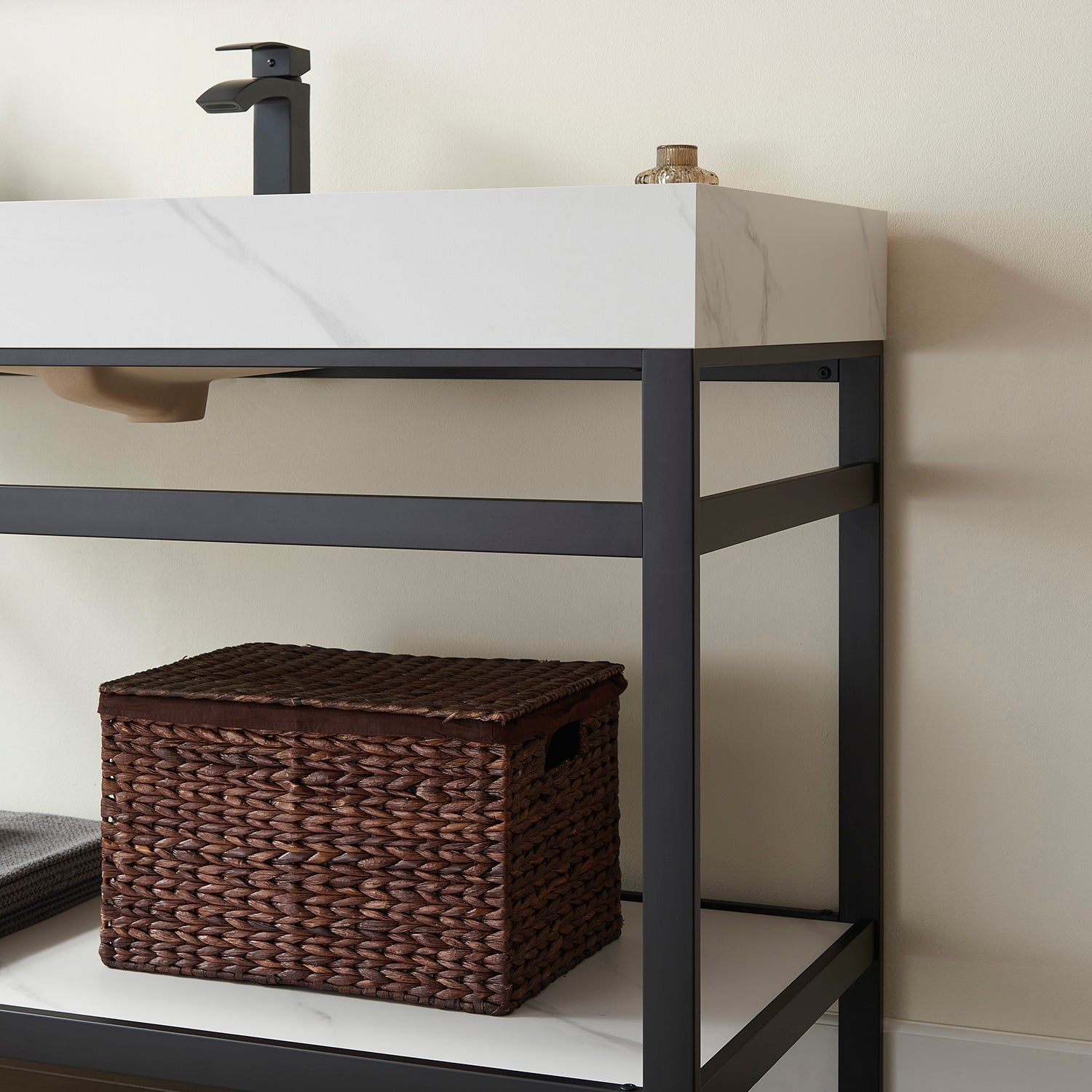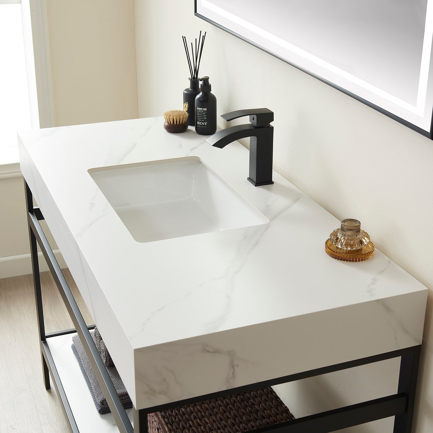Vinnova, Funes 48" Single Sink Bath Vanity in Matt Black Metal Support with White Sintered Stone Top and Mirror