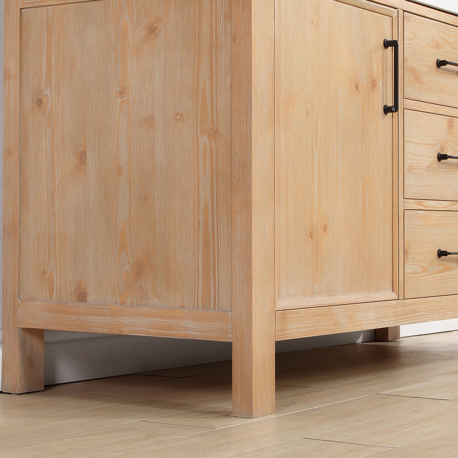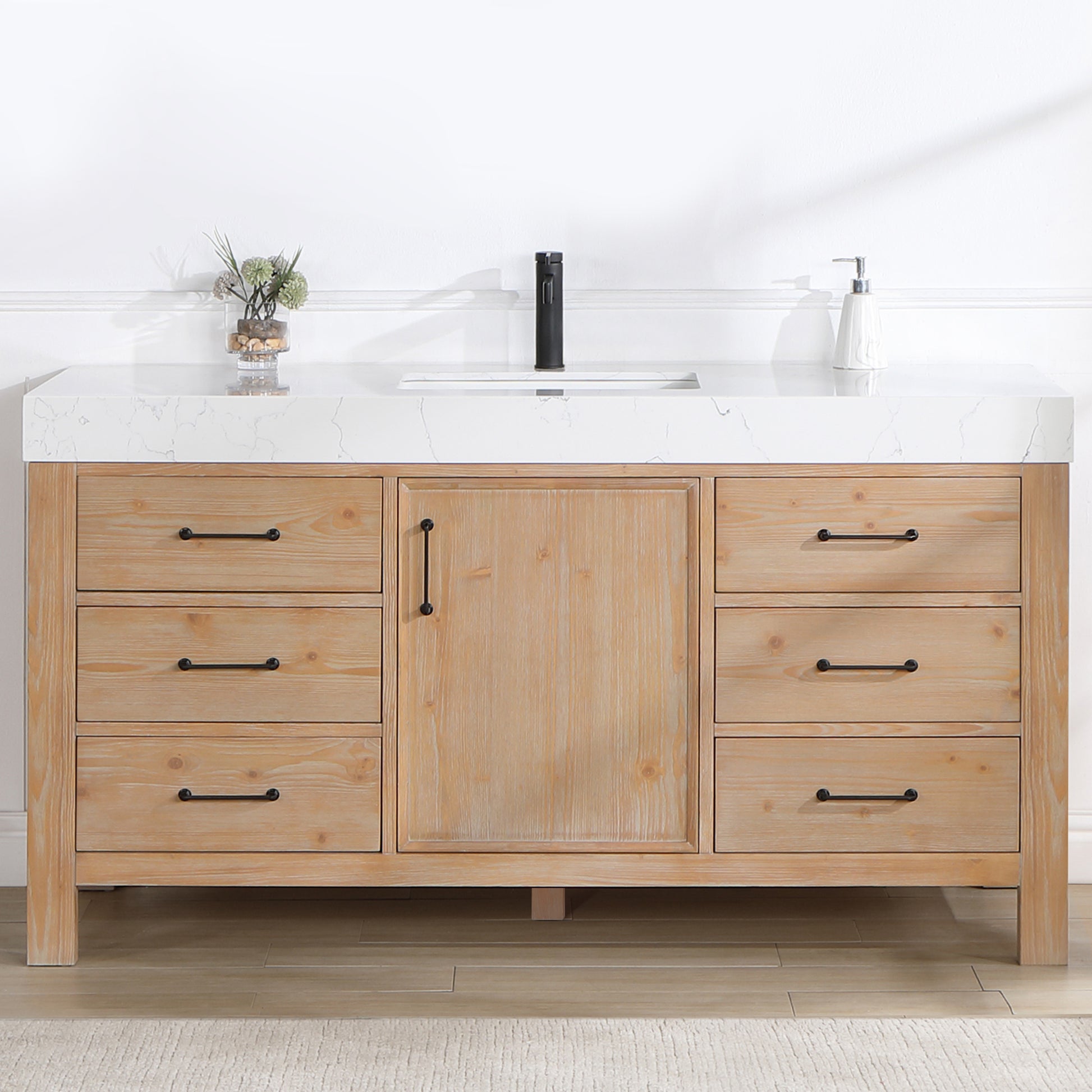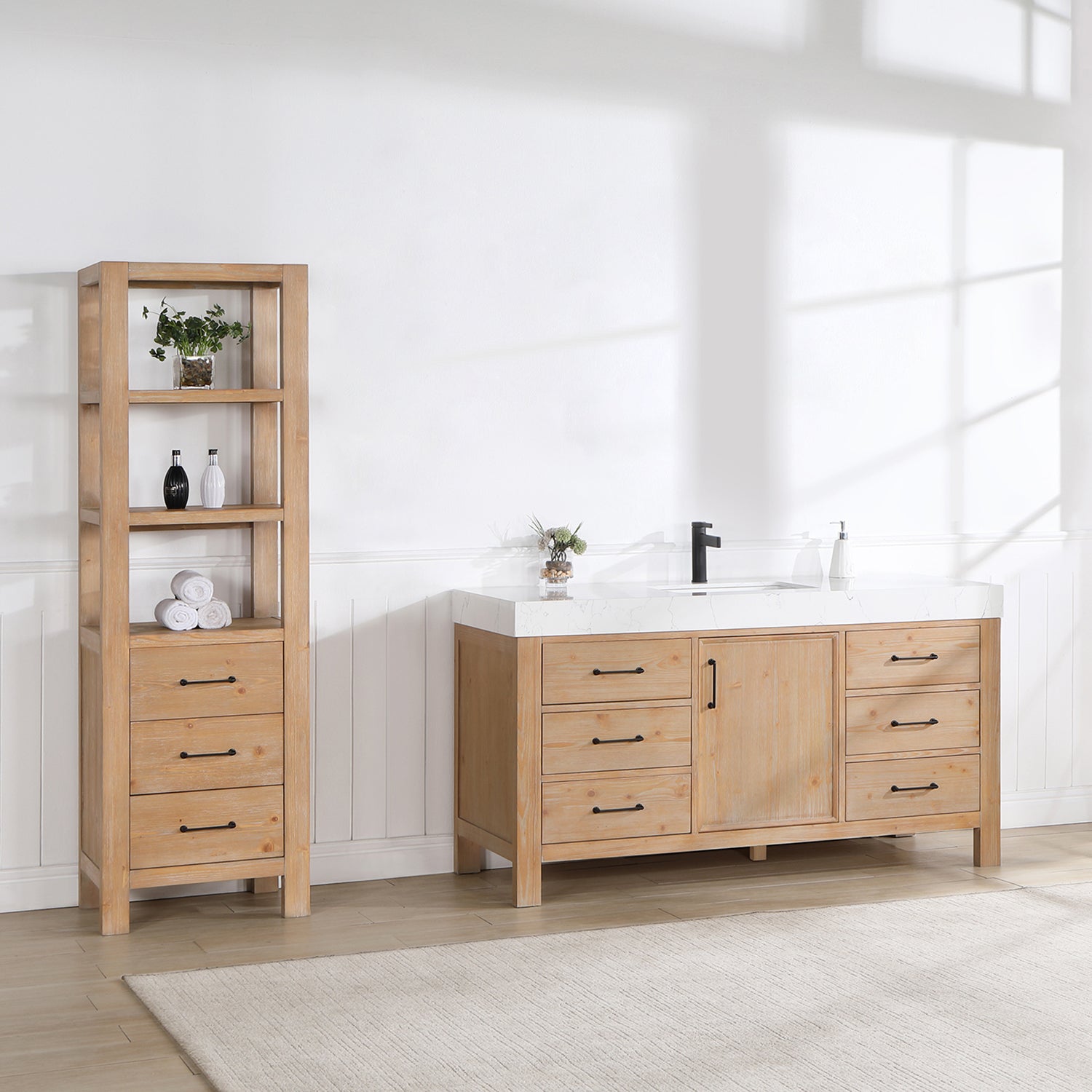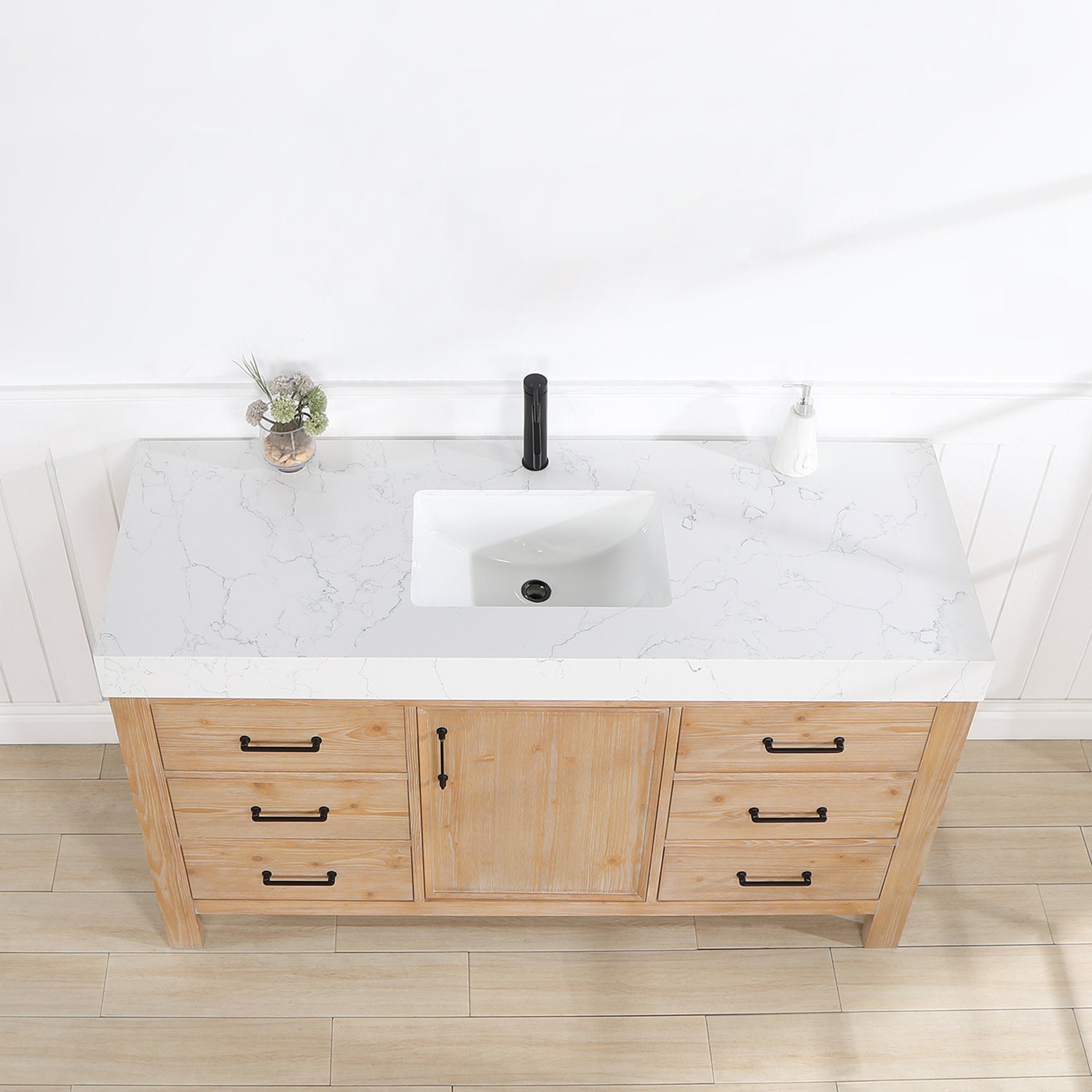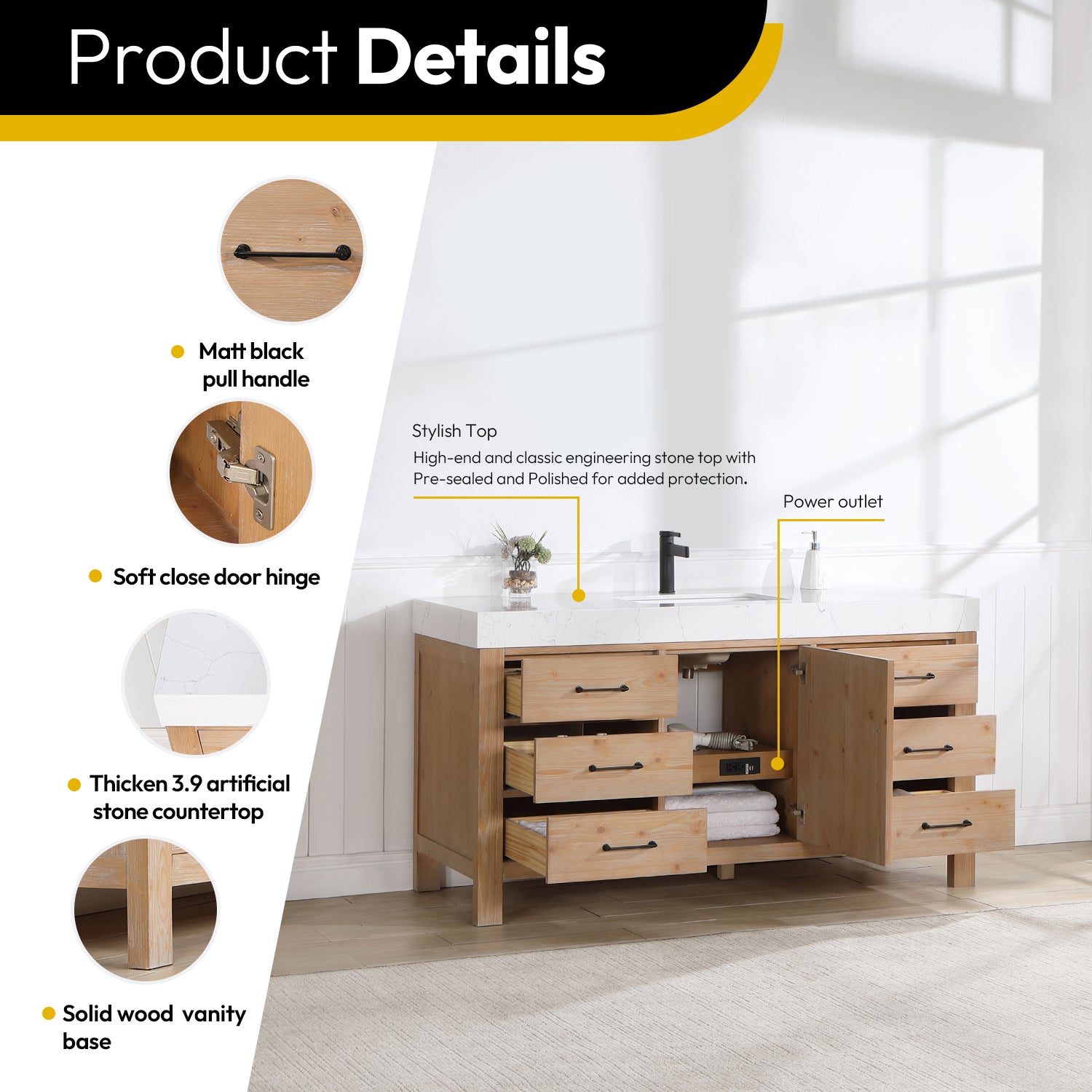 Vinnova, León 60in. Free-standing Single Bathroom Vanity in Fir Wood Brown with Composite top in Lightning White