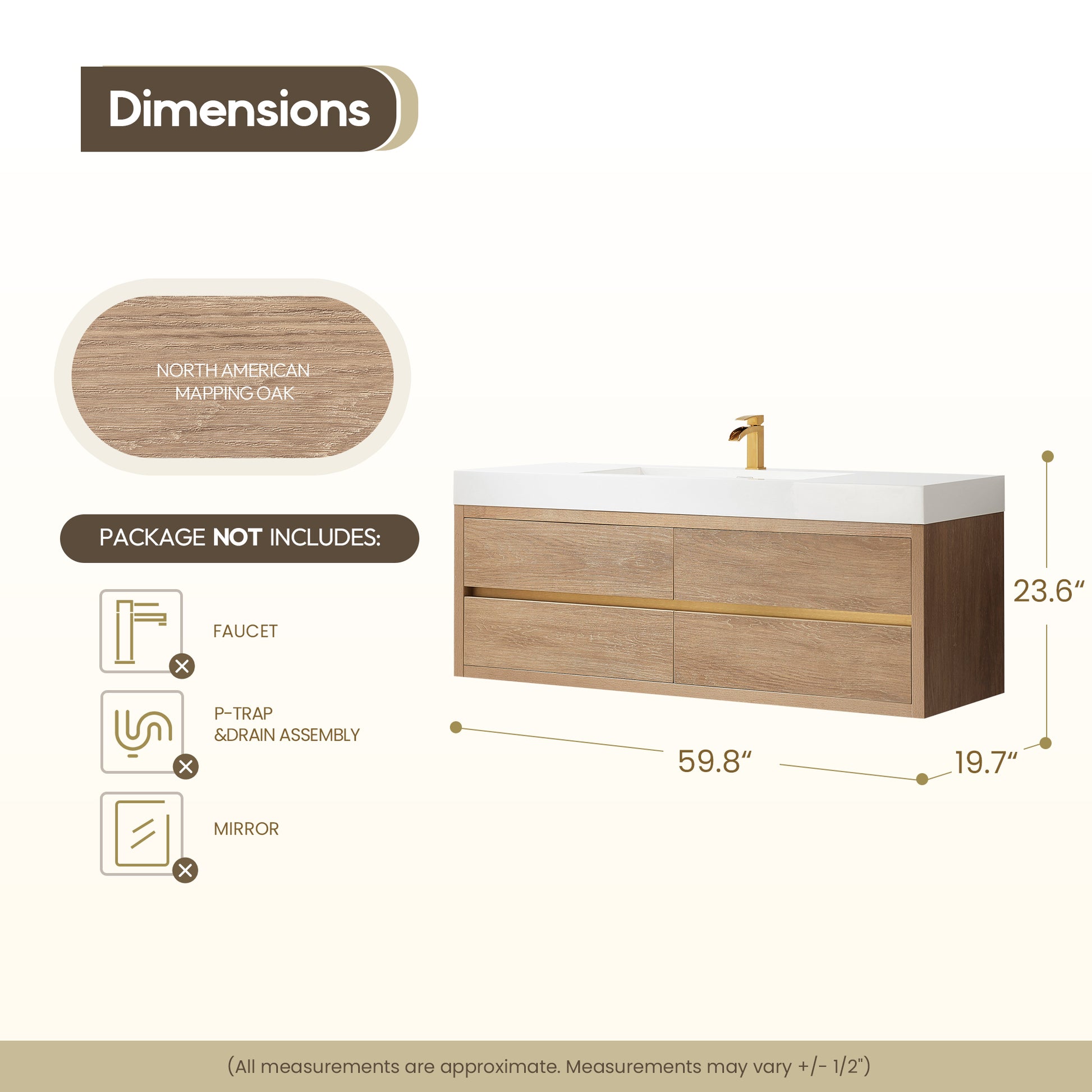 Vinnova, Palencia 60" Single Sink Wall-Mount Bath Vanity in North American Oak with White Composite Integral Square Sink Top