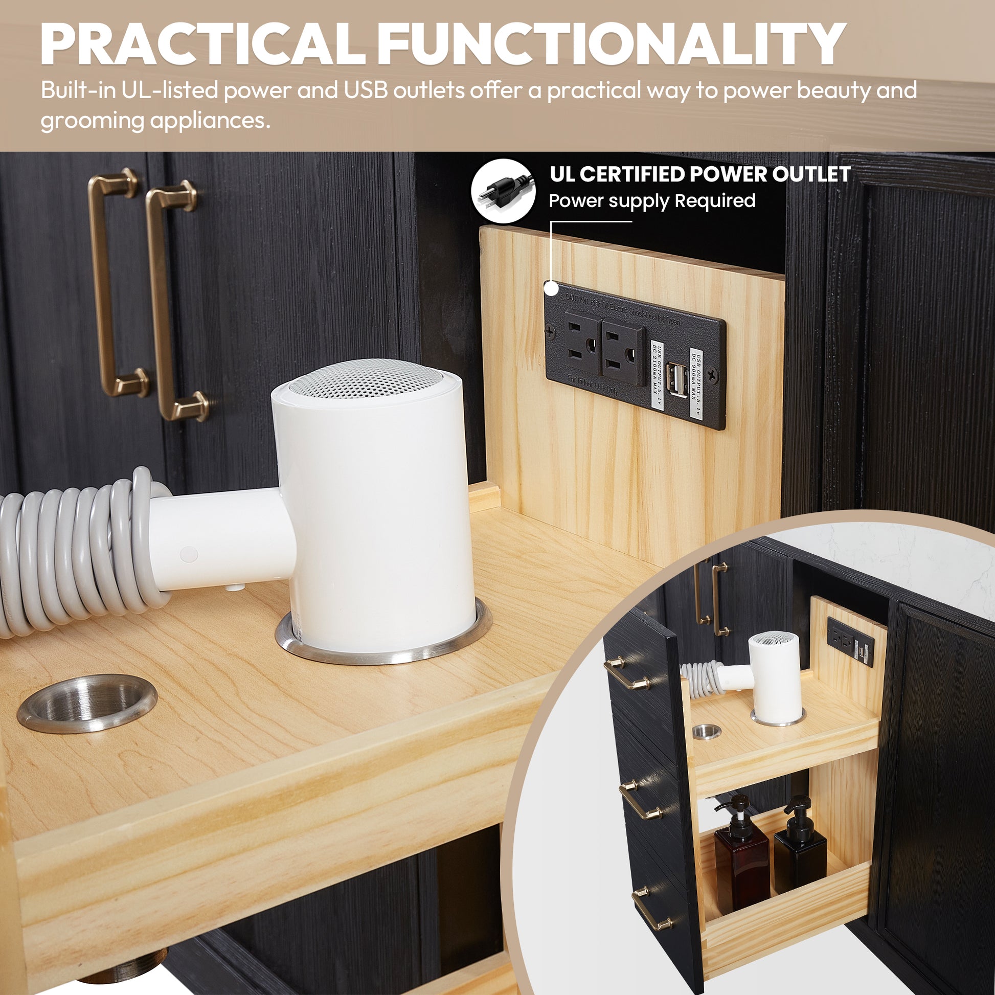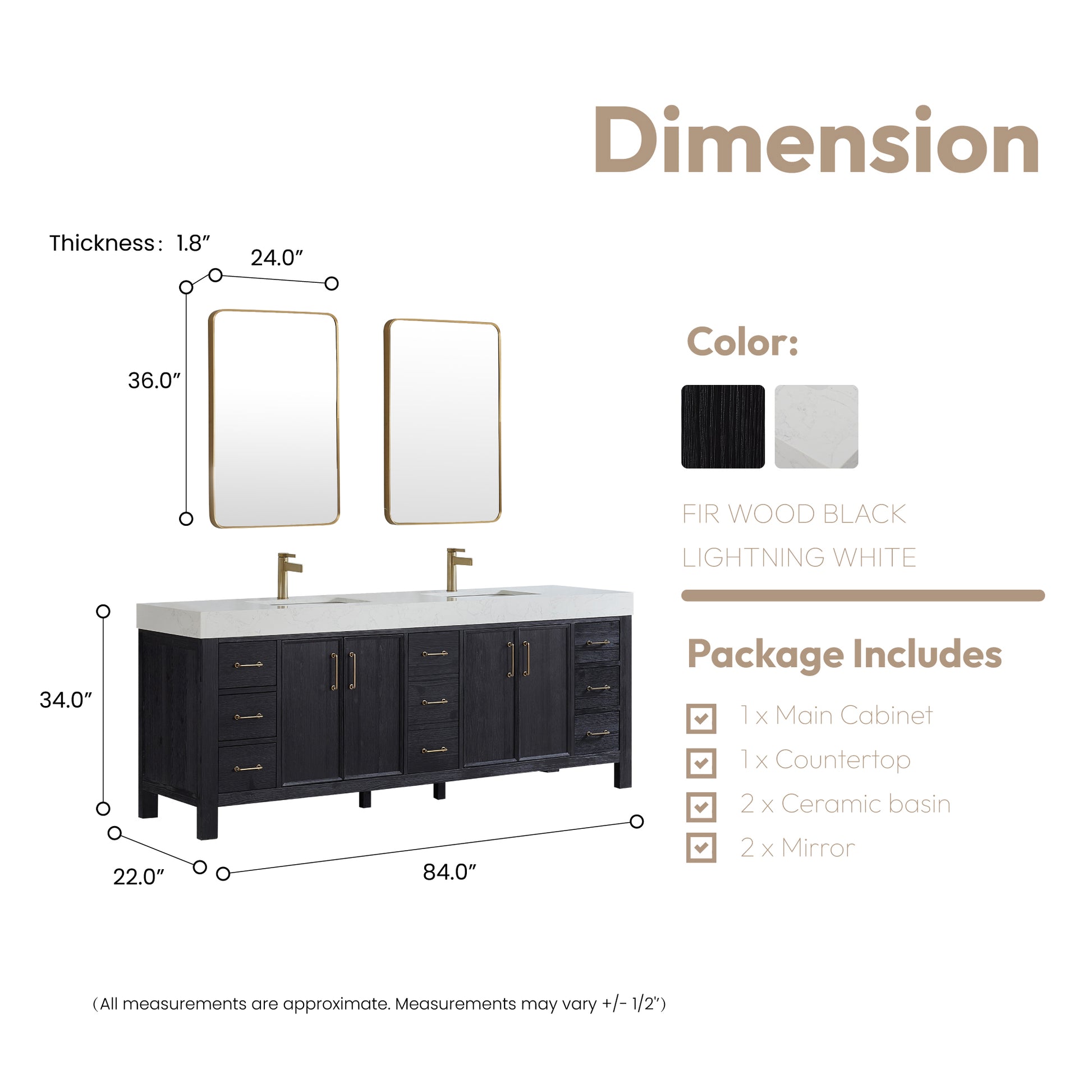 Description: The León 84in. Free-standing Double Bathroom Vanity in Fir Wood Black with Composite top in Lightning White and Mirror is the perfect addition to your bathroom. With its sleek design and ample storage space, this vanity will transform your space into a luxurious oasis.