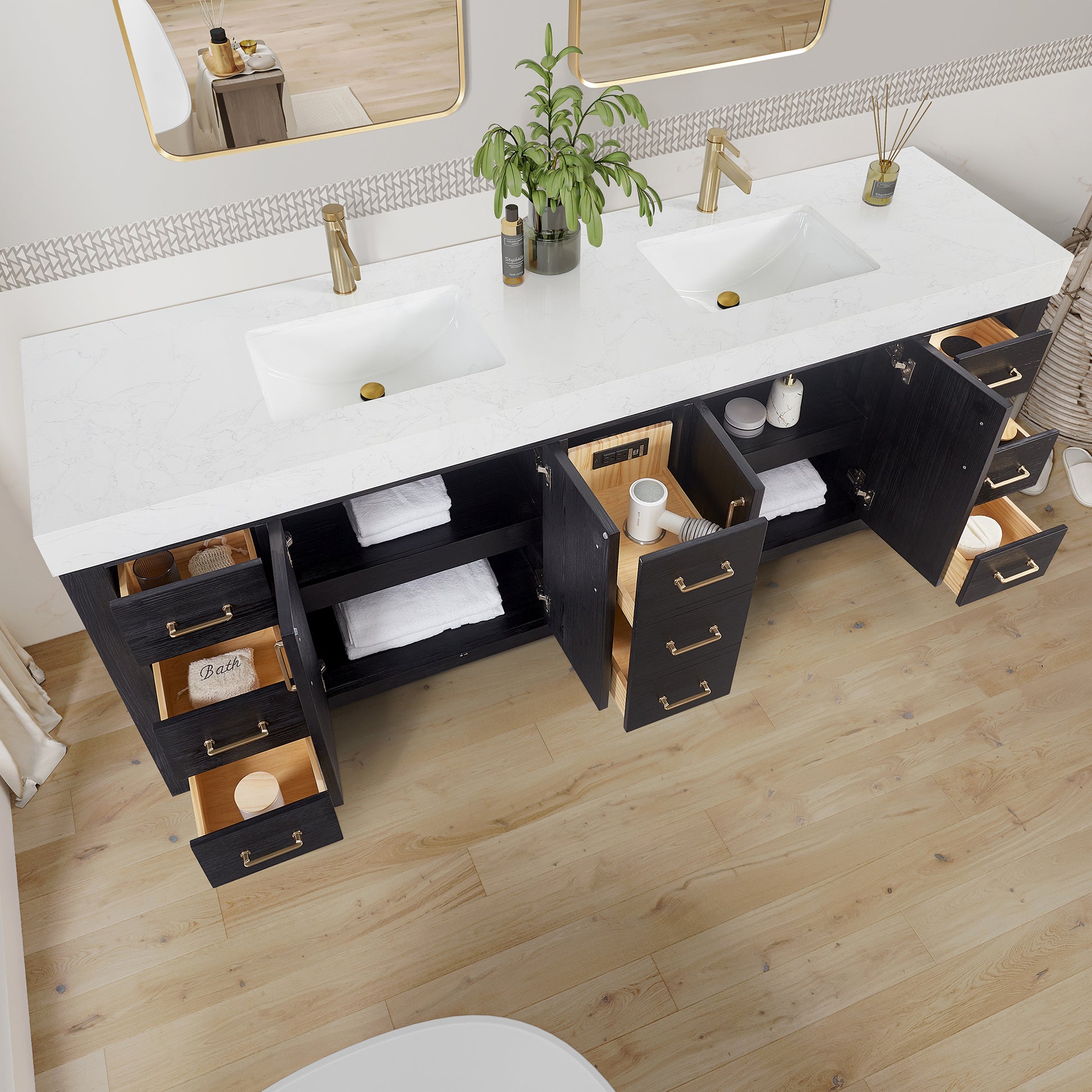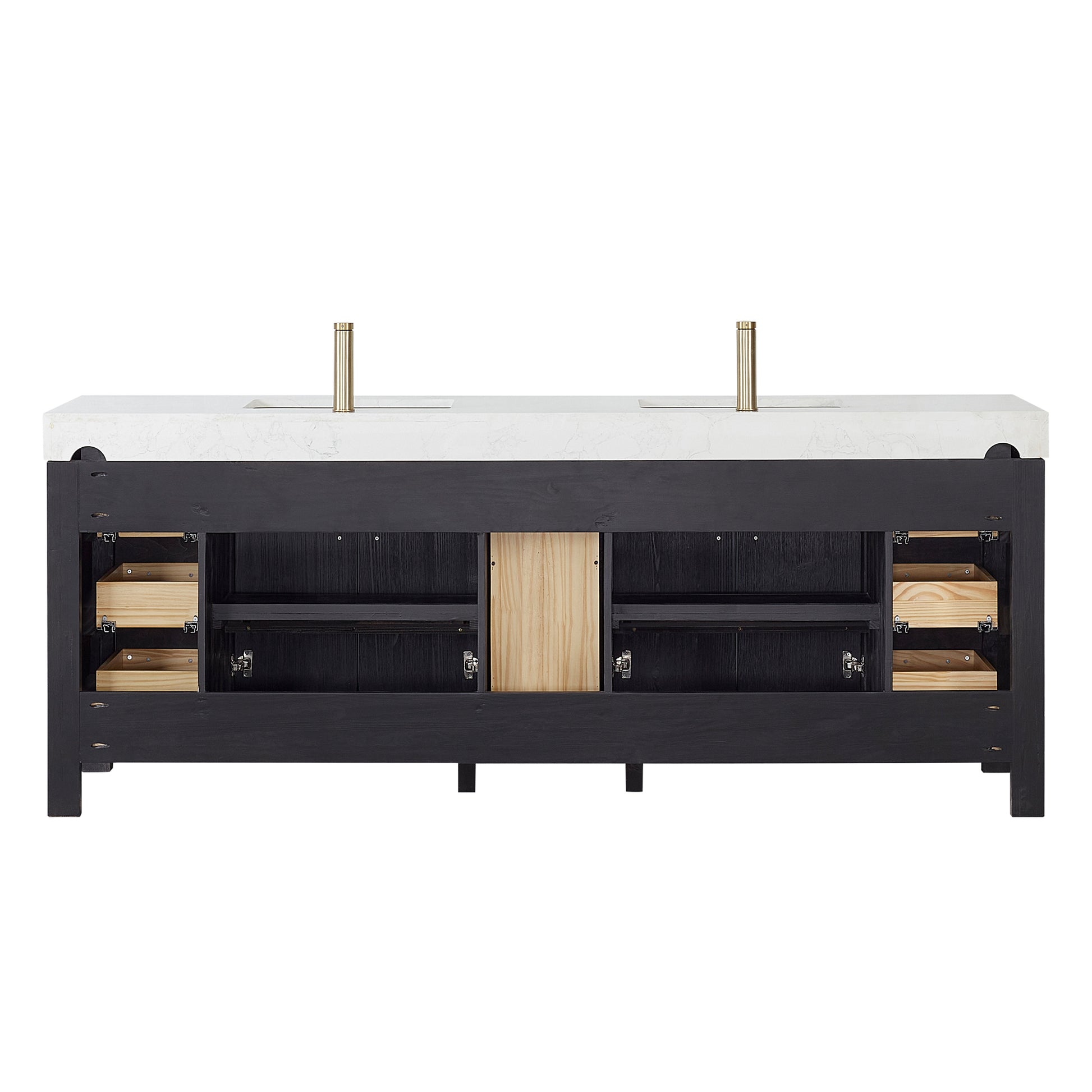 Vinnova, León 84in. Free-standing Double Bathroom Vanity in Fir Wood Black with Composite top in Lightning White and Mirror