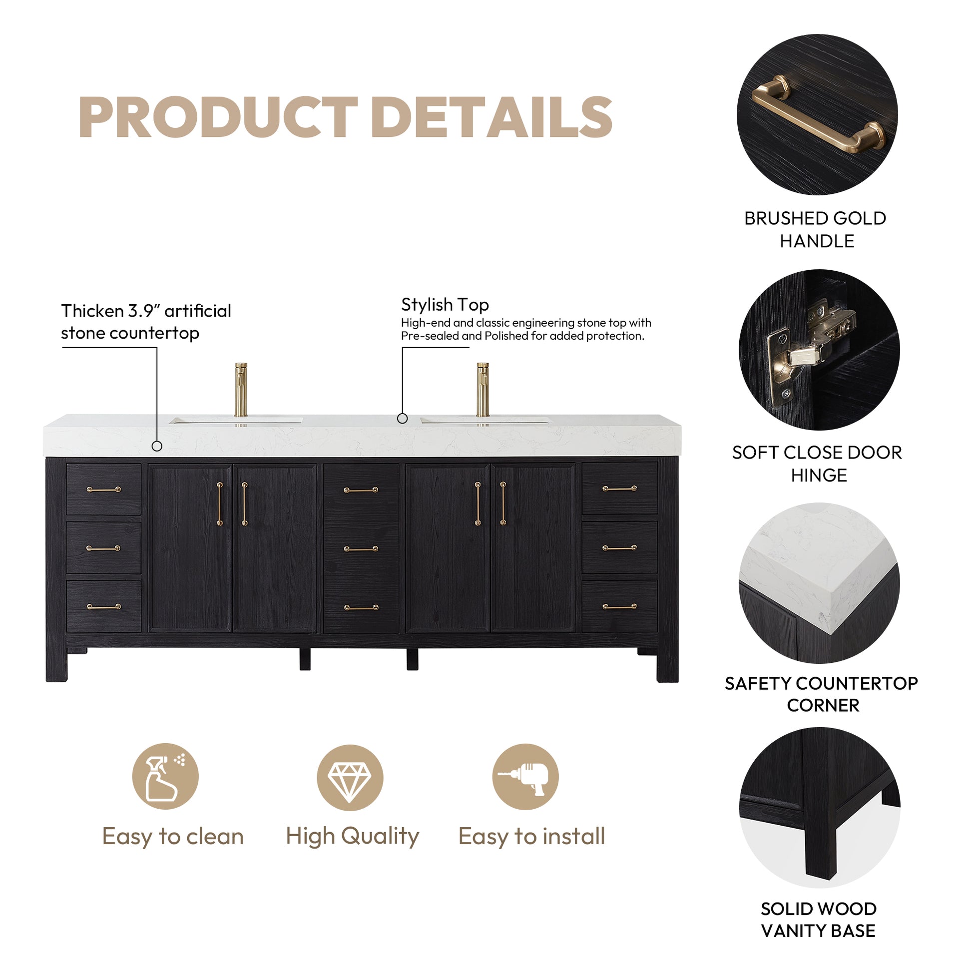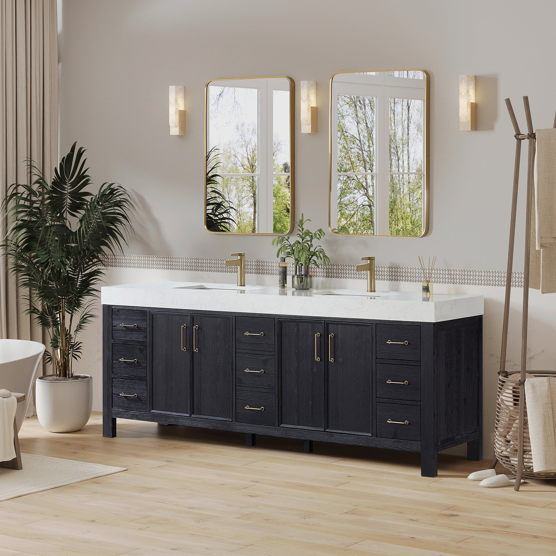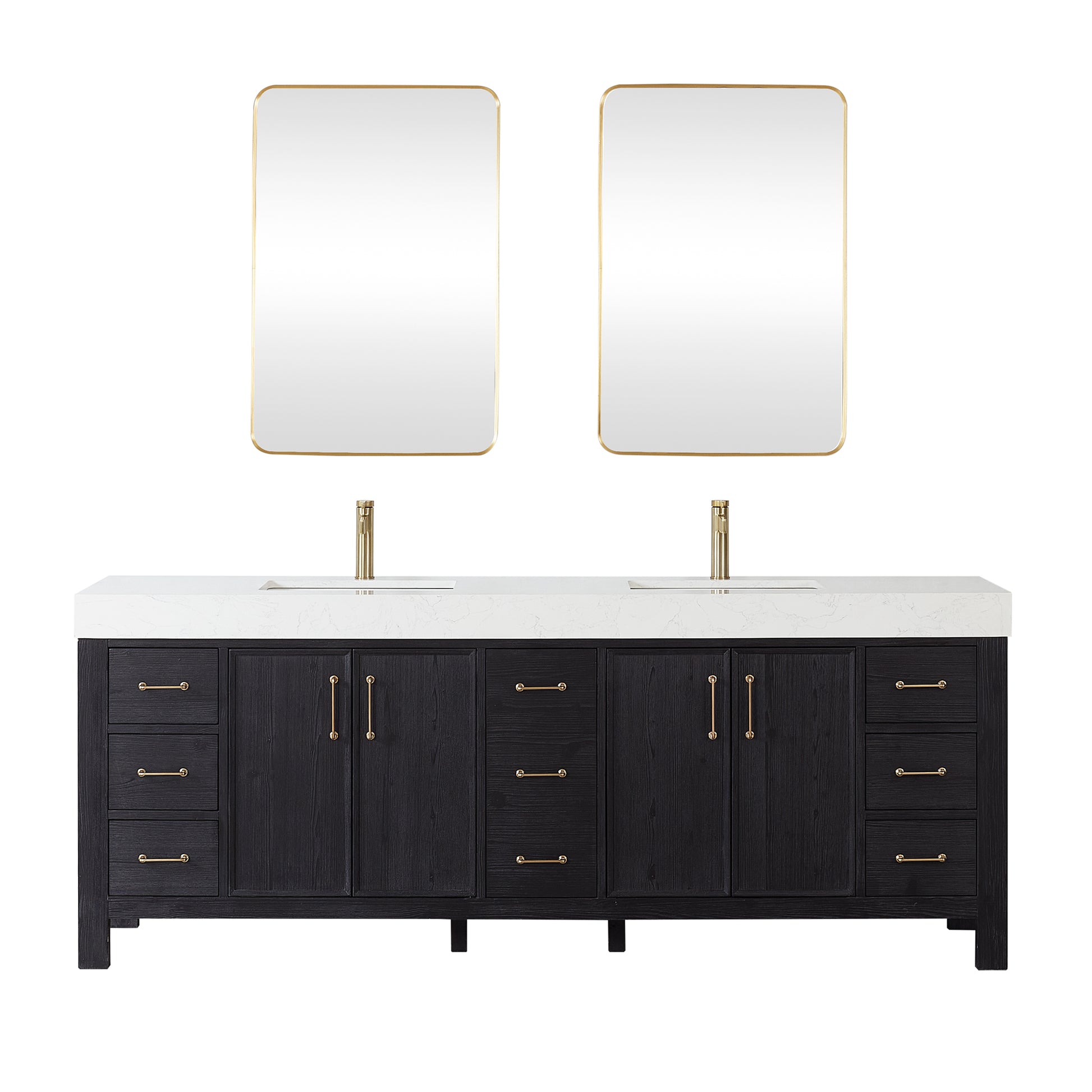 Upgrade your bathroom with the León 84in. Free-standing Double Bathroom Vanity in Fir Wood Black with Composite top in Lightning White and Mirror today.