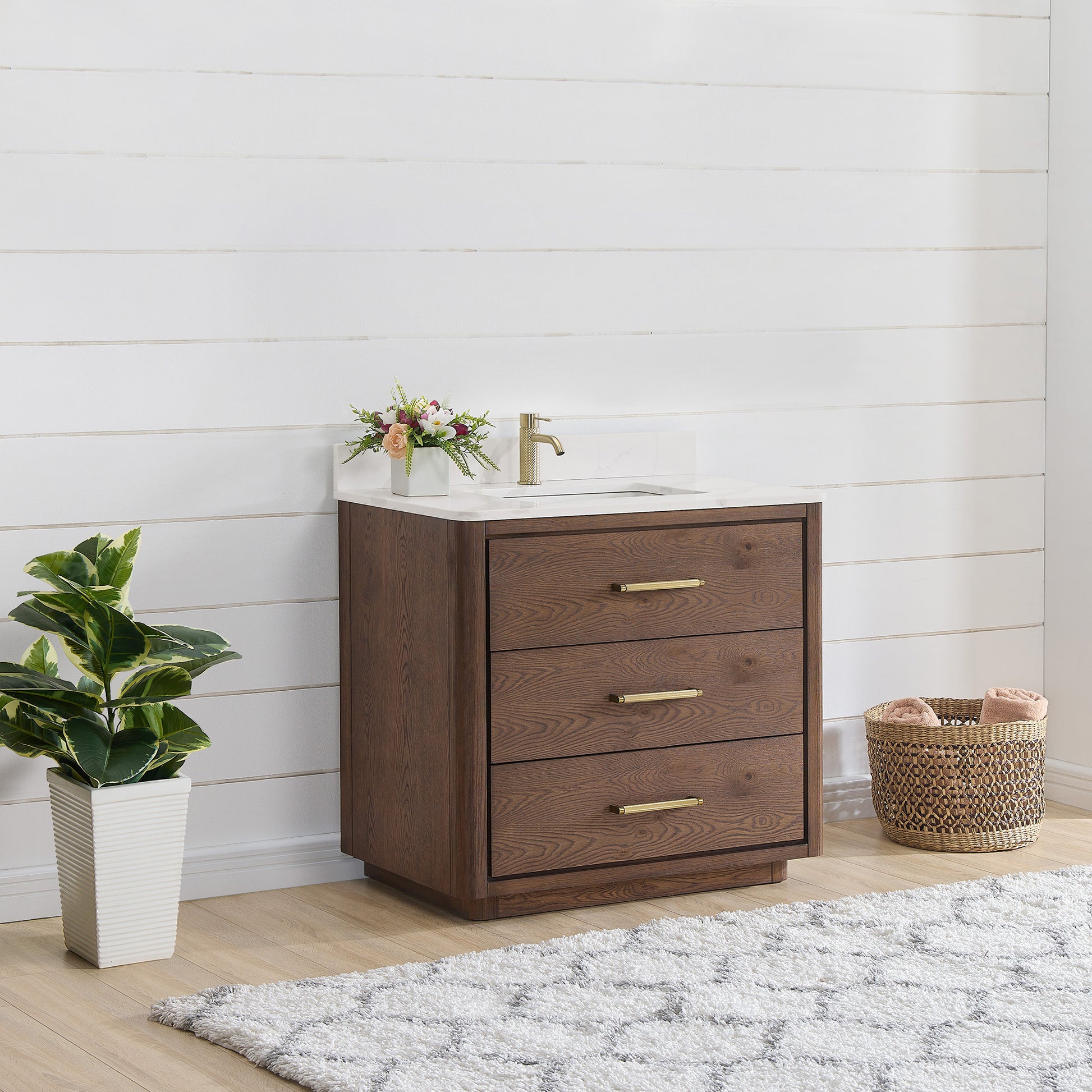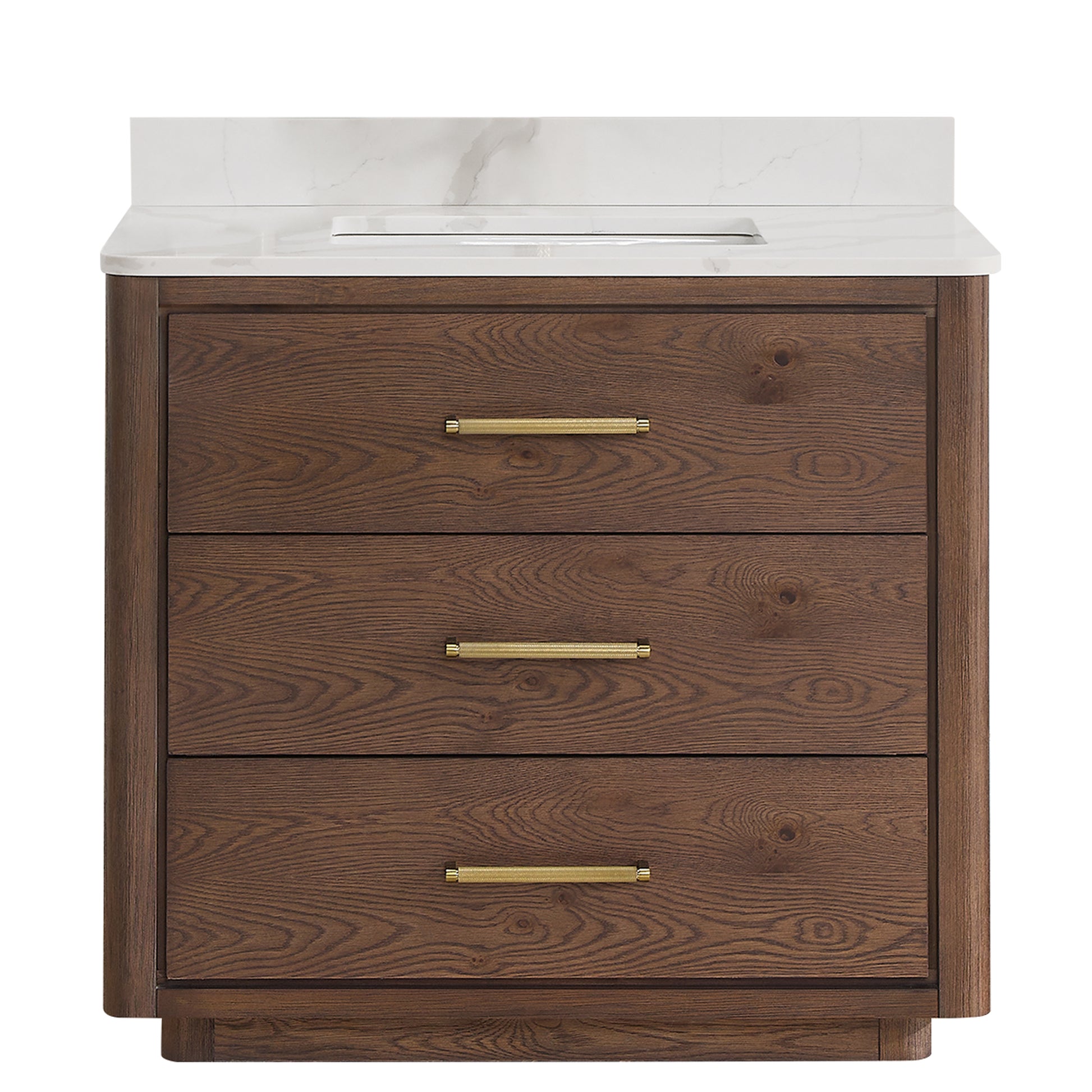 Vinnova, Porto 36" Free-standing Single Bath Vanity in Aged Dark Brown Oak with Fish Maw White Quartz Stone Top