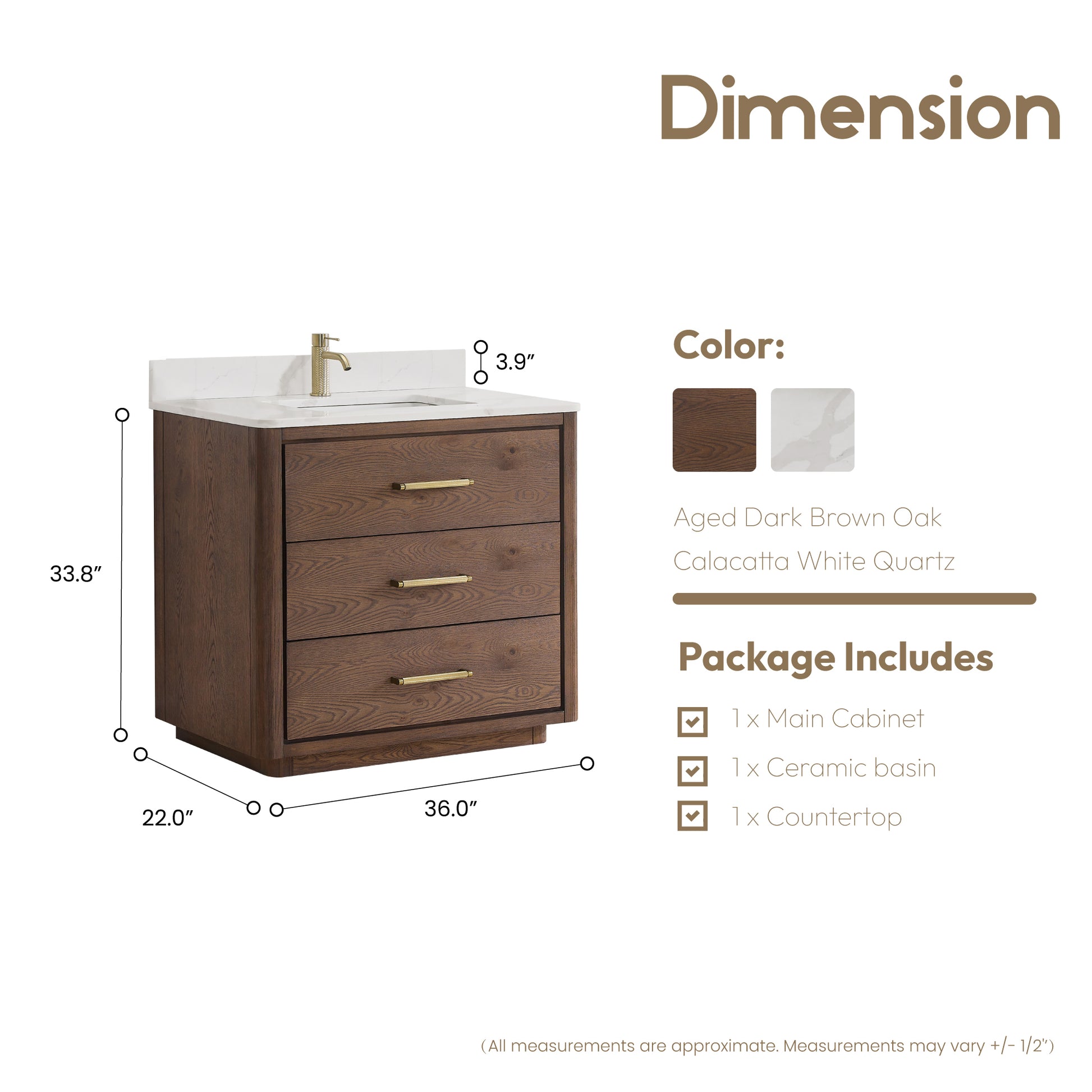 Description: The Porto 36 Free-standing Single Bath Vanity in Aged Dark Brown Oak with Fish Maw White Quartz Stone Top is a luxurious addition to any bathroom. Its elegant design and high-quality materials make it a standout piece that will enhance the overall look of your space.