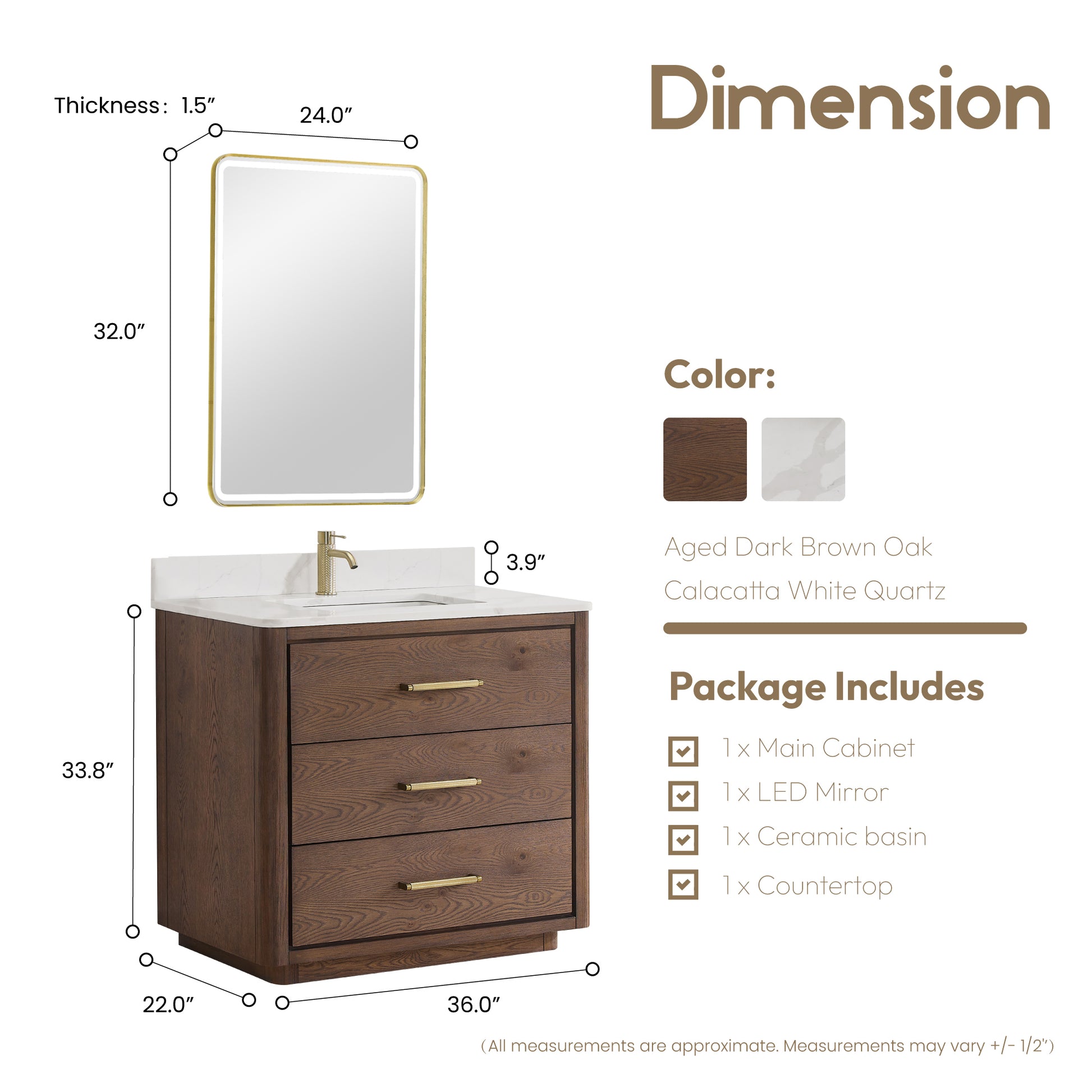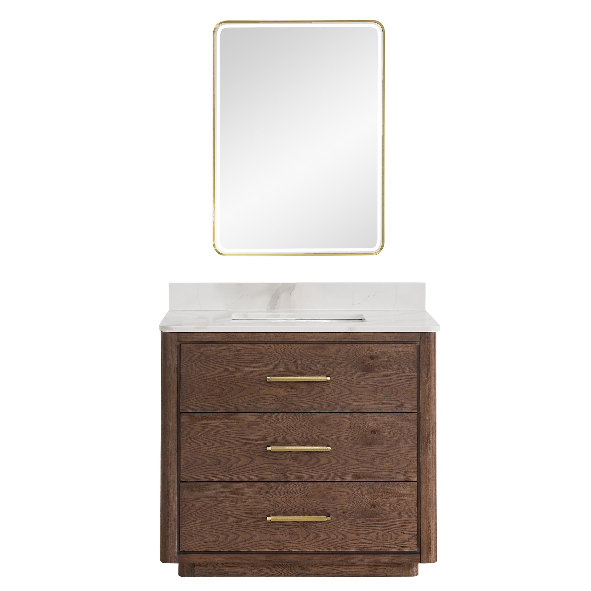Elevate your bathroom with the sophisticated "Porto 36" Free-standing Single Bath Vanity in Aged Dark Brown Oak with Fish Maw White Quartz Stone Top and Mirror. This stunning set combines elegance and functionality to create a stylish focal point in any bathroom.