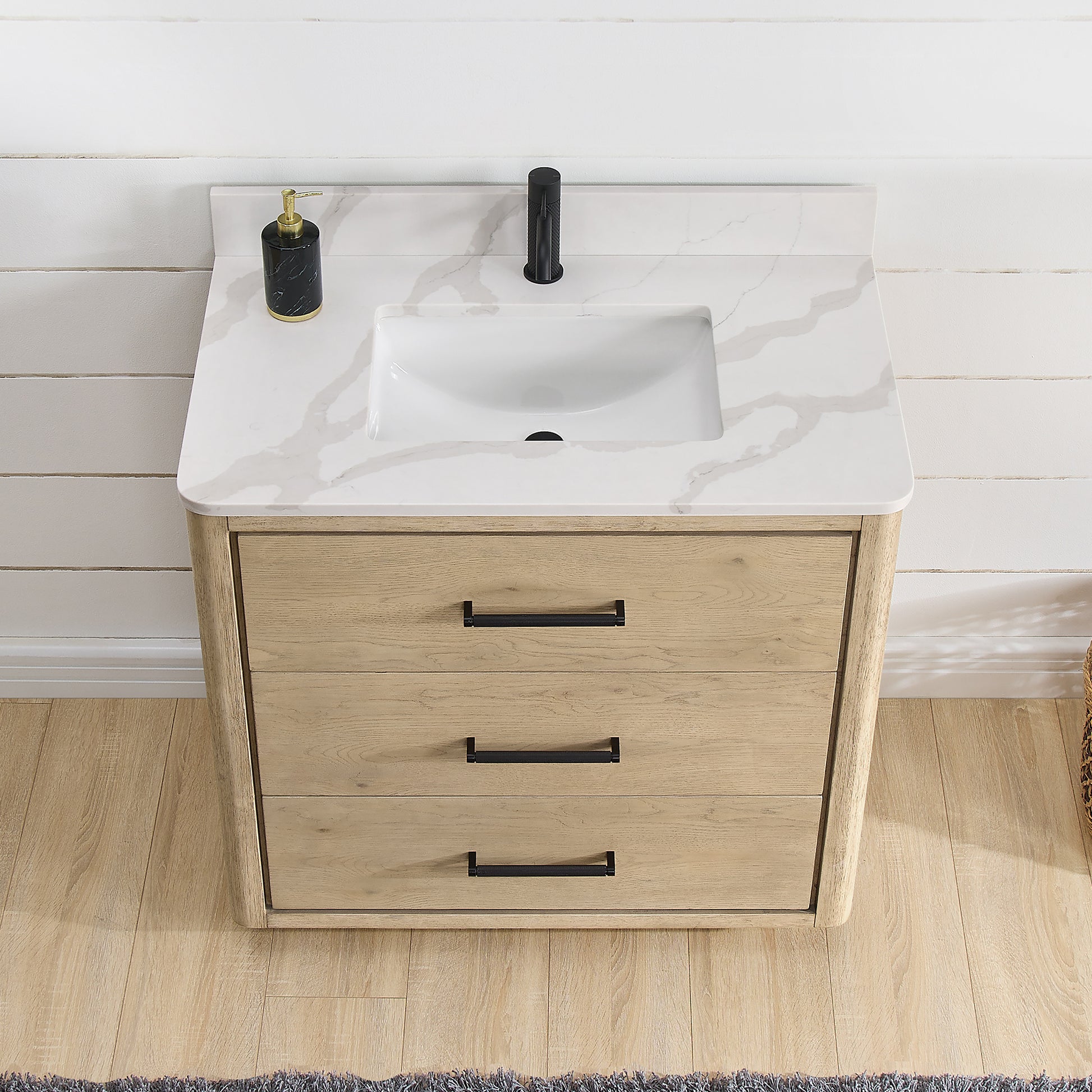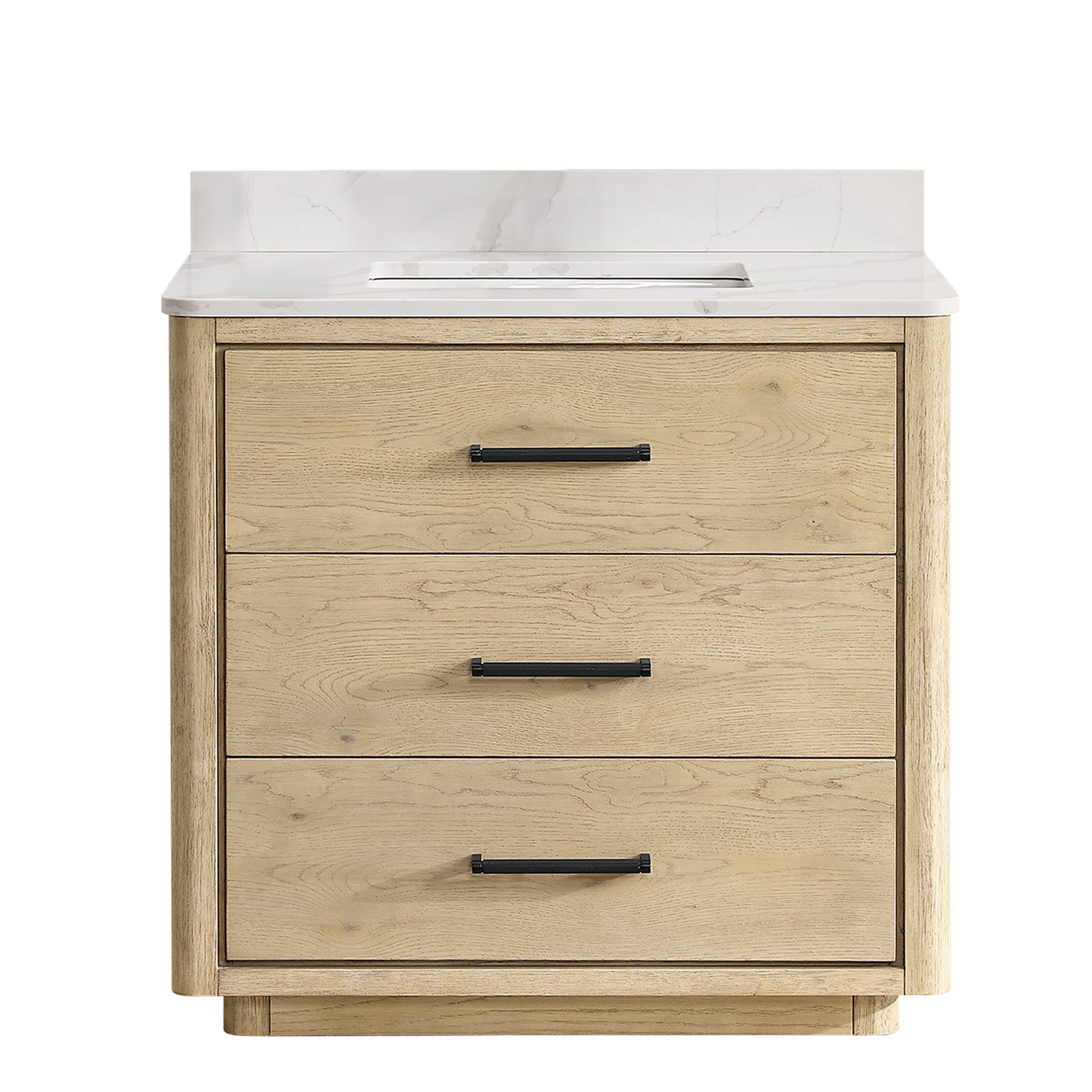 Vinnova, Porto 36" Free-standing Single Bath Vanity in Aged Natural Oak with Fish Maw White Quartz Stone Top