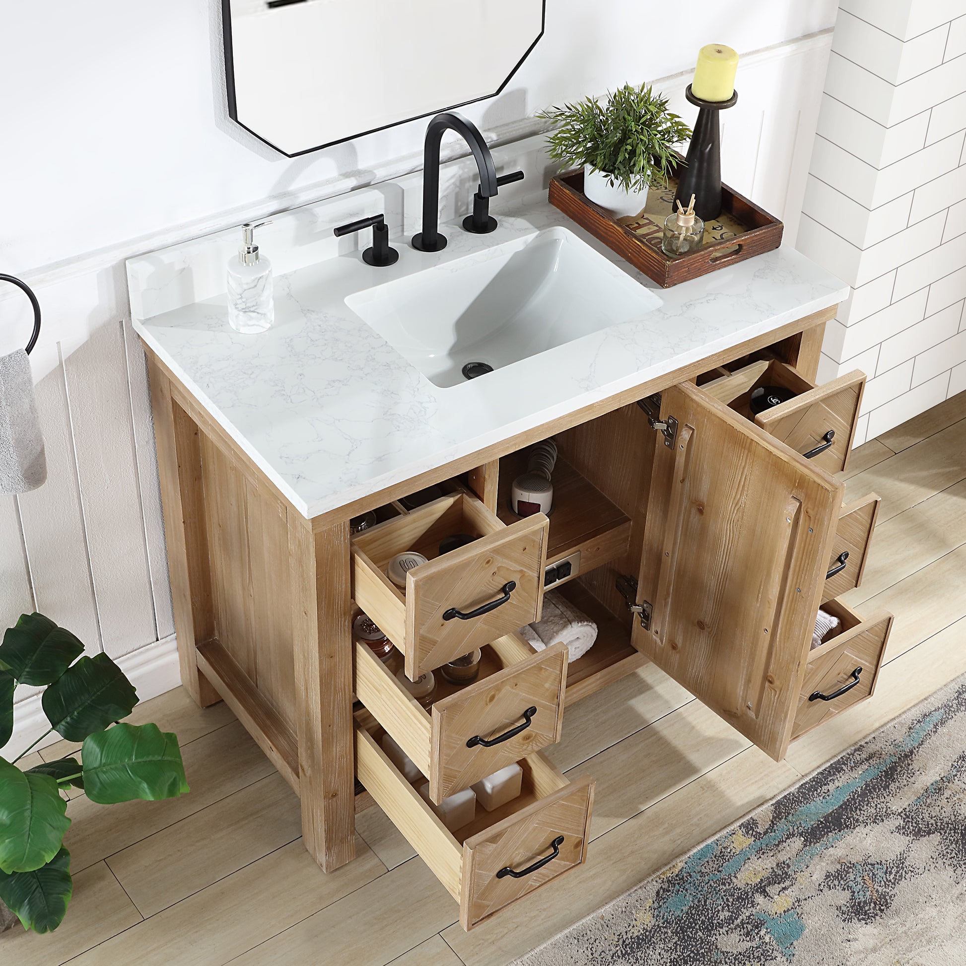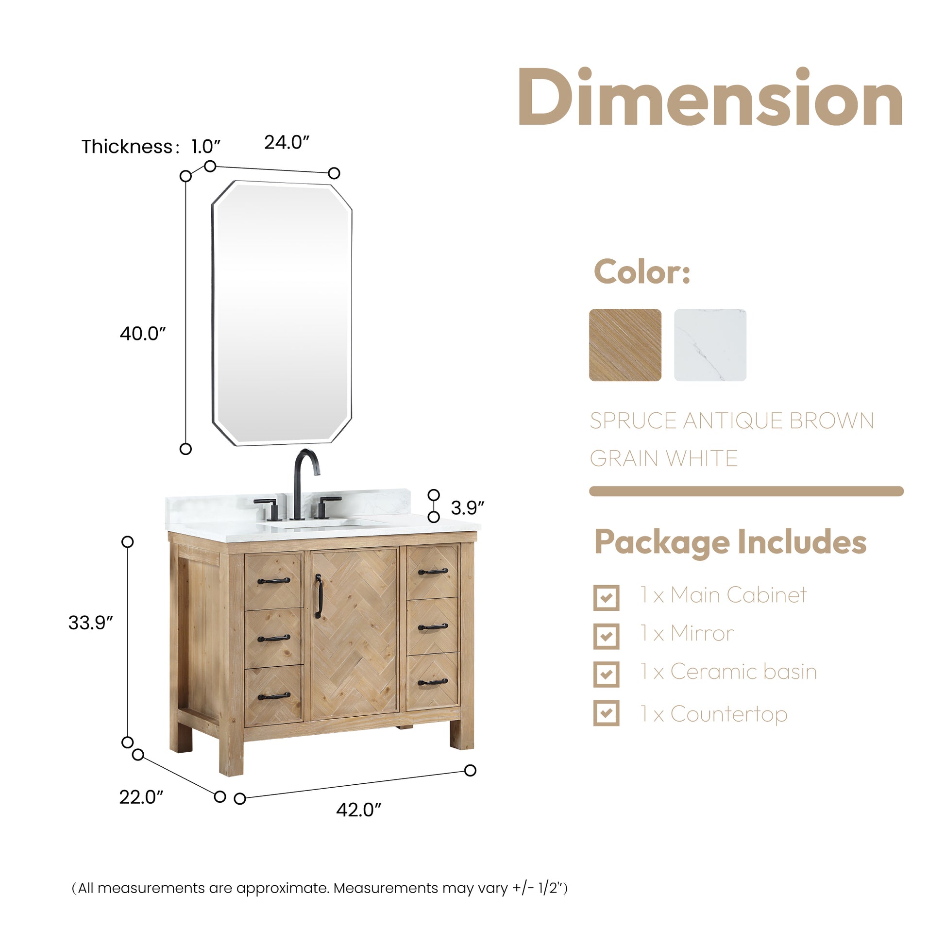 Upgrade your bathroom with the Javier 42 Free-standing Single Bath Vanity in Spruce Antique Brown with White Grain Composite Stone Top and Mirror today!