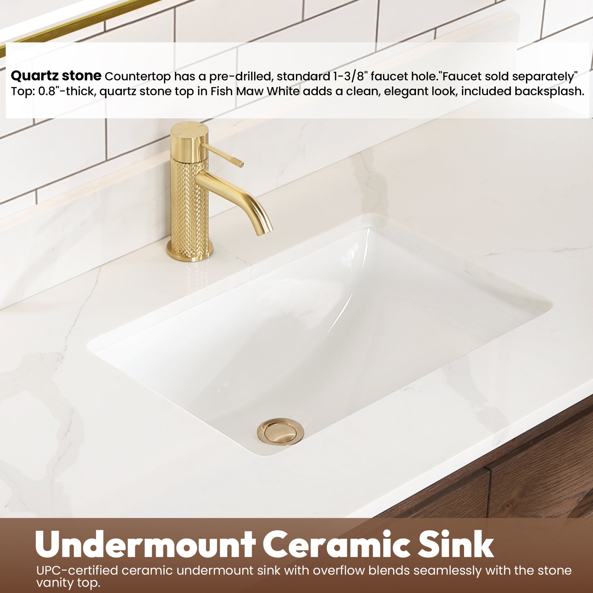 Upgrade your bathroom with the Cristo 48 Floating Single Bath Vanity in Aged Dark Brown Oak with Fish Maw White Quartz Stone Top and Mirror today!