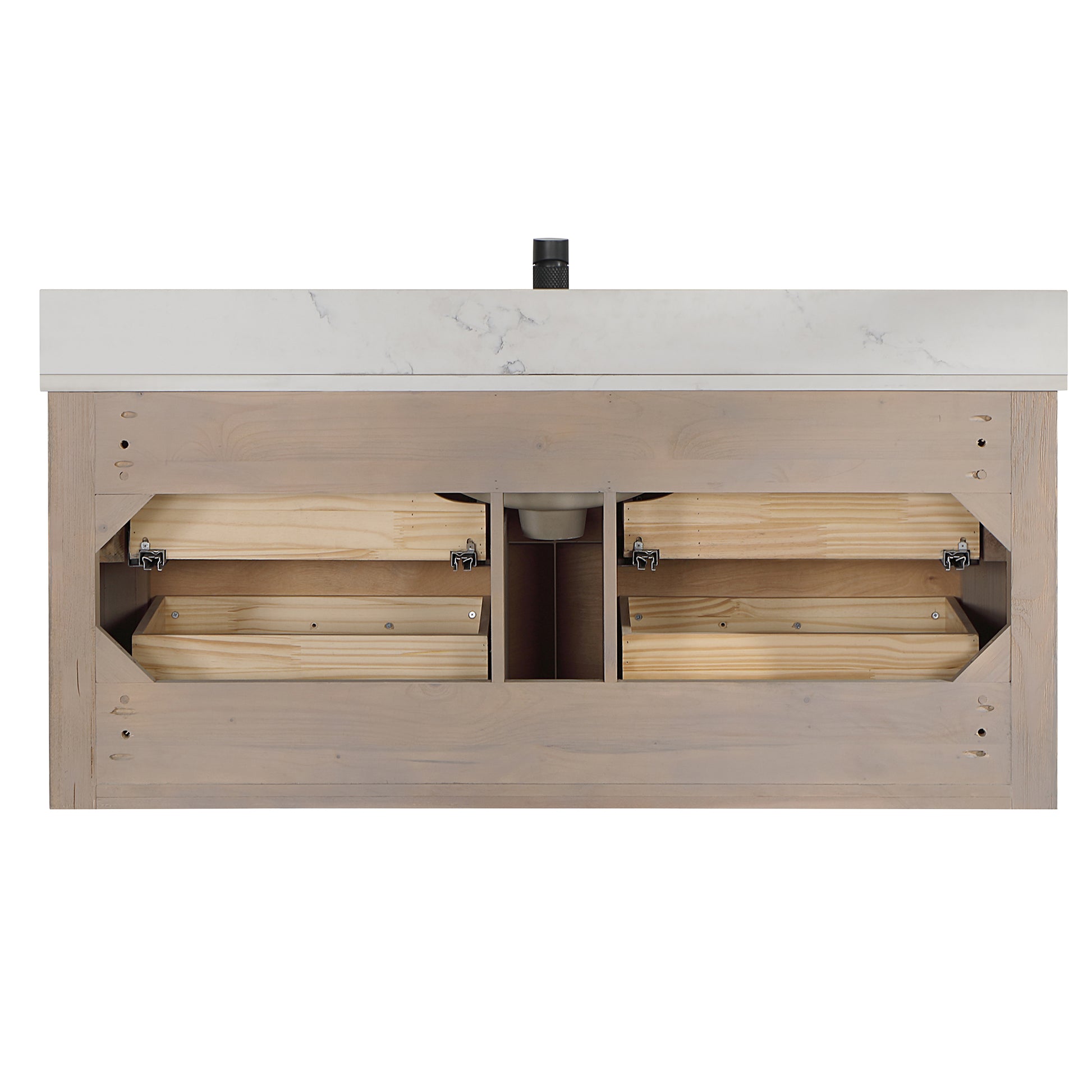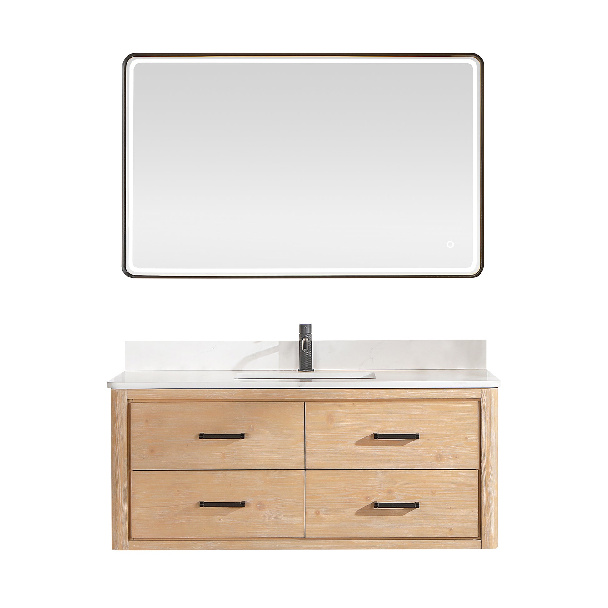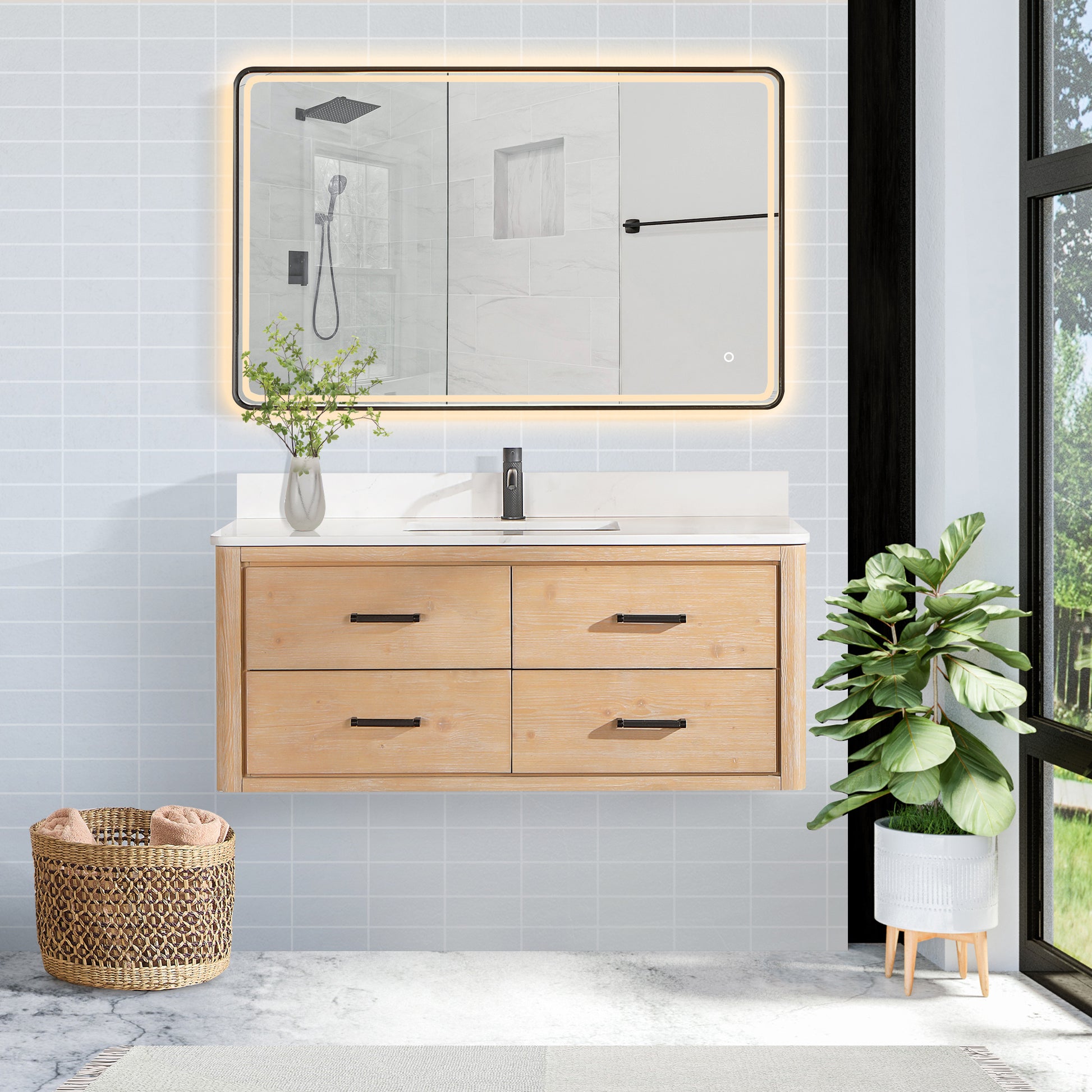 Vinnova, Cristo 48" Floating Single Bath Vanity in Fir Wood Brown with Fish Maw White Quartz Stone Top and Mirror