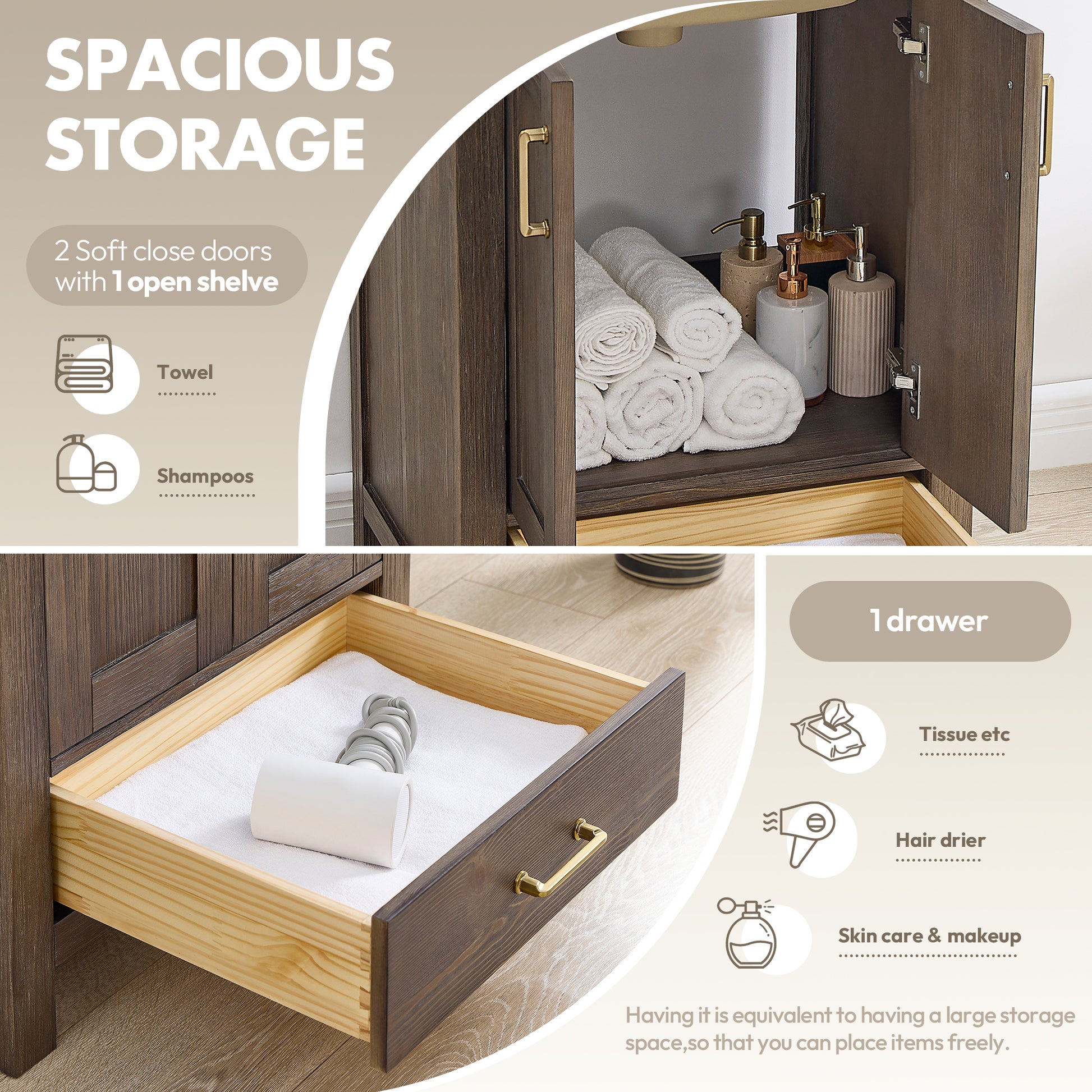 Transform your bathroom into a luxurious retreat with the Gela 24 Single Sink Bath Vanity in Spruce Vintage Brown. Featuring a stunning white ceramic basin, this vanity adds a touch of elegance to any space while providing ample storage for all your essentials.