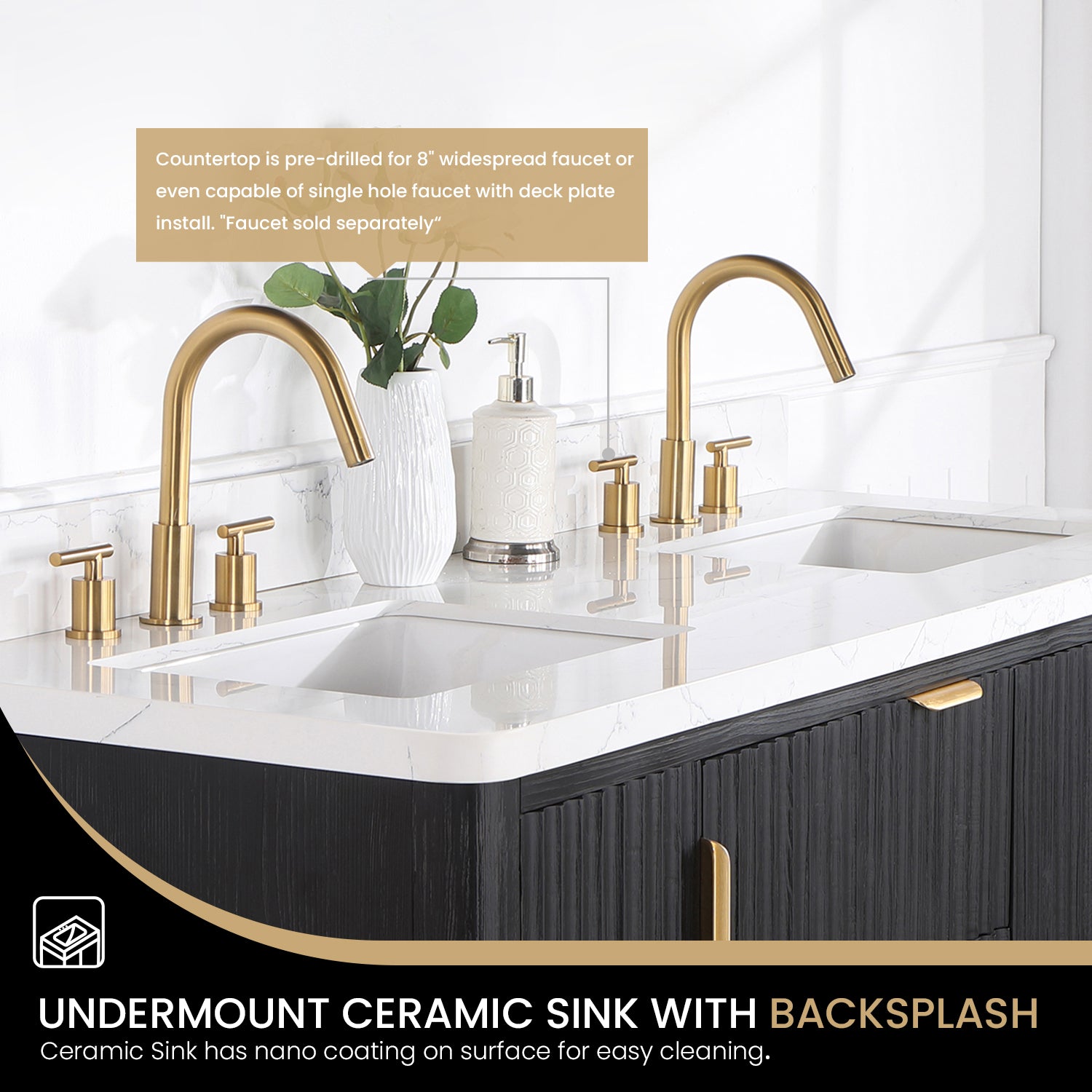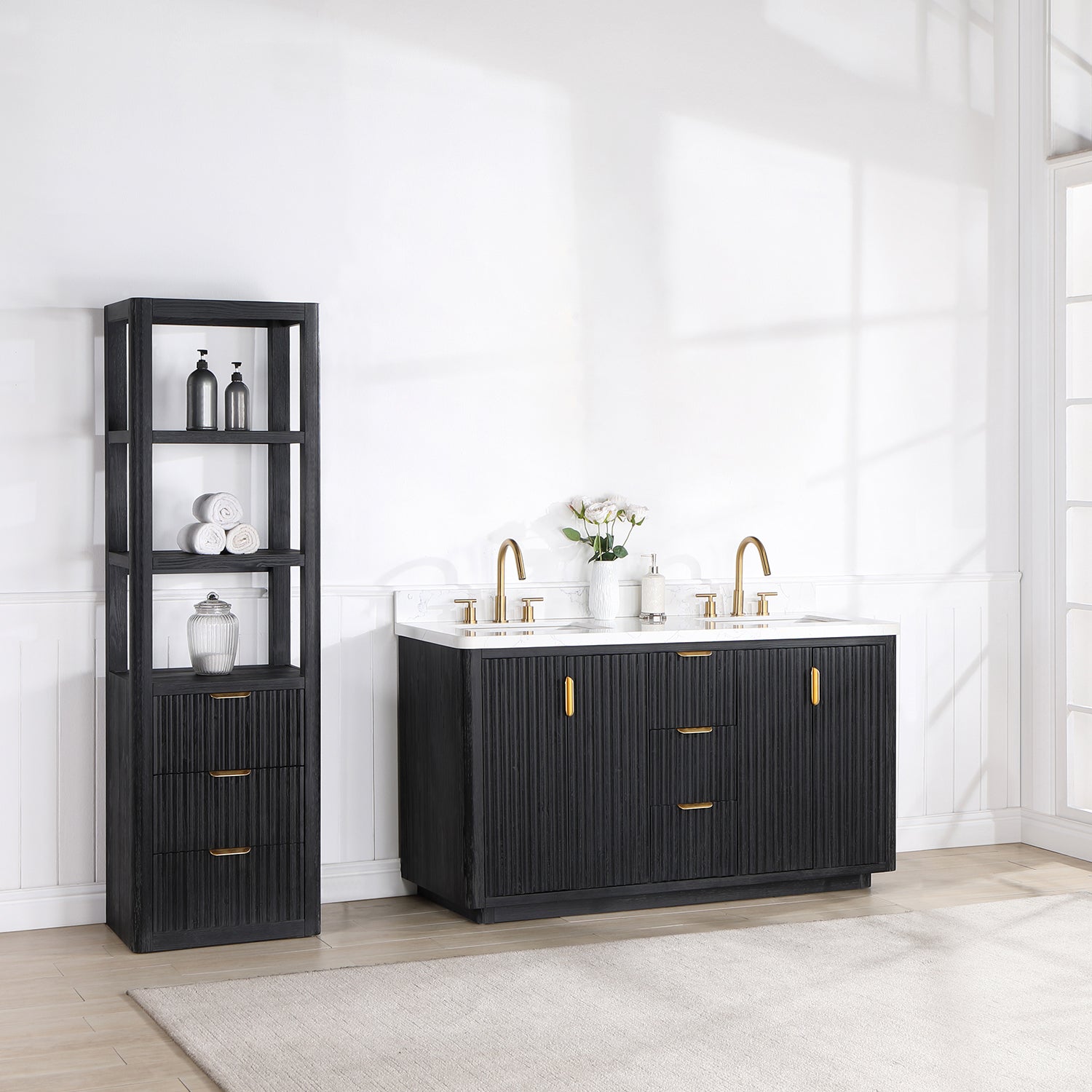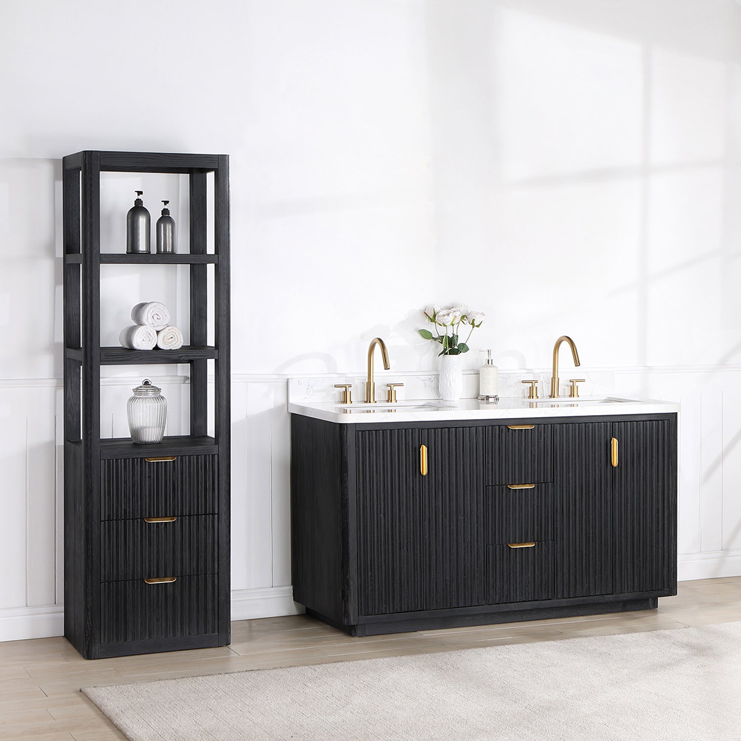 Elevate your bathroom décor with the stunning Cádiz 60in. Free-standing Double Bathroom Vanity. Crafted with premium fir wood in a sleek black finish, this vanity features a beautiful Lightning White composite top that adds a touch of elegance to any space.