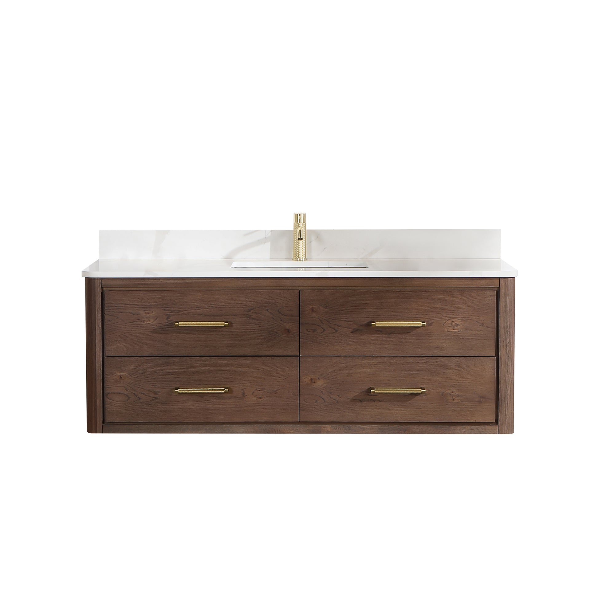 Vinnova, Cristo 55" Floating Single Bath Vanity in Aged Dark Brown Oak with Fish Maw White Quartz Stone Top