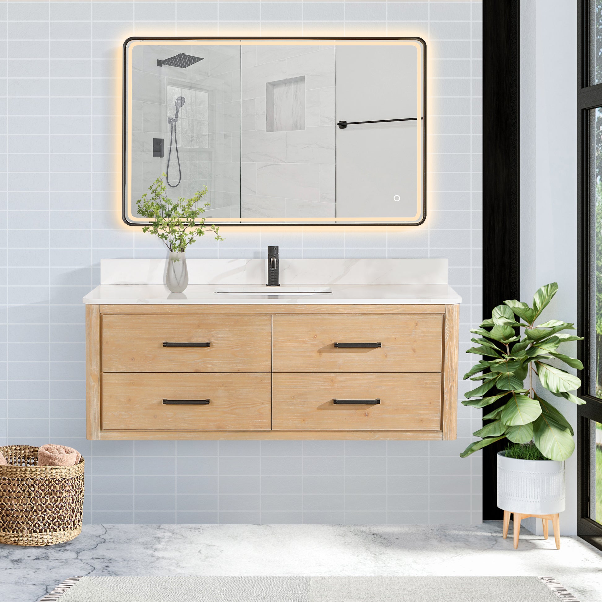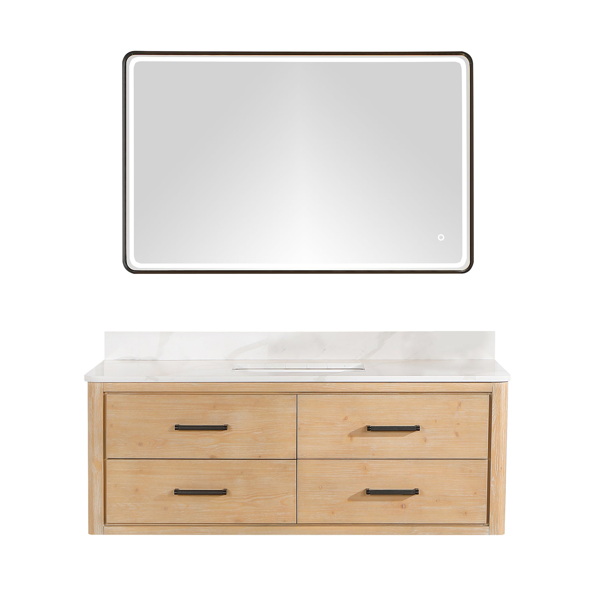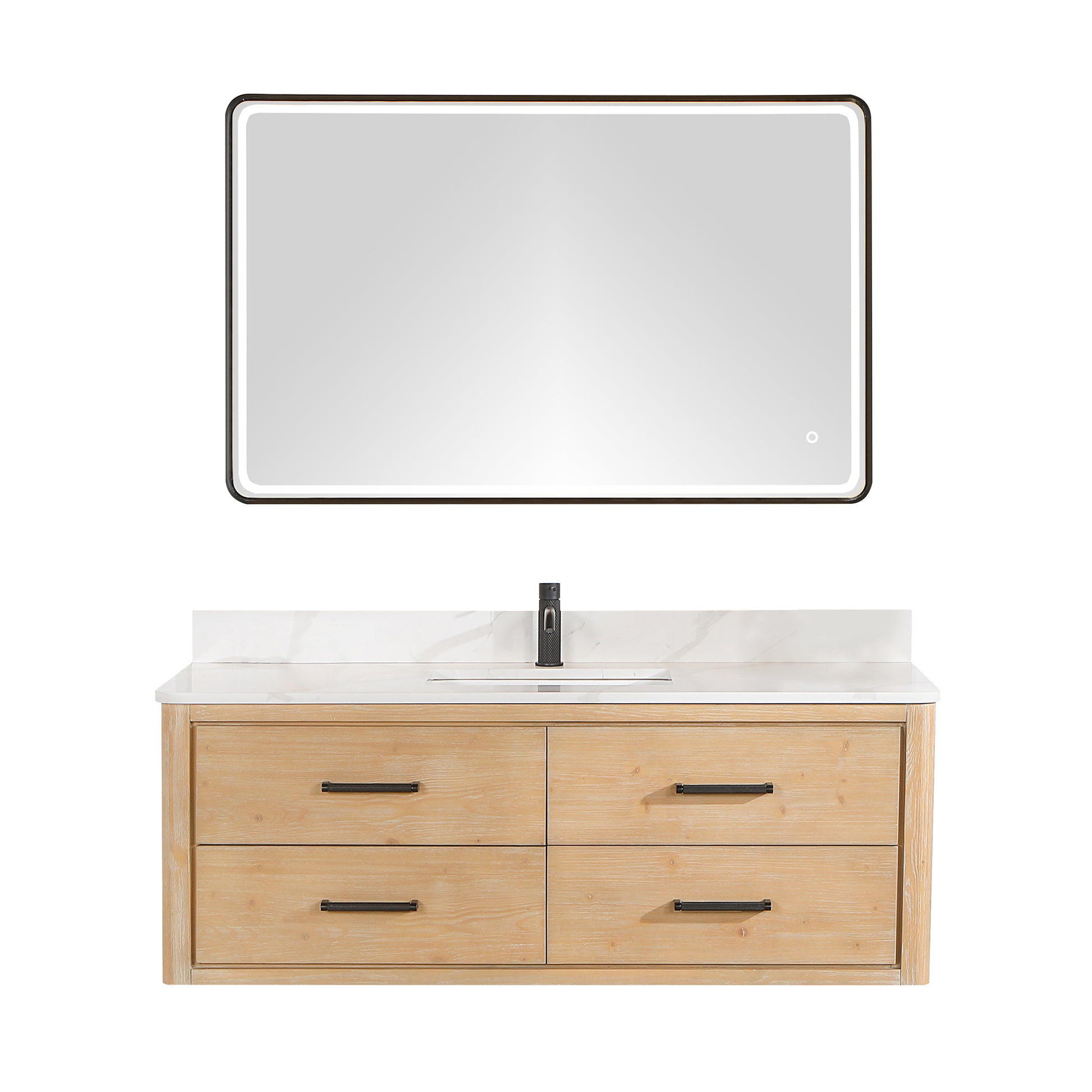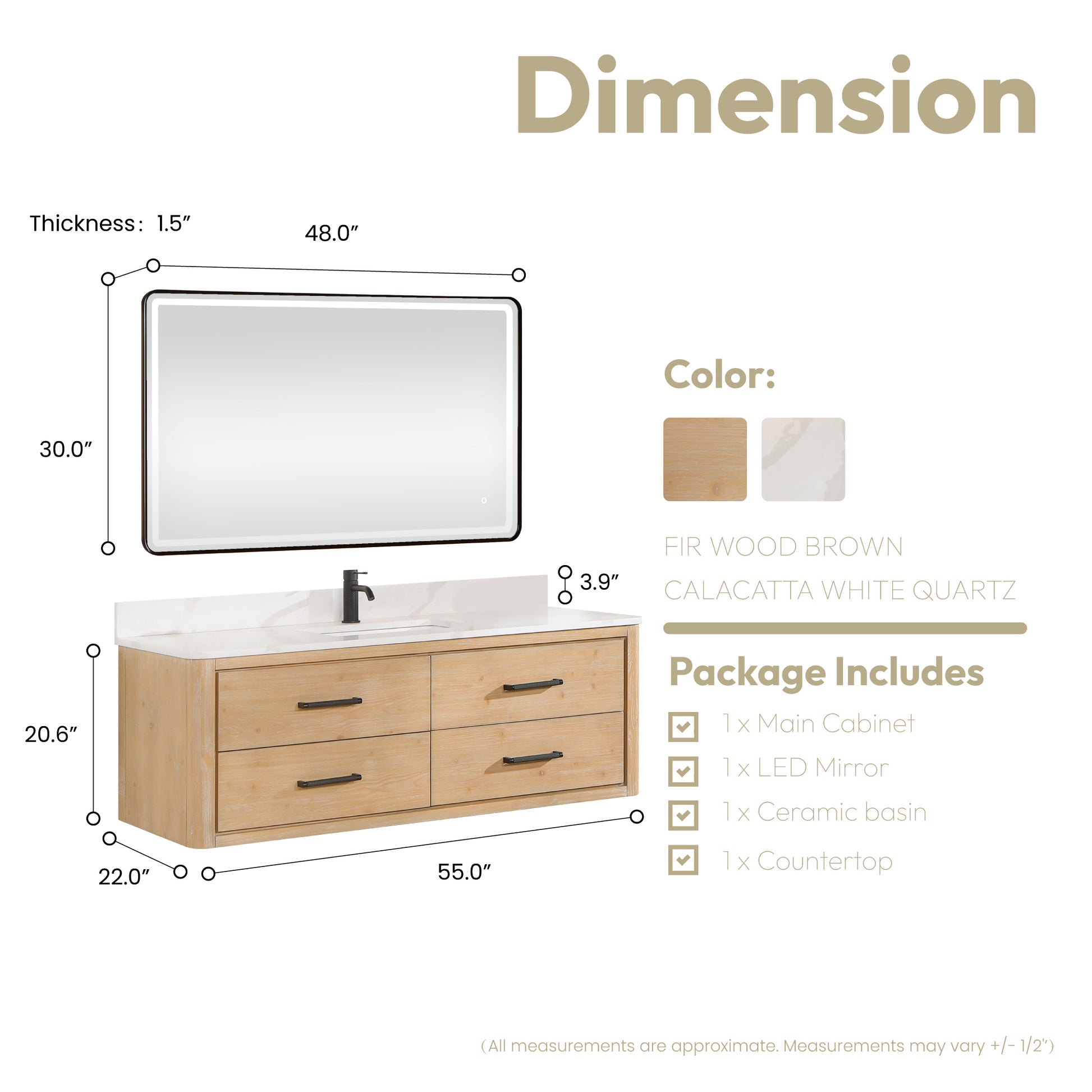 Vinnova, Cristo 55" Floating Single Bath Vanity in Fir Wood Brown with Fish Maw White Quartz Stone Top and Mirror